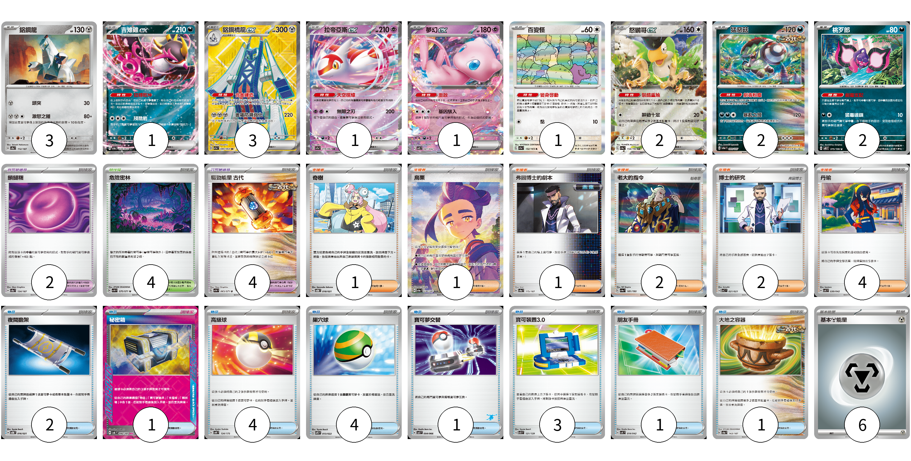 牌組構築方案 以此牌組為基礎新構築牌組 顯示卡面 顯示列表 寶可夢卡(16) 3 1 3 1 1 1 2 2 2 寶可夢道具(6) 2 4 物品卡(17) 2 1 4 4 1 3 1 1 支援者卡(11) 1 1 1 2 2 4 競技場卡(4) 4 能量卡(6) 6 寶可夢卡(16) 卡牌名稱 張數 卡牌名稱 張數 鋁鋼龍 SV8a 112/187 03 吉雉雞ex SV6a 038/064 01 鋁鋼橋龍ex SV7a 080/064 03 拉帝亞斯ex SV7a 019/064 01 夢幻ex SVK 001/042 01 百變怪 SV2a 132/165 01 怒鸚哥ex SV4a 154/190 02 猛惡菇 SV8a 099/187 02 桃歹郎 SV8 075/106 02 寶可夢道具(6) 卡牌名稱 張數 卡牌名稱 張數 鎖鏈糬 SV8a 154/187 02 驅勁能量 古代 SV5K 065/071 04 物品卡(17) 卡牌名稱 張數 卡牌名稱 張數 夜間擔架 SVOM 016/021 02 秘密箱 SV6 092/101 01 高級球 SVM 134/175 04 巢穴球 SVTS 013/022 04 寶可夢交替 SVI 054/066 01 寶可裝置3.0 SVD 121/139 03 朋友手冊 SVK 014/042 01 大地之容器 SV8a 143/187 01 支援者卡(11) 卡牌名稱 張數 卡牌名稱 張數 奇樹 SVOM 018/021 01 烏栗 SV8a 230/187 01 弗圖博士的劇本 SV8a 175/187 01 老大的指令 SV4a 181/190 02 博士的研究(弗圖博士) SVC 021/021 02 丹瑜 SVK 030/042 04 競技場卡(4) 卡牌名稱 張數 卡牌名稱 張數 危險密林 SV5K 070/071 04 能量卡(6) 卡牌名稱 張數 卡牌名稱 張數 基本【鋼】能量 SVTH MET 06 以此牌組為基礎新構築牌組 牌組編碼 qZAnqp-NZHvdb-HJbiQh copy 列印牌組單 牌組編碼已複製 分享至SNS