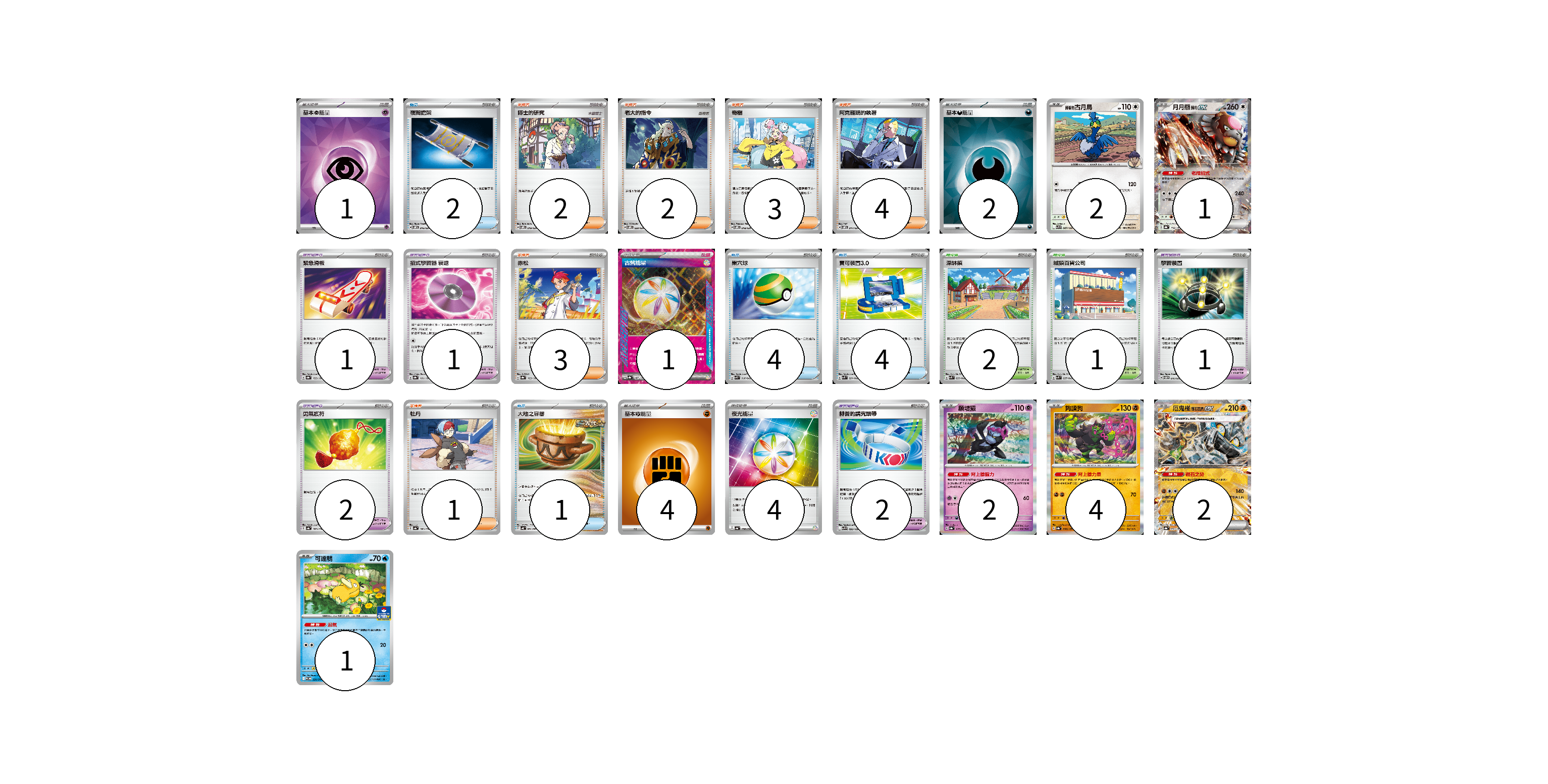 牌組構築方案 以此牌組為基礎新構築牌組 顯示卡面 顯示列表 寶可夢卡(12) 2 1 2 4 2 1 寶可夢道具(7) 1 1 1 2 2 物品卡(11) 2 4 4 1 支援者卡(15) 2 2 3 4 3 1 競技場卡(3) 2 1 能量卡(12) 1 2 1 4 4 寶可夢卡(12) 卡牌名稱 張數 卡牌名稱 張數 赫普的古月鳥 SV9 087/100 02 月月熊 赫月ex SV8a 134/187 01 願增猿 SV8a 075/187 02 夠讚狗 SV8a 090/187 04 厄鬼椪 礎石面具ex SV8a 091/187 02 可達鴨 SV-P 220/SV-P 01 寶可夢道具(7) 卡牌名稱 張數 卡牌名稱 張數 緊急滑板 SV8a 153/187 01 招式學習器 衰退 SV8a 161/187 01 學習裝置 SVTM 016/022 01 勇氣護符 SV4a 169/190 02 赫普的講究頭帶 SV9 092/100 02 物品卡(11) 卡牌名稱 張數 卡牌名稱 張數 夜間擔架 SVOM 016/021 02 巢穴球 SVK 016/042 04 寶可裝置3.0 SVK 021/042 04 大地之容器 SV4K 060/066 01 支援者卡(15) 卡牌名稱 張數 卡牌名稱 張數 博士的研究 SVOM 019/021 02 老大的指令 SVOM 020/021 02 奇樹 SVOM 018/021 03 阿克羅瑪的執著 SVOM 017/021 04 赤松 SV8a 163/187 03 牡丹 SV4a 182/190 01 競技場卡(3) 卡牌名稱 張數 卡牌名稱 張數 深缽鎮 SVK 039/042 02 城鎮百貨公司 SVK 037/042 01 能量卡(12) 卡牌名稱 張數 卡牌名稱 張數 基本【超】能量 SVOD PSY 01 基本【惡】能量 SVOM DAR 02 古舊能量 SV8a 187/187 01 基本【鬥】能量 SVTG FIG 04 夜光能量 SV4a 190/190 04 以此牌組為基礎新構築牌組 牌組編碼 qZmLGG-OOwitk-FFtCen copy 列印牌組單 牌組編碼已複製 分享至SNS