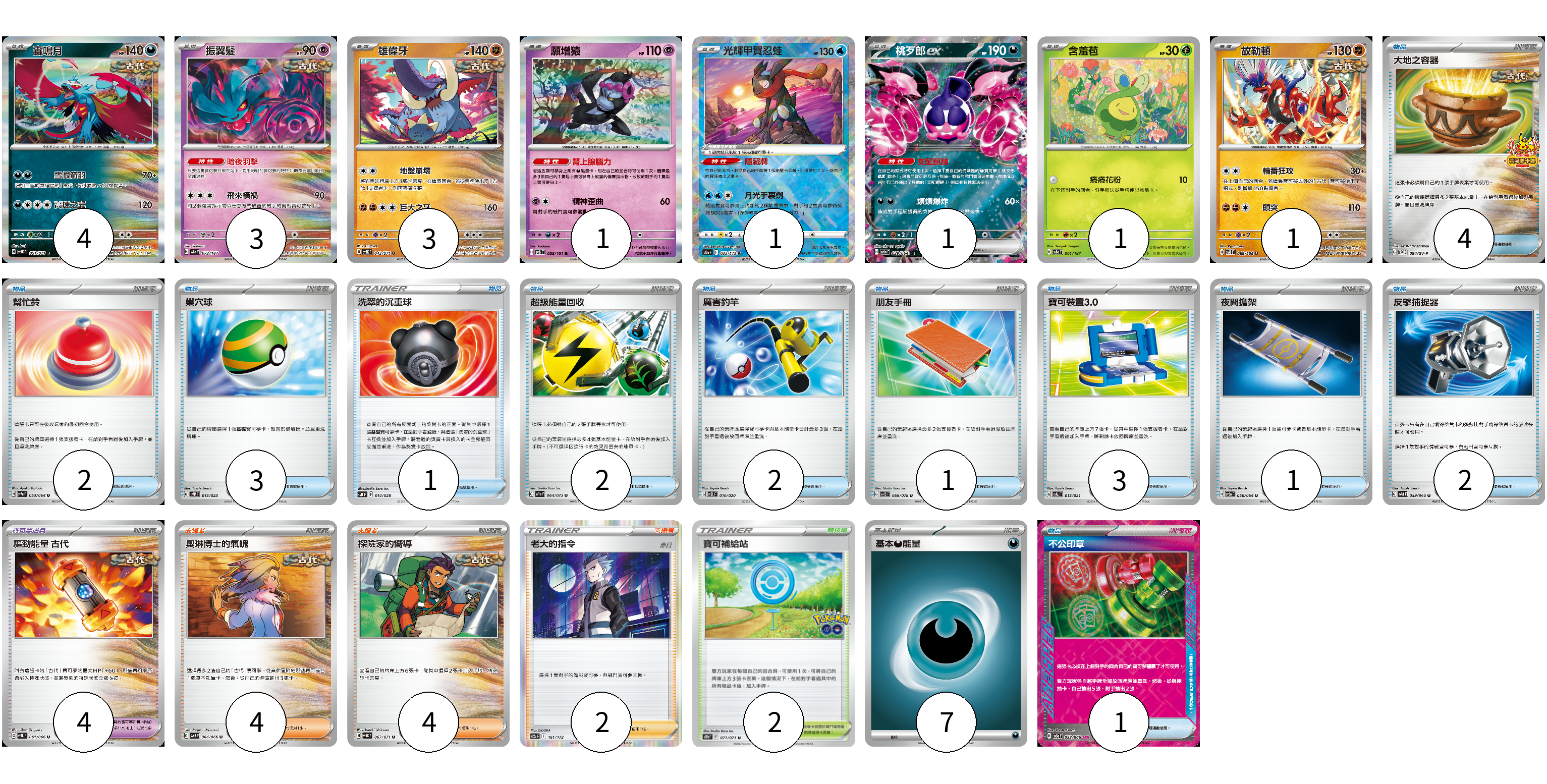 牌組構築方案 以此牌組為基礎新構築牌組 顯示卡面 顯示列表 寶可夢卡(17) 4 3 3 1 1 1 1 1 2 寶可夢道具(4) 4 物品卡(20) 4 2 3 1 2 1 3 1 2 1 支援者卡(10) 4 4 2 競技場卡(2) 2 能量卡(7) 7 寶可夢卡(17) 卡牌名稱 張數 卡牌名稱 張數 轟鳴月 SV5K 051/071 04 振翼髮 SV8a 072/187 03 雄偉牙 SV5K 042/071 03 願增猿 SV6 055/101 01 光輝甲賀忍蛙 S12a 033/172 01 桃歹郎ex SV6a 039/064 01 含羞苞 SV8a 001/187 01 故勒頓 SV8 069/106 01 厲害釣竿 SVEL 010/020 02 寶可夢道具(4) 卡牌名稱 張數 卡牌名稱 張數 驅勁能量 古代 SV4K 061/066 04 物品卡(20) 卡牌名稱 張數 卡牌名稱 張數 大地之容器 SV-P 084/SV-P 04 幫忙鈴 SV7a 053/064 02 巢穴球 SVAM 015/023 03 洗翠的沉重球 SVB 014/028 01 超級能量回收 SV1a 064/073 02 朋友手冊 SV1S 069/078 01 寶可裝置3.0 SVAL 015/021 03 夜間擔架 SV6a 056/064 01 反擊捕捉器 SV4M 059/066 02 不公印章 SV5a 053/066 01 支援者卡(10) 卡牌名稱 張數 卡牌名稱 張數 奧琳博士的氣魄 SV4K 064/066 04 探險家的嚮導 SV5K 067/071 04 老大的指令(赤日) S12a 161/172 02 競技場卡(2) 卡牌名稱 張數 卡牌名稱 張數 寶可補給站 S10b 071/071 02 能量卡(7) 卡牌名稱 張數 卡牌名稱 張數 基本【惡】能量 SVF DAR 07 以此牌組為基礎新構築牌組 牌組編碼 qhClaG-sFVPEY-ckqrMh copy 列印牌組單 牌組編碼已複製 分享至SNS