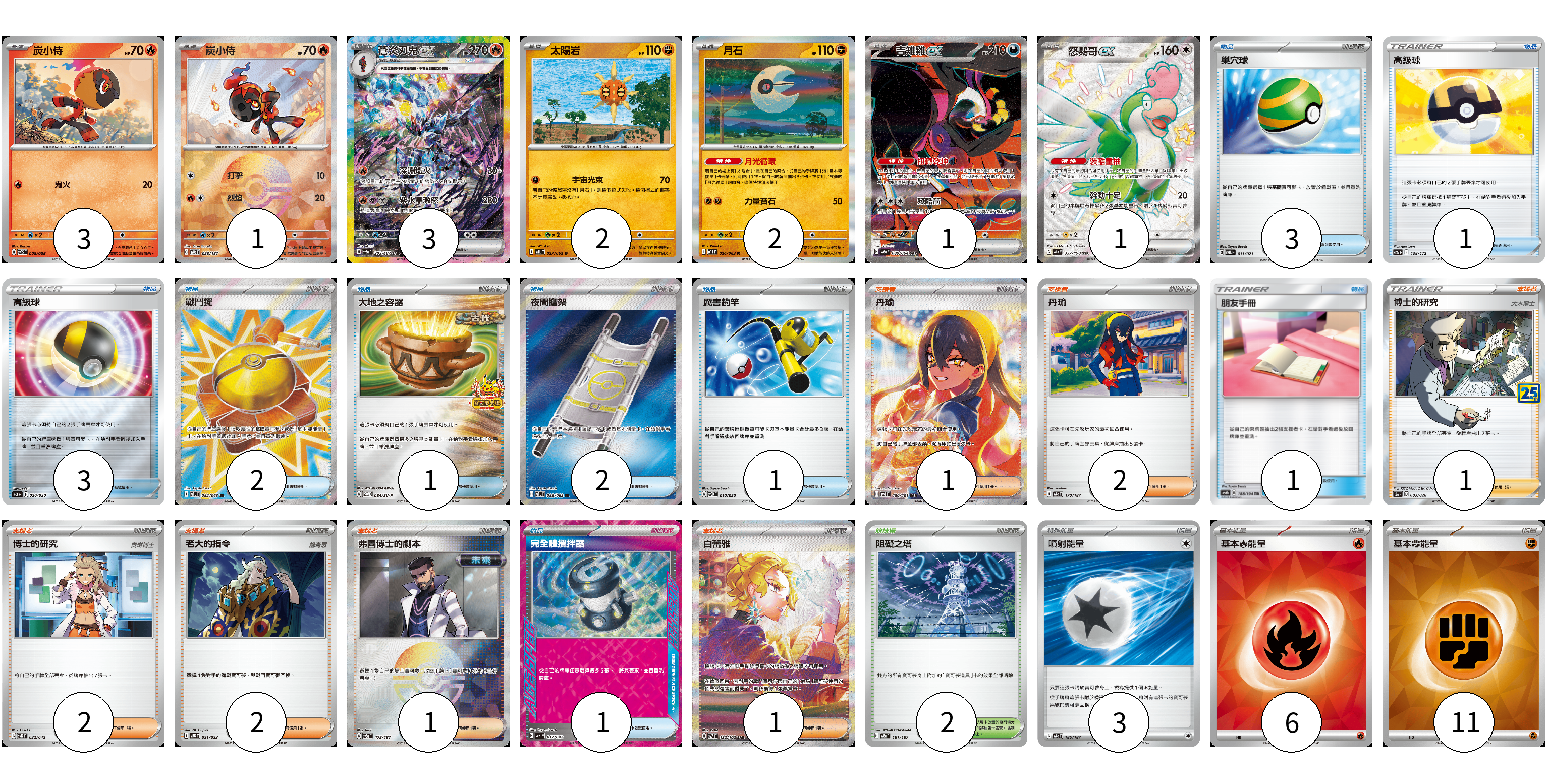 牌組構築方案 以此牌組為基礎新構築牌組 顯示卡面 顯示列表 寶可夢卡(13) 3 1 3 2 2 1 1 物品卡(15) 3 1 3 2 1 2 1 1 1 支援者卡(10) 1 2 1 2 2 1 1 競技場卡(2) 2 能量卡(20) 3 6 11 寶可夢卡(13) 卡牌名稱 張數 卡牌名稱 張數 炭小侍 SVPS 005/008 03 炭小侍 SV8a 023/187 01 蒼炎刃鬼ex SV8a 203/187 03 太陽岩 M1L 027/063 02 月石 M1L 026/063 02 吉雉雞ex SV6a 089/064 01 怒鸚哥ex SV4a 337/190 01 物品卡(15) 卡牌名稱 張數 卡牌名稱 張數 巢穴球 SVTL 011/021 03 高級球 S12a 138/172 01 高級球 SO 020/030 03 戰鬥鑼 M1L 082/063 02 大地之容器 SV-P 084/SV-P 01 夜間擔架 M1L 083/063 02 厲害釣竿 SVOD 010/020 01 朋友手冊 AS6b 188/194 01 完全體攪拌器 SVK 017/042 01 支援者卡(10) 卡牌名稱 張數 卡牌名稱 張數 丹瑜 SV6 130/101 01 丹瑜 SV8a 170/187 02 博士的研究(大木博士) S8a 003/028 01 博士的研究 SVK 032/042 02 老大的指令 MBG 021/022 02 弗圖博士的劇本 SV8a 175/187 01 白蕾雅 SV7 132/102 01 競技場卡(2) 卡牌名稱 張數 卡牌名稱 張數 阻礙之塔 SV8a 181/187 02 能量卡(20) 卡牌名稱 張數 卡牌名稱 張數 噴射能量 SV8a 185/187 03 基本【火】能量 SVQL FIR 06 基本【鬥】能量 SVM FIG 11 以此牌組為基礎新構築牌組 牌組編碼 qkPzvu-LmJCFr-qxRZMh copy 列印牌組單 牌組編碼已複製 分享至SNS
