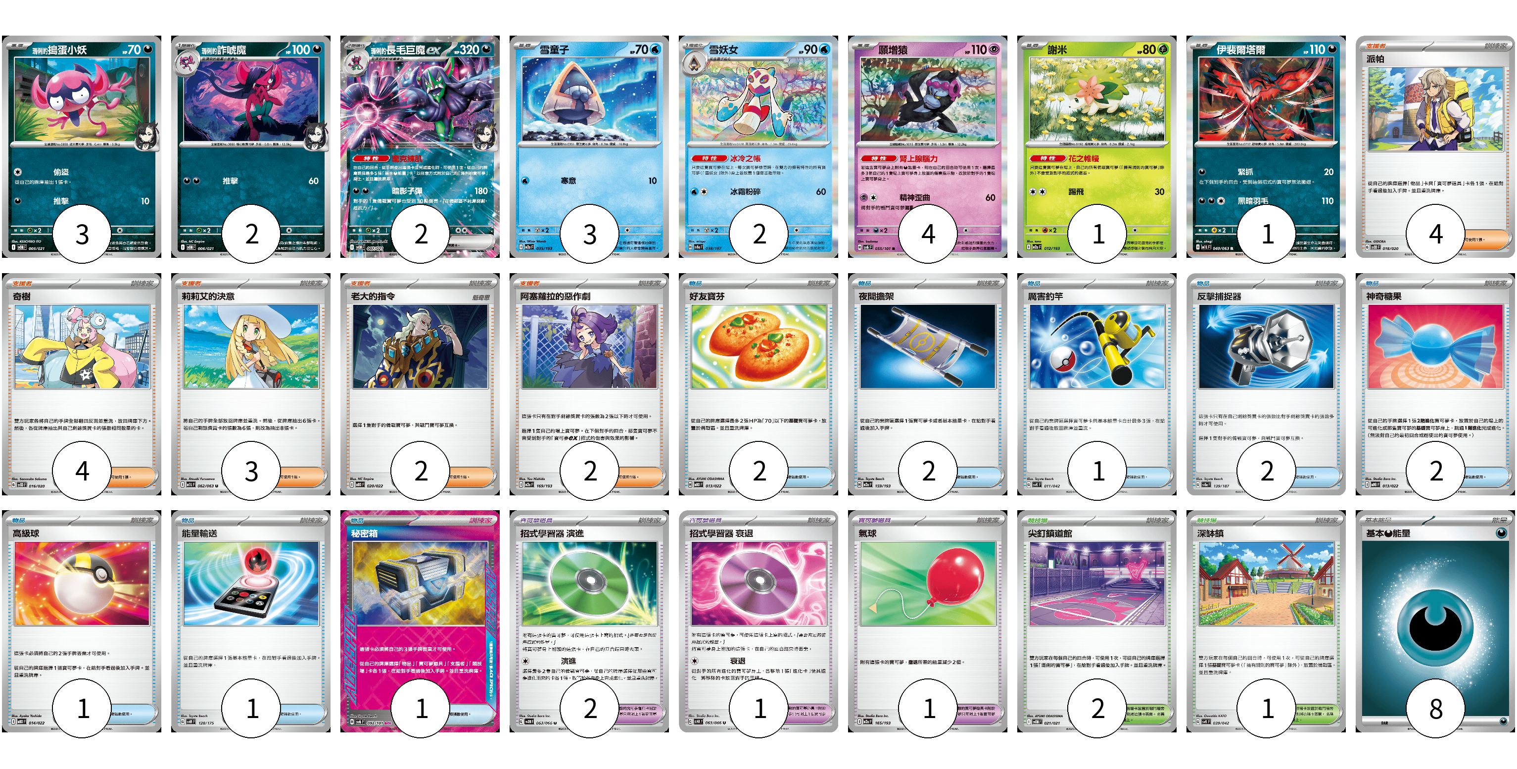 牌組構築方案 以此牌組為基礎新構築牌組 顯示卡面 顯示列表 寶可夢卡(18) 3 2 2 3 2 4 1 1 寶可夢道具(4) 2 1 1 物品卡(12) 2 2 1 2 2 1 1 1 支援者卡(15) 4 4 3 2 2 競技場卡(3) 2 1 能量卡(8) 8 寶可夢卡(18) 卡牌名稱 張數 卡牌名稱 張數 <瑪俐的>搗蛋小妖 SVOM 005/021 03 <瑪俐的>詐唬魔 SVOM 006/021 02 <瑪俐的>長毛巨魔ex SVOM 007/021 02 雪童子 M2a 035/193 03 雪妖女 SV8a 038/187 02 願增猿 SV6 055/101 04 謝米 M2a 012/193 01 伊裴爾塔爾 M1L 040/063 01 寶可夢道具(4) 卡牌名稱 張數 卡牌名稱 張數 招式學習器 演進 SV4M 063/066 02 招式學習器 衰退 SV4K 063/066 01 氣球 M2a 165/193 01 物品卡(12) 卡牌名稱 張數 卡牌名稱 張數 好友寶芬 MBD 013/022 02 夜間擔架 M2a 159/193 02 厲害釣竿 SVK 011/042 01 反擊捕捉器 SV8a 139/187 02 神奇糖果 MBG 013/022 02 高級球 MBD 014/022 01 能量輸送 SVM 128/175 01 秘密箱 SV6 092/101 01 支援者卡(15) 卡牌名稱 張數 卡牌名稱 張數 派帕 SVOD 018/020 04 奇樹 SVOD 016/020 04 莉莉艾的決意 M1L 062/063 03 老大的指令 MBD 020/022 02 阿塞蘿拉的惡作劇 M2a 169/193 02 競技場卡(3) 卡牌名稱 張數 卡牌名稱 張數 尖釘鎮道館 SVOM 021/021 02 深缽鎮 SVK 039/042 01 能量卡(8) 卡牌名稱 張數 卡牌名稱 張數 基本【惡】能量 MBG DAR 08 以此牌組為基礎新構築牌組 牌組編碼 qnlEfc-WDljuO-RPbyxY copy 列印牌組單 牌組編碼已複製 分享至SNS