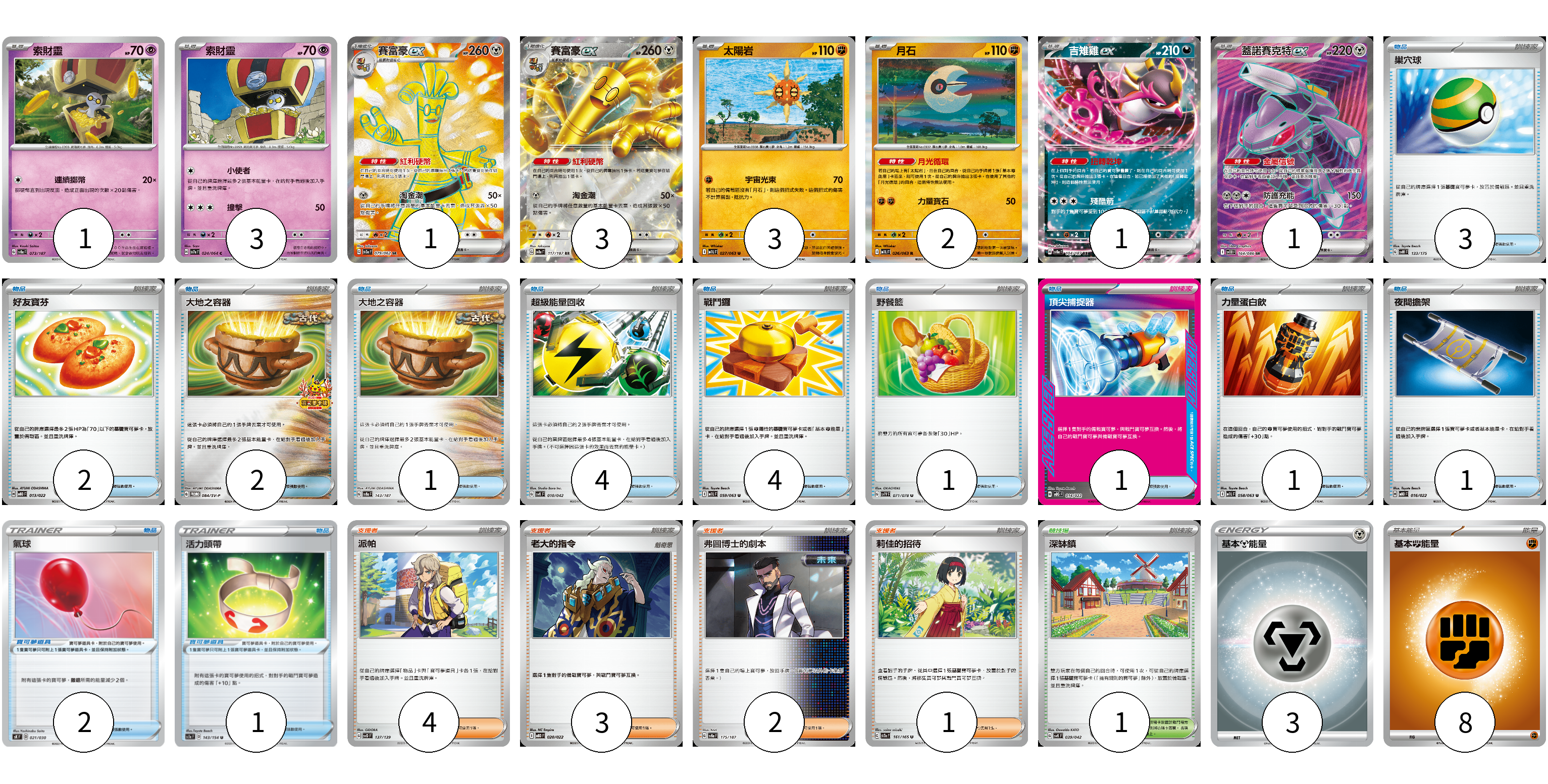 牌組構築方案 以此牌組為基礎新構築牌組 顯示卡面 顯示列表 寶可夢卡(15) 1 3 1 3 3 2 1 1 寶可夢道具(3) 2 1 物品卡(20) 3 2 2 1 4 4 1 1 1 1 支援者卡(10) 4 3 2 1 競技場卡(1) 1 能量卡(11) 3 8 寶可夢卡(15) 卡牌名稱 張數 卡牌名稱 張數 索財靈 SV8a 073/187 01 索財靈 SV7a 024/064 03 賽富豪ex SV3a 079/062 01 賽富豪ex SV8a 117/187 03 太陽岩 M1L 027/063 03 月石 M1L 026/063 02 吉雉雞ex SV8a 104/187 01 蓋諾賽克特ex SV11B 164/086 01 寶可夢道具(3) 卡牌名稱 張數 卡牌名稱 張數 氣球 SK 021/030 02 活力頭帶 SC1a 143/154 01 物品卡(20) 卡牌名稱 張數 卡牌名稱 張數 巢穴球 SVM 133/175 03 好友寶芬 MBD 013/022 02 大地之容器 SV-P 084/SV-P 02 大地之容器 SV8a 143/187 01 超級能量回收 SVK 010/042 04 戰鬥鑼 M1L 059/063 04 野餐籃 SV1V 071/078 01 頂尖捕捉器 MBG 014/022 01 力量蛋白飲 M1L 058/063 01 夜間擔架 MBD 016/022 01 支援者卡(10) 卡牌名稱 張數 卡牌名稱 張數 派帕 SVD 137/139 04 老大的指令 MBD 020/022 03 弗圖博士的劇本 SV8a 175/187 02 莉佳的招待 SV2a 161/165 01 競技場卡(1) 卡牌名稱 張數 卡牌名稱 張數 深缽鎮 SVK 039/042 01 能量卡(11) 卡牌名稱 張數 卡牌名稱 張數 基本【鋼】能量 SI MET 03 基本【鬥】能量 M-P FIG 08 以此牌組為基礎新構築牌組 牌組編碼 qnsDIE-qCJAmR-GcggFK copy 列印牌組單 牌組編碼已複製 分享至SNS