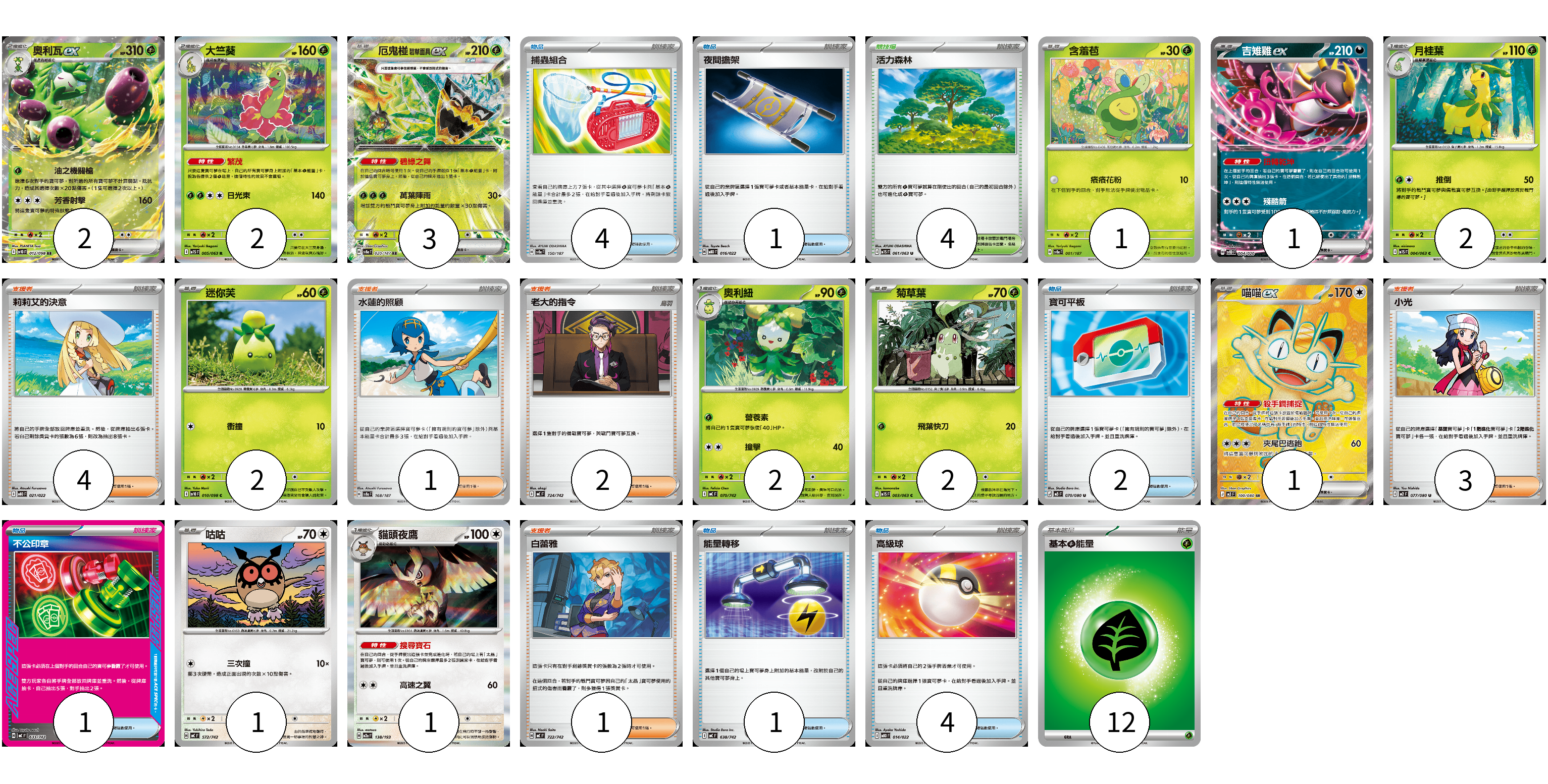 牌組構築方案 以此牌組為基礎新構築牌組 顯示卡面 顯示列表 寶可夢卡(20) 2 2 3 1 1 2 2 2 2 1 1 1 物品卡(13) 4 1 2 1 1 4 支援者卡(11) 4 1 2 3 1 競技場卡(4) 4 能量卡(12) 12 寶可夢卡(20) 卡牌名稱 張數 卡牌名稱 張數 奧利瓦ex SV10 012/098 02 大竺葵 M1S 005/063 02 厄鬼椪 碧草面具ex SV8a 020/187 03 含羞苞 SV8a 001/187 01 吉雉雞ex SVOD 004/020 01 月桂葉 M1S 004/063 02 迷你芙 SV10 010/098 02 奧利紐 MC 070/742 02 菊草葉 M1S 003/063 02 喵喵ex M3 100/080 01 咕咕 MC 572/742 01 貓頭夜鷹 M2a 138/193 01 物品卡(13) 卡牌名稱 張數 卡牌名稱 張數 捕蟲組合 SV8a 150/187 04 夜間擔架 MBD 016/022 01 寶可平板 M3 070/080 02 不公印章 MC 633/742 01 能量轉移 MC 638/742 01 高級球 MBD 014/022 04 支援者卡(11) 卡牌名稱 張數 卡牌名稱 張數 莉莉艾的決意 MBD 021/022 04 水蓮的照顧 SV8a 168/187 01 老大的指令 MC 724/742 02 小光 M2 077/080 03 白蕾雅 MC 722/742 01 競技場卡(4) 卡牌名稱 張數 卡牌名稱 張數 活力森林 M1S 061/063 04 能量卡(12) 卡牌名稱 張數 卡牌名稱 張數 基本【草】能量 MJ GRA 12 以此牌組為基礎新構築牌組 牌組編碼 qoDDPX-PVyTrm-JhStPF copy 列印牌組單 牌組編碼已複製 分享至SNS