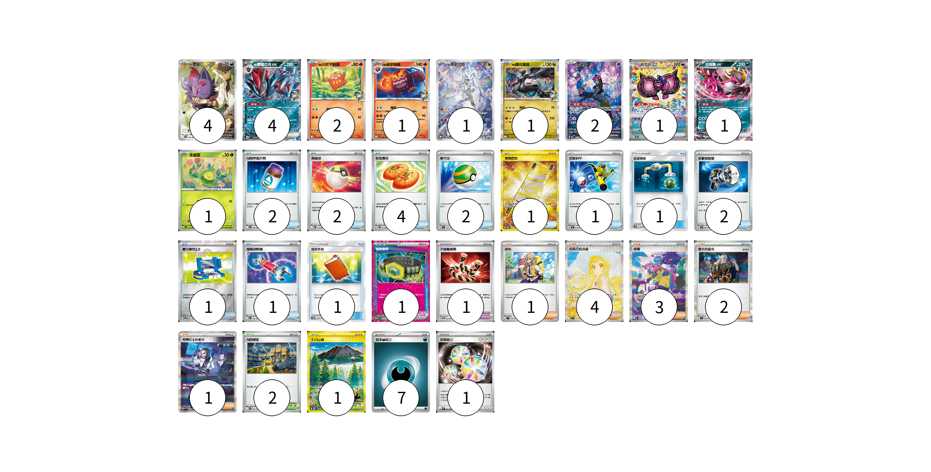 牌組構築方案 以此牌組為基礎新構築牌組 顯示卡面 顯示列表 寶可夢卡(18) 4 4 2 1 1 1 2 1 1 1 寶可夢道具(2) 1 1 物品卡(18) 2 2 4 2 1 1 1 2 1 1 1 支援者卡(11) 1 4 3 2 1 競技場卡(3) 2 1 能量卡(8) 7 1 寶可夢卡(18) 卡牌名稱 張數 卡牌名稱 張數 N的索羅亞 SV9 108/100 04 N的索羅亞克ex M2a 112/193 04 N的火紅不倒翁 M2a 027/193 02 N的達摩狒狒 M2a 028/193 01 N的萊希拉姆 SV9 109/100 01 N的捷克羅姆 M2a 129/193 01 願增猿 SV6 107/101 02 桃歹郎ex SV8a 219/187 01 吉雉雞ex M2a 114/193 01 含羞苞 M2a 011/193 01 寶可夢道具(2) 卡牌名稱 張數 卡牌名稱 張數 極限腰帶 SV8a 159/187 01 不服輸頭帶 SVTL 016/021 01 物品卡(18) 卡牌名稱 張數 卡牌名稱 張數 N的PP提升劑 M2a 146/193 02 高級球 MBG 012/022 02 好友寶芬 MBG 011/022 04 巢穴球 SV1S 070/078 02 夜間擔架 SV8 137/106 01 厲害釣竿 SV2P 066/071 01 能量轉移 AS6D 142/168 01 反擊捕捉器 SV4M 059/066 02 寶可裝置3.0 SV11B 081/086 01 道具拆除器 M2a 151/193 01 朋友手冊 AC2D 145/176 01 支援者卡(11) 卡牌名稱 張數 卡牌名稱 張數 派帕 SV1V 076/078 01 莉莉艾的決意 M1L 091/063 04 奇樹 SV4a 350/190 03 老大的指令 SV1a 069/073 02 弗圖博士的劇本 SV4M 091/066 01 競技場卡(3) 卡牌名稱 張數 卡牌名稱 張數 N的城堡 M2a 181/193 02 引力山岳 SV8 138/106 01 能量卡(8) 卡牌名稱 張數 卡牌名稱 張數 基本惡能量 sv-p DAR 07 反轉能量 SVK 041/042 01 以此牌組為基礎新構築牌組 牌組編碼 qpICAs-oojCDH-uDBeZZ copy 列印牌組單 牌組編碼已複製 分享至SNS