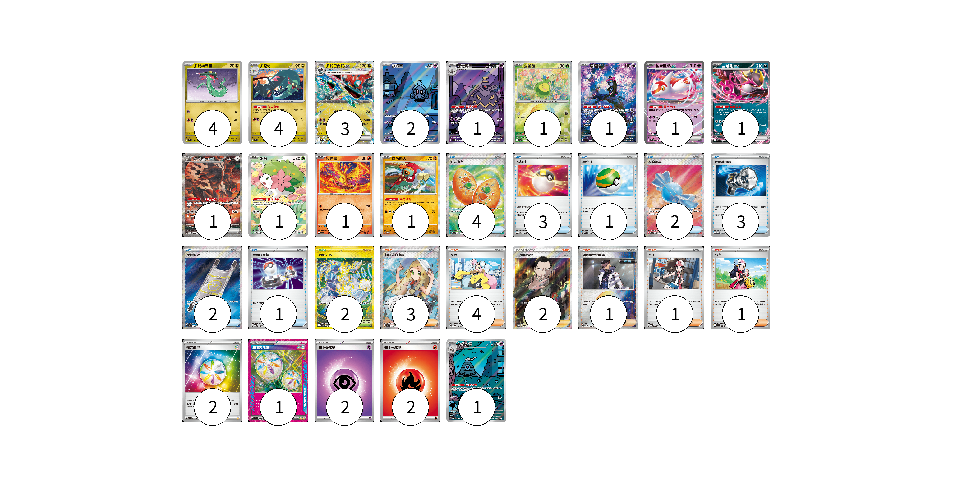 牌組構築方案 以此牌組為基礎新構築牌組 顯示卡面 顯示列表 寶可夢卡(23) 4 4 3 2 1 1 1 1 1 1 1 1 1 1 物品卡(16) 4 3 1 2 3 2 1 支援者卡(12) 3 4 2 1 1 1 競技場卡(2) 2 能量卡(7) 2 1 2 2 寶可夢卡(23) 卡牌名稱 張數 卡牌名稱 張數 多龍梅西亞 SV8a 118/187 04 多龍奇 SV8a 119/187 04 多龍巴魯托ex SV8a 120/187 03 夜巡靈 SV6a 068/064 02 黑夜魔靈 SV6a 070/064 01 含羞苞 SV8a 001/187 01 願增猿 SV6 107/101 01 拉帝亞斯ex MBD 003/022 01 吉雉雞ex SVOM 009/021 01 月月熊 赫月ex SV8a 225/187 01 謝米 SV9a 066/063 01 火焰鳥 M2 014/080 01 摔角鷹人 SV8a 084/187 01 彷徨夜靈 SV6a 069/064 01 物品卡(16) 卡牌名稱 張數 卡牌名稱 張數 好友寶芬 M1S 081/063 04 高級球 SVQP 015/023 03 巢穴球 SVM 133/175 01 神奇糖果 M1S 082/063 02 反擊捕捉器 SV8a 139/187 03 夜間擔架 M1L 083/063 02 寶可夢交替 MBG 015/022 01 支援者卡(12) 卡牌名稱 張數 卡牌名稱 張數 莉莉艾的決意 M1L 086/063 03 奇樹 SVOD 016/020 04 老大的指令(坂木) SC1b 170/153 02 弗圖博士的劇本 SV8a 175/187 01 鬥子 SV11W 085/086 01 小光 M2 077/080 01 競技場卡(2) 卡牌名稱 張數 卡牌名稱 張數 阻礙之塔 SV10 132/098 02 能量卡(7) 卡牌名稱 張數 卡牌名稱 張數 夜光能量 SVK 042/042 02 新衝天能量 SV5K 071/071 01 基本【超】能量 MBD PSY 02 基本【火】能量 M-P FIR 02 以此牌組為基礎新構築牌組 牌組編碼 qraJoG-CzrzXh-tQcCgG copy 列印牌組單 牌組編碼已複製 分享至SNS