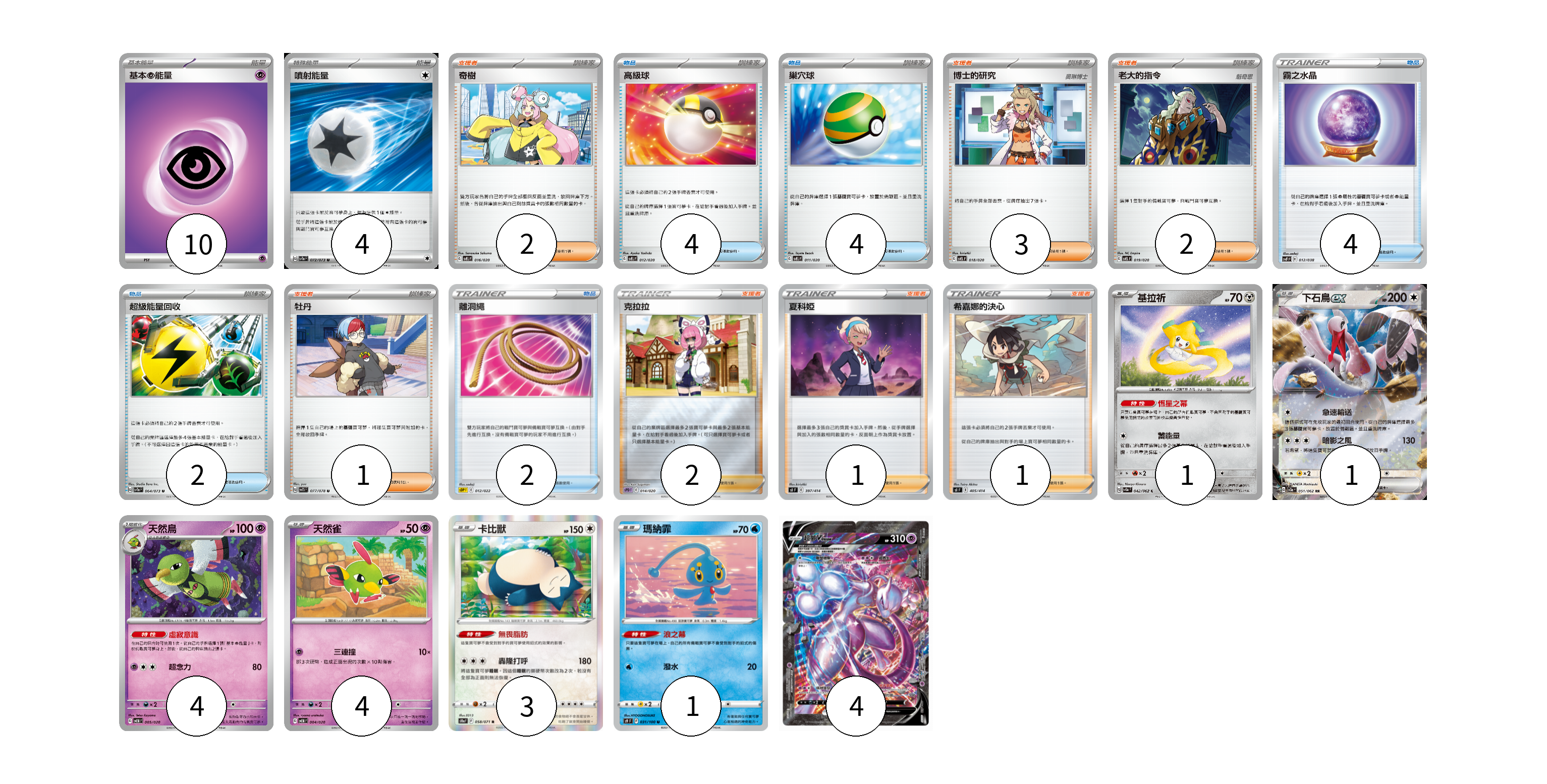 牌組構築方案 以此牌組為基礎新構築牌組 顯示卡面 顯示列表 寶可夢卡(18) 1 1 4 4 3 1 4 物品卡(16) 4 4 4 2 2 支援者卡(12) 2 3 2 1 2 1 1 能量卡(14) 10 4 寶可夢卡(18) 卡牌名稱 張數 卡牌名稱 張數 基拉祈 SV3a 042/062 01 下石鳥ex SV3a 051/062 01 天然鳥 SVEM 005/020 04 天然雀 SVEM 004/020 04 卡比獸 S10a 058/071 03 瑪納霏 S9 031/100 01 超夢V-UNION SP5 005/013 006/013 007/013 008/013 04 物品卡(16) 卡牌名稱 張數 卡牌名稱 張數 高級球 SVEL 012/020 04 巢穴球 SVEL 011/020 04 霧之水晶 SVF 012/038 04 超級能量回收 SV1a 064/073 02 離洞繩 SDP 012/022 02 支援者卡(12) 卡牌名稱 張數 卡牌名稱 張數 奇樹 SVEL 016/020 02 博士的研究 SVEL 018/020 03 老大的指令 SVEL 019/020 02 牡丹 SV1S 077/078 01 克拉拉 SPD 014/020 02 夏科婭 SI 397/414 01 希嘉娜的決心 SI 405/414 01 能量卡(14) 卡牌名稱 張數 卡牌名稱 張數 基本【超】能量 SVF PSY 10 噴射能量 SV1a 072/073 04 以此牌組為基礎新構築牌組 牌組編碼 qrsbjy-tuVXBH-BlGCBQ copy 列印牌組單 牌組編碼已複製 分享至SNS