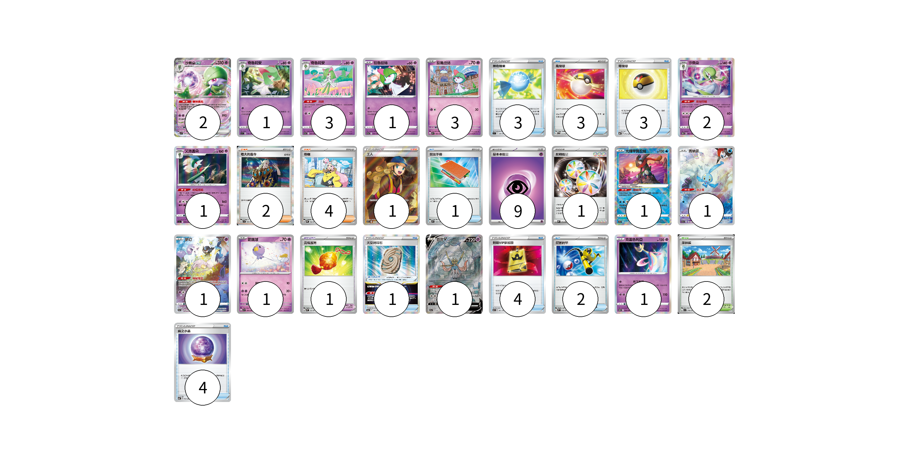 牌組構築方案 以此牌組為基礎新構築牌組 顯示卡面 顯示列表 寶可夢卡(19) 2 1 3 1 3 2 1 1 1 1 1 1 1 寶可夢道具(2) 1 1 物品卡(20) 3 3 3 1 4 2 4 支援者卡(7) 2 4 1 競技場卡(2) 2 能量卡(10) 9 1 寶可夢卡(19) 卡牌名稱 張數 卡牌名稱 張數 沙奈朵ex SV1S 028/078 02 奇魯莉安 SI 176/414 01 奇魯莉安 S11a 037/068 03 拉魯拉絲 S11a 036/068 01 拉魯拉絲 SV1S 026/078 03 沙奈朵 S8b 063/184 02 艾路雷朵 S9a 034/067 01 光輝甲賀忍蛙 S9a 026/067 01 瑪納霏 S12a 178/172 01 夢幻 S12a 183/172 01 飄飄球 SV1S 029/078 01 蒼響V S12a 225/172 01 克雷色利亞 S10D 028/067 01 寶可夢道具(2) 卡牌名稱 張數 卡牌名稱 張數 勇氣護符 SV2D 067/071 01 天空封印石 S12a 146/172 01 物品卡(20) 卡牌名稱 張數 卡牌名稱 張數 神奇糖果 SI 376/414 03 高級球 SVC 014/021 03 等級球 SVB 015/028 03 朋友手冊 SV1S 069/078 01 對戰VIP參加證 S8 091/100 04 厲害釣竿 SV2P 066/071 02 霧之水晶 SVB 013/028 04 支援者卡(7) 卡牌名稱 張數 卡牌名稱 張數 老大的指令 SV1a 069/073 02 奇樹 SV2D 069/071 04 工人 S12 111/098 01 競技場卡(2) 卡牌名稱 張數 卡牌名稱 張數 深缽鎮 SV1a 070/073 02 能量卡(10) 卡牌名稱 張數 卡牌名稱 張數 基本超能量 sv-p PSY 09 反轉能量 SV2P 071/071 01 以此牌組為基礎新構築牌組 牌組編碼 qtZmHj-BKInyT-QeVqax copy 列印牌組單 牌組編碼已複製 分享至SNS