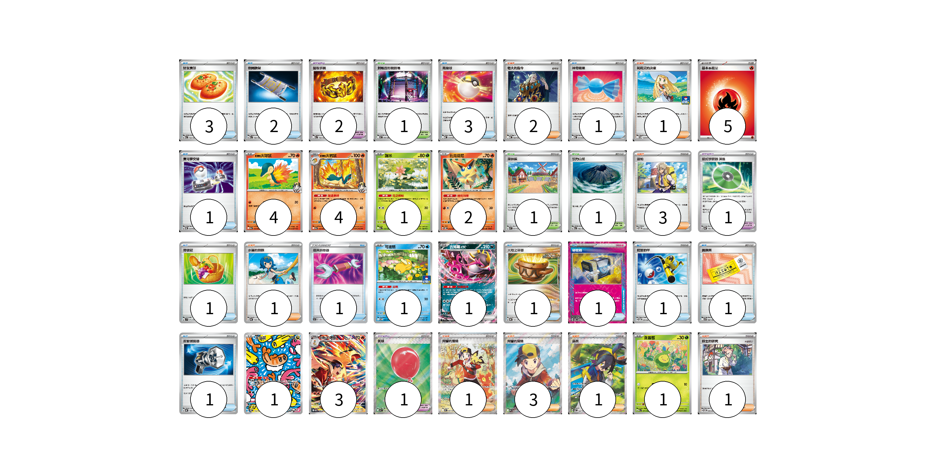 牌組構築方案 以此牌組為基礎新構築牌組 顯示卡面 顯示列表 寶可夢卡(18) 4 4 1 2 1 1 1 3 1 寶可夢道具(4) 2 1 1 物品卡(17) 3 2 3 1 1 1 1 1 1 1 1 1 支援者卡(13) 2 1 3 1 1 3 1 1 競技場卡(3) 1 1 1 能量卡(5) 5 寶可夢卡(18) 卡牌名稱 張數 卡牌名稱 張數 <阿響的>火球鼠 SV9a 015/063 04 <阿響的>火岩鼠 SV9a 016/063 04 謝米 M2a 012/193 01 比克提尼 SV8 012/106 02 可達鴨 SV-P 220/SV-P 01 吉雉雞ex M2a 114/193 01 米立龍 SV6 112/101 01 <阿響的>火爆獸 SV9a 070/063 03 含羞苞 M2a 011/193 01 寶可夢道具(4) 卡牌名稱 張數 卡牌名稱 張數 猛攻手鐲 M2a 166/193 02 招式學習器 演進 SV8a 160/187 01 氣球 M1L 084/063 01 物品卡(17) 卡牌名稱 張數 卡牌名稱 張數 好友寶芬 M2a 153/193 03 夜間擔架 M2a 159/193 02 高級球 MBD 014/022 03 神奇糖果 MBG 013/022 01 寶可夢交替 SVQL 016/022 01 野餐籃 SV1V 071/078 01 道具拆除器 SC1a 138/154 01 大地之容器 SV8a 143/187 01 秘密箱 SV6 092/101 01 厲害釣竿 SVOD 010/020 01 調換票 SV9 090/100 01 反擊捕捉器 SV8a 139/187 01 支援者卡(13) 卡牌名稱 張數 卡牌名稱 張數 老大的指令 MBD 020/022 02 莉莉艾的決意 M-P 018/M-P 01 派帕 SVOD 018/020 03 水蓮的照顧 SV8a 168/187 01 阿響的冒險 SV9a 089/063 01 阿響的冒險 SV9a 084/063 03 烏栗 SV6 122/101 01 博士的研究 SVOM 019/021 01 競技場卡(3) 卡牌名稱 張數 卡牌名稱 張數 對戰圓形競技場 M2 079/080 01 深缽鎮 SVK 039/042 01 引力山岳 M2a 183/193 01 能量卡(5) 卡牌名稱 張數 卡牌名稱 張數 基本【火】能量 M-P FIR 05 以此牌組為基礎新構築牌組 牌組編碼 qtnEhQ-sOmZeF-tUfrZc copy 列印牌組單 牌組編碼已複製 分享至SNS