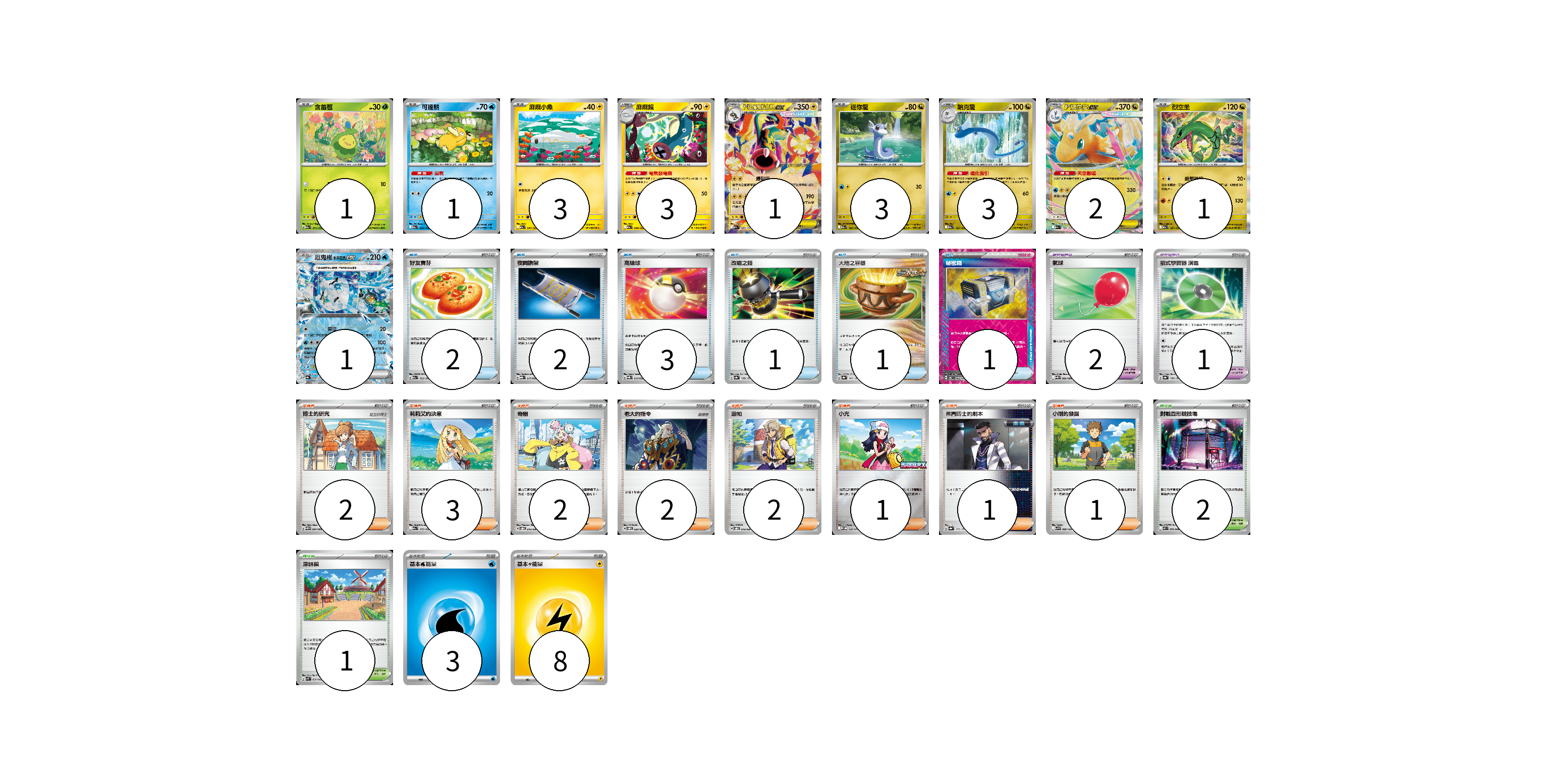 牌組構築方案 以此牌組為基礎新構築牌組 顯示卡面 顯示列表 寶可夢卡(19) 1 1 3 3 1 3 3 2 1 1 寶可夢道具(3) 2 1 物品卡(10) 2 2 3 1 1 1 支援者卡(14) 2 3 2 2 2 1 1 1 競技場卡(3) 2 1 能量卡(11) 3 8 寶可夢卡(19) 卡牌名稱 張數 卡牌名稱 張數 含羞苞 M2a 011/193 01 可達鴨 M2a 032/193 01 麻麻小魚 M2a 047/193 03 麻麻鰻 M2a 048/193 03 超級麻麻鰻魚王ex M2a 049/193 01 迷你龍 M2a 124/193 03 哈克龍 M2a 125/193 03 超級快龍ex M2a 126/193 02 烈空坐 M2a 127/193 01 厄鬼椪 水井面具ex SV8a 050/187 01 寶可夢道具(3) 卡牌名稱 張數 卡牌名稱 張數 氣球 SV11B 082/086 02 招式學習器 演進 SV8a 160/187 01 物品卡(10) 卡牌名稱 張數 卡牌名稱 張數 好友寶芬 M2a 153/193 02 夜間擔架 MBG 017/022 02 高級球 SVQL 015/022 03 改造之錘 SV8a 138/187 01 大地之容器 SV8a 143/187 01 秘密箱 SV6 092/101 01 支援者卡(14) 卡牌名稱 張數 卡牌名稱 張數 博士的研究 SV11B 084/086 02 莉莉艾的決意 M2a 175/193 03 奇樹 SVOD 016/020 02 老大的指令 SVOM 020/021 02 派帕 SVOD 018/020 02 小光 M-P 028/M-P 01 弗圖博士的劇本 SV8a 175/187 01 小剛的發掘 SV9 096/100 01 競技場卡(3) 卡牌名稱 張數 卡牌名稱 張數 對戰圓形競技場 M2 079/080 02 深缽鎮 SVK 039/042 01 能量卡(11) 卡牌名稱 張數 卡牌名稱 張數 基本【水】能量 SVF WAT 03 基本【雷】能量 SVF LIG 08 以此牌組為基礎新構築牌組 牌組編碼 quPHQT-CaurLp-HiojkD copy 列印牌組單 牌組編碼已複製 分享至SNS