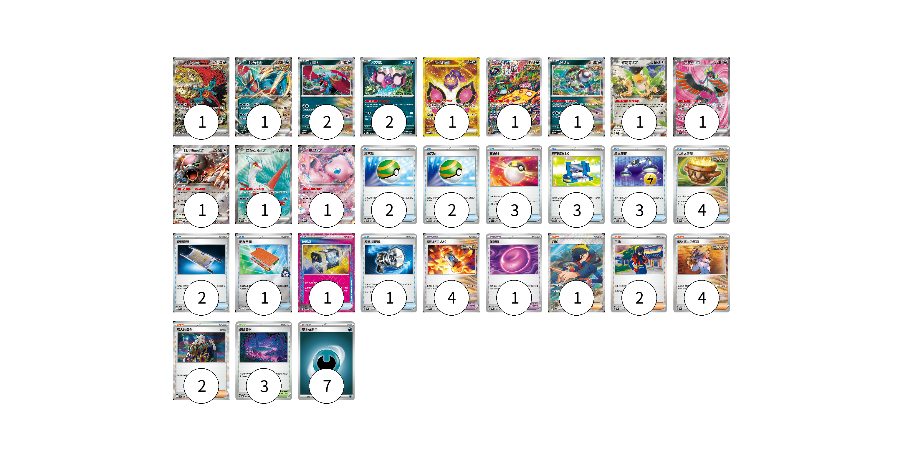 牌組構築方案 以此牌組為基礎新構築牌組 顯示卡面 顯示列表 寶可夢卡(14) 1 1 2 2 1 1 1 1 1 1 1 1 寶可夢道具(5) 4 1 物品卡(22) 2 2 3 3 3 4 2 1 1 1 支援者卡(9) 1 2 4 2 競技場卡(3) 3 能量卡(7) 7 寶可夢卡(14) 卡牌名稱 張數 卡牌名稱 張數 轟鳴月ex SV8a 218/187 01 轟鳴月ex SV4K 054/066 01 轟鳴月 SV8a 100/187 02 桃歹郎 SV8 075/106 02 桃歹郎ex SV6a 092/064 01 猛惡菇 SV4K 077/066 01 猛惡菇 SV8a 099/187 01 怒鸚哥ex SV4a 154/190 01 吉雉雞ex SV6a 081/064 01 月月熊 赫月 ex SV5a 052/066 01 拉帝亞斯ex SV7a 078/064 01 夢幻ex SV4a 076/190 01 寶可夢道具(5) 卡牌名稱 張數 卡牌名稱 張數 驅勁能量 古代 SV8a 157/187 04 鎖鏈糬 SV8a 154/187 01 物品卡(22) 卡牌名稱 張數 卡牌名稱 張數 巢穴球 SVAL 012/021 02 巢穴球 SVAM 015/023 02 高級球 SV1V 070/078 03 寶可裝置3.0 SVAL 015/021 03 能量轉移 SVAM 012/023 03 大地之容器 SV8a 143/187 04 夜間擔架 SV8a 151/187 02 朋友手冊 SV-P 182/SV-P 01 秘密箱 SV6 092/101 01 反擊捕捉器 SV8a 139/187 01 支援者卡(9) 卡牌名稱 張數 卡牌名稱 張數 丹瑜 SV6 123/101 01 丹瑜 SV8a 170/187 02 奧琳博士的氣魄 SV8a 167/187 04 老大的指令 SV1a 069/073 02 競技場卡(3) 卡牌名稱 張數 卡牌名稱 張數 危險密林 SV5K 070/071 03 能量卡(7) 卡牌名稱 張數 卡牌名稱 張數 基本惡能量 sv-p DAR 07 以此牌組為基礎新構築牌組 牌組編碼 qvlXMB-NCmIpE-GLgdgq copy 列印牌組單 牌組編碼已複製 分享至SNS