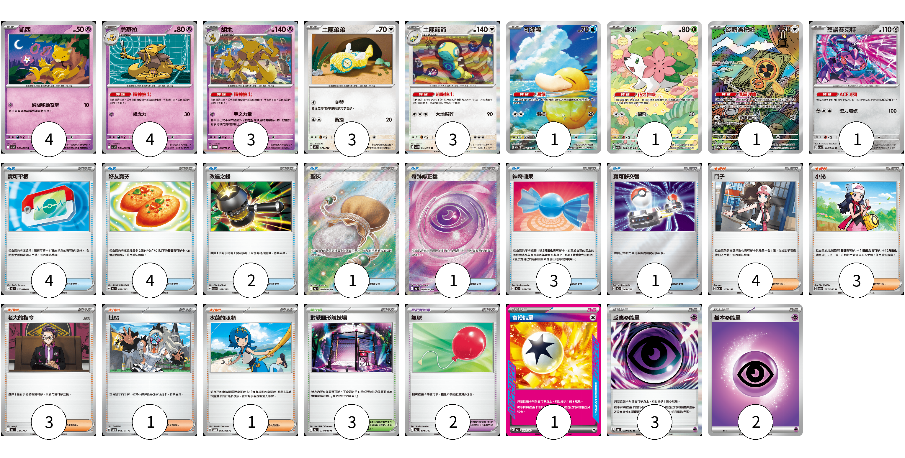 牌組構築方案 以此牌組為基礎新構築牌組 顯示卡面 顯示列表 寶可夢卡(21) 4 4 3 3 3 1 1 1 1 寶可夢道具(2) 2 物品卡(16) 4 4 2 1 1 3 1 支援者卡(12) 4 3 3 1 1 競技場卡(3) 3 能量卡(6) 1 3 2 寶可夢卡(21) 卡牌名稱 張數 卡牌名稱 張數 凱西 M1S 036/063 04 勇基拉 M1S 037/063 04 胡地 M-P 058/M-P 03 土龍弟弟 MC 574/742 03 土龍節節 SV5K 057/071 03 可達鴨 M2a 199/193 01 謝米 SV9a 066/063 01 旋轉洛托姆 M2a 213/193 01 蓋諾賽克特 SV6a 040/064 01 寶可夢道具(2) 卡牌名稱 張數 卡牌名稱 張數 氣球 MC 688/742 02 物品卡(16) 卡牌名稱 張數 卡牌名稱 張數 寶可平板 M3 070/080 04 好友寶芬 MC 648/742 04 改造之錘 M2a 148/193 02 聖灰 M3 102/080 01 奇跡修正檔 M3 104/080 01 神奇糖果 MC 655/742 03 寶可夢交替 MC 663/742 01 支援者卡(12) 卡牌名稱 張數 卡牌名稱 張數 鬥子 M2a 172/193 04 小光 M2 077/080 03 老大的指令 MC 724/742 03 枇琶 SV5K 068/071 01 水蓮的照顧 SV5a 064/066 01 競技場卡(3) 卡牌名稱 張數 卡牌名稱 張數 對戰圓形競技場 M2 079/080 03 能量卡(6) 卡牌名稱 張數 卡牌名稱 張數 富裕能量 MC 740/742 01 感應【超】能量 M3 079/080 03 基本【超】能量 M-P PSY 02 以此牌組為基礎新構築牌組 牌組編碼 qvsUzo-PyVSMw-uiHgJZ copy 列印牌組單 牌組編碼已複製 分享至SNS