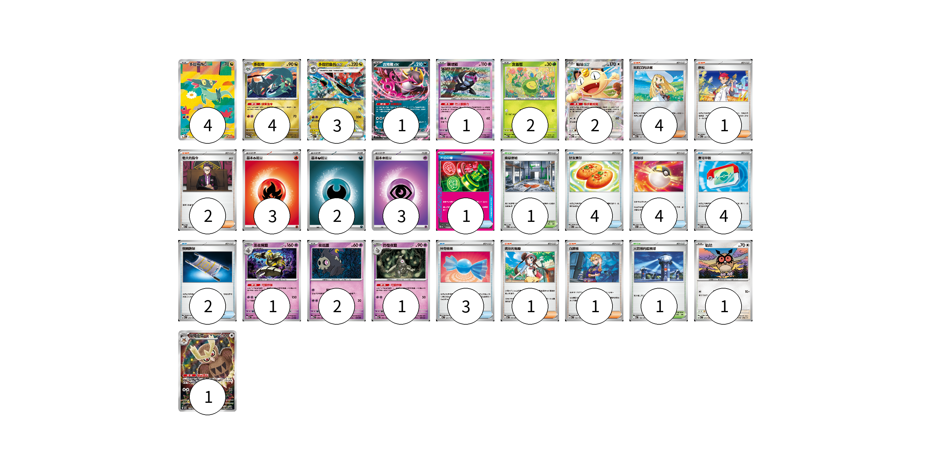 牌組構築方案 以此牌組為基礎新構築牌組 顯示卡面 顯示列表 寶可夢卡(23) 4 4 3 1 1 2 2 1 2 1 1 1 物品卡(18) 1 4 4 4 2 3 支援者卡(9) 4 1 2 1 1 競技場卡(2) 1 1 能量卡(8) 3 2 3 寶可夢卡(23) 卡牌名稱 張數 卡牌名稱 張數 多龍梅西亞 M2a 211/193 04 多龍奇 M2a 133/193 04 多龍巴魯托ex M2a 134/193 03 吉雉雞ex MC 489/742 01 願增猿 M2a 081/193 01 含羞苞 M2a 011/193 02 喵喵ex M3 061/080 02 黑夜魔靈 MC 310/742 01 夜巡靈 MC 308/742 02 彷徨夜靈 MC 309/742 01 咕咕 MC 572/742 01 貓頭夜鷹 SV7 114/102 01 物品卡(18) 卡牌名稱 張數 卡牌名稱 張數 不公印章 MC 633/742 01 好友寶芬 MC 648/742 04 高級球 MC 651/742 04 寶可平板 M3 070/080 04 夜間擔架 MC 670/742 02 神奇糖果 MC 655/742 03 支援者卡(9) 卡牌名稱 張數 卡牌名稱 張數 莉莉艾的決意 MC 729/742 04 赤松 MC 696/742 01 老大的指令 MC 724/742 02 鳴依的勉勵 M3 075/080 01 白蕾雅 MC 722/742 01 競技場卡(2) 卡牌名稱 張數 卡牌名稱 張數 險惡廢墟 M1L 063/063 01 火箭隊的監視塔 M2a 189/193 01 能量卡(8) 卡牌名稱 張數 卡牌名稱 張數 基本【火】能量 MC FIR 03 基本【惡】能量 MC DAR 02 基本【超】能量 M-P PSY 03 以此牌組為基礎新構築牌組 牌組編碼 qxBusY-rqFZoz-kJdLMt copy 列印牌組單 牌組編碼已複製 分享至SNS