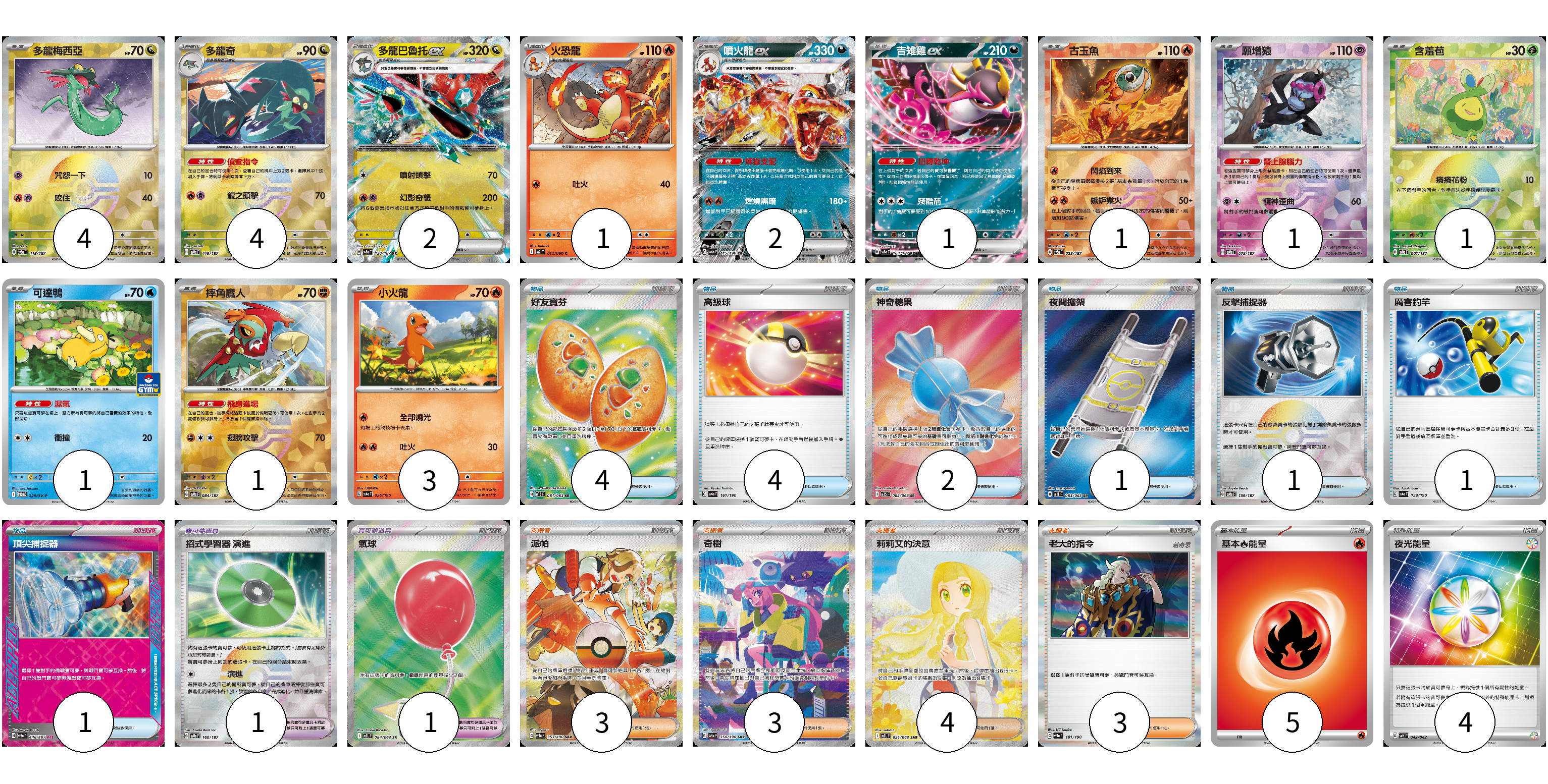 牌組構築方案 以此牌組為基礎新構築牌組 顯示卡面 顯示列表 寶可夢卡(22) 4 4 2 1 2 1 1 1 1 1 1 3 寶可夢道具(2) 1 1 物品卡(14) 4 4 2 1 1 1 1 支援者卡(13) 3 3 4 3 能量卡(9) 5 4 寶可夢卡(22) 卡牌名稱 張數 卡牌名稱 張數 多龍梅西亞 SV8a 118/187 04 多龍奇 SV8a 119/187 04 多龍巴魯托ex SV8a 120/187 02 火恐龍 M2 012/080 01 噴火龍ex SV4a 115/190 02 吉雉雞ex SV8a 104/187 01 古玉魚 SV8a 025/187 01 願增猿 SV8a 075/187 01 含羞苞 SV8a 001/187 01 可達鴨 SV-P 220/SV-P 01 摔角鷹人 SV8a 084/187 01 小火龍 SV4a 025/190 03 寶可夢道具(2) 卡牌名稱 張數 卡牌名稱 張數 招式學習器 演進 SV8a 160/187 01 氣球 M1L 084/063 01 物品卡(14) 卡牌名稱 張數 卡牌名稱 張數 好友寶芬 M1S 081/063 04 高級球 SV4a 161/190 04 神奇糖果 M1S 082/063 02 夜間擔架 M1L 083/063 01 反擊捕捉器 SV8a 139/187 01 厲害釣竿 SV4a 158/190 01 頂尖捕捉器 SV8a 148/187 01 支援者卡(13) 卡牌名稱 張數 卡牌名稱 張數 派帕 SV4a 353/190 03 奇樹 SV4a 350/190 03 莉莉艾的決意 M1L 091/063 04 老大的指令 SV4a 181/190 03 能量卡(9) 卡牌名稱 張數 卡牌名稱 張數 基本火能量 sv-p FIR 05 夜光能量 SVK 042/042 04 以此牌組為基礎新構築牌組 牌組編碼 qxfDxw-lrxGlu-gyLgYk copy 列印牌組單 牌組編碼已複製 分享至SNS