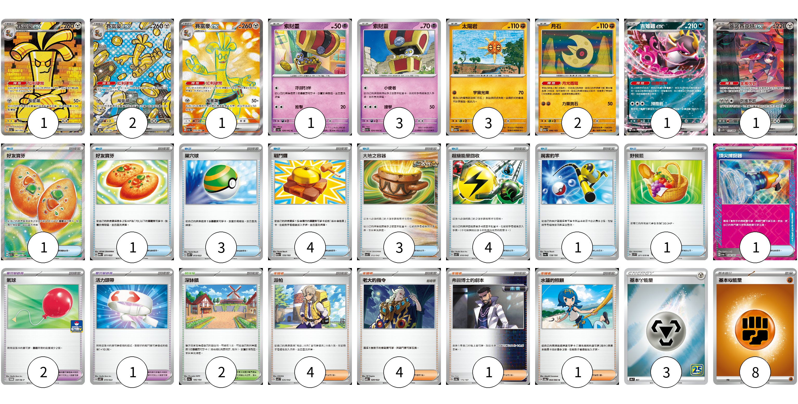牌組構築方案 以此牌組為基礎新構築牌組 顯示卡面 顯示列表 寶可夢卡(15) 1 2 1 1 3 3 2 1 1 寶可夢道具(3) 2 1 物品卡(19) 1 1 3 4 3 4 1 1 1 支援者卡(10) 4 4 1 1 競技場卡(2) 2 能量卡(11) 3 8 寶可夢卡(15) 卡牌名稱 張數 卡牌名稱 張數 賽富豪ex SV3a 087/062 01 賽富豪ex SV8a 220/187 02 賽富豪ex SV3a 079/062 01 索財靈 SV3a 020/062 01 索財靈 SV7a 024/064 03 太陽岩 M2a 087/193 03 月石 M2a 086/193 02 吉雉雞ex SV8a 104/187 01 蓋諾賽克特ex SV11B 172/086 01 寶可夢道具(3) 卡牌名稱 張數 卡牌名稱 張數 氣球 M-P 047/M-P 02 活力頭帶 SVAW 019/023 01 物品卡(19) 卡牌名稱 張數 卡牌名稱 張數 好友寶芬 M1S 081/063 01 好友寶芬 MBG 011/022 01 巢穴球 SVTS 013/022 03 戰鬥鑼 M2a 155/193 04 大地之容器 SVK 012/042 03 超級能量回收 SVK 010/042 04 厲害釣竿 SV4a 158/190 01 野餐籃 SV1V 071/078 01 頂尖捕捉器 SV8a 148/187 01 支援者卡(10) 卡牌名稱 張數 卡牌名稱 張數 派帕 SVK 035/042 04 老大的指令 MBD 020/022 04 弗圖博士的劇本 SV8a 175/187 01 水蓮的照顧 SV5a 064/066 01 競技場卡(2) 卡牌名稱 張數 卡牌名稱 張數 深缽鎮 SV4a 185/190 02 能量卡(11) 卡牌名稱 張數 卡牌名稱 張數 基本鋼能量 S8a MET 03 基本【鬥】能量 M-P FIG 08 以此牌組為基礎新構築牌組 牌組編碼 qyHNkb-CvZcbO-Qjtrso copy 列印牌組單 牌組編碼已複製 分享至SNS