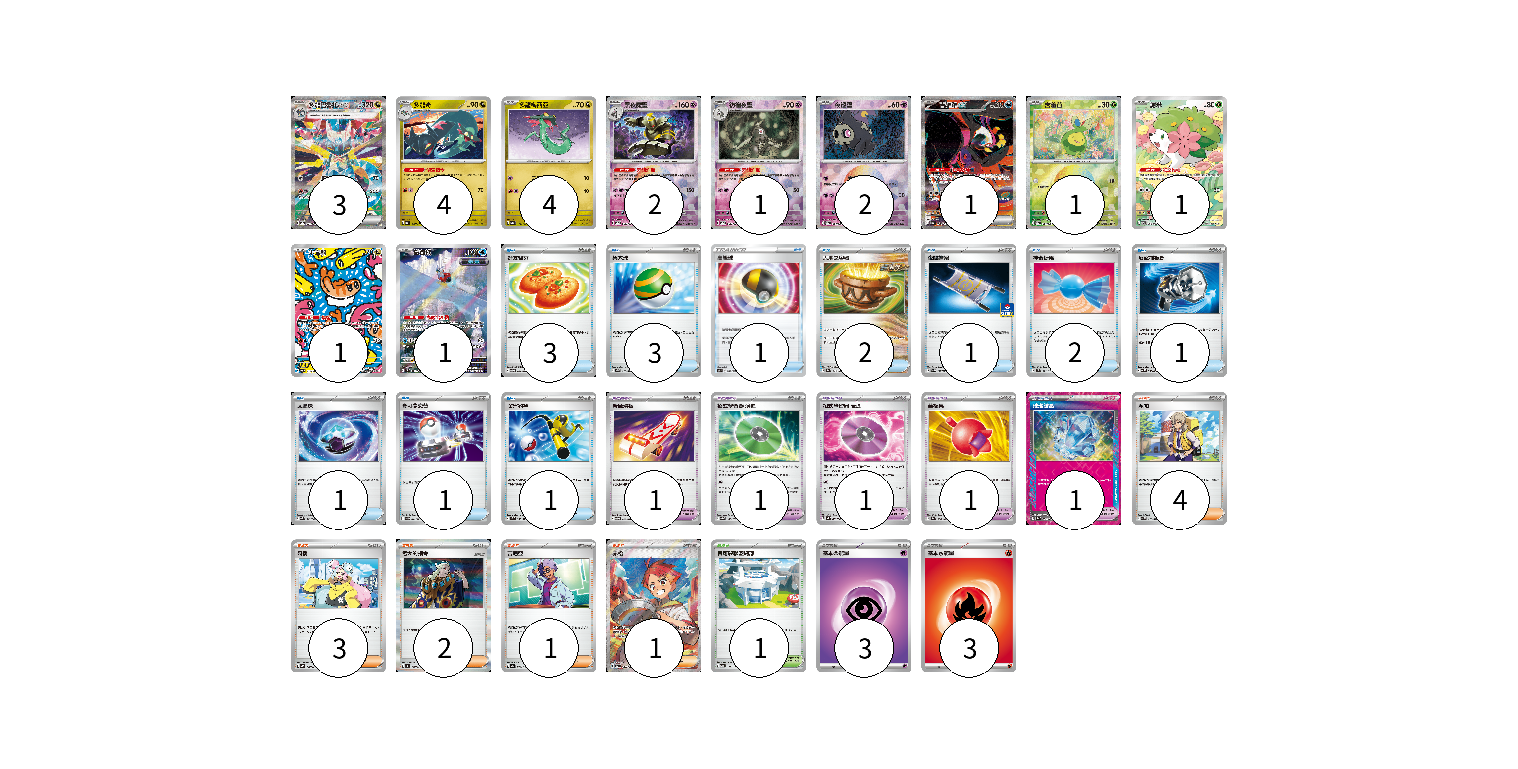 牌組構築方案 以此牌組為基礎新構築牌組 顯示卡面 顯示列表 寶可夢卡(21) 3 4 4 2 1 2 1 1 1 1 1 寶可夢道具(5) 1 1 1 1 1 物品卡(16) 3 3 1 2 1 2 1 1 1 1 支援者卡(11) 4 3 2 1 1 競技場卡(1) 1 能量卡(6) 3 3 寶可夢卡(21) 卡牌名稱 張數 卡牌名稱 張數 多龍巴魯托ex SV8a 221/187 03 多龍奇 SV8a 119/187 04 多龍梅西亞 SV8a 118/187 04 黑夜魔靈 SV8a 066/187 02 彷徨夜靈 SV8a 065/187 01 夜巡靈 SV8a 064/187 02 吉雉雞ex SV6a 089/064 01 含羞苞 SV8a 001/187 01 謝米 SV9a 066/063 01 米立龍 SV6 112/101 01 鐵包袱 SV4M 071/066 01 寶可夢道具(5) 卡牌名稱 張數 卡牌名稱 張數 緊急滑板 SVOD 015/020 01 招式學習器 演進 SV8a 160/187 01 招式學習器 衰退 SV4K 063/066 01 莓榴果 SV8a 156/187 01 璀璨結晶 SV8a 152/187 01 物品卡(16) 卡牌名稱 張數 卡牌名稱 張數 好友寶芬 SVOD 011/020 03 巢穴球 SV1S 070/078 03 高級球 S9 089/100 01 大地之容器 SV8a 143/187 02 夜間擔架 SV-P 227/SV-P 01 神奇糖果 SV1V 072/078 02 反擊捕捉器 SV4M 059/066 01 太晶珠 SVK 013/042 01 寶可夢交替 SV-P 014/SV-P 01 厲害釣竿 SV2P 066/071 01 支援者卡(11) 卡牌名稱 張數 卡牌名稱 張數 派帕 SV1V 076/078 04 奇樹 SV2D 069/071 03 老大的指令 SV1a 069/073 02 吉尼亞 SV1S 074/078 01 赤松 SV7 123/102 01 競技場卡(1) 卡牌名稱 張數 卡牌名稱 張數 寶可夢聯盟總部 SV4a 186/190 01 能量卡(6) 卡牌名稱 張數 卡牌名稱 張數 基本【超】能量 SVEM PSY 03 基本【火】能量 SVEL FIR 03 以此牌組為基礎新構築牌組 牌組編碼 qzHrfy-VvMPae-TLZEHR copy 列印牌組單 牌組編碼已複製 分享至SNS