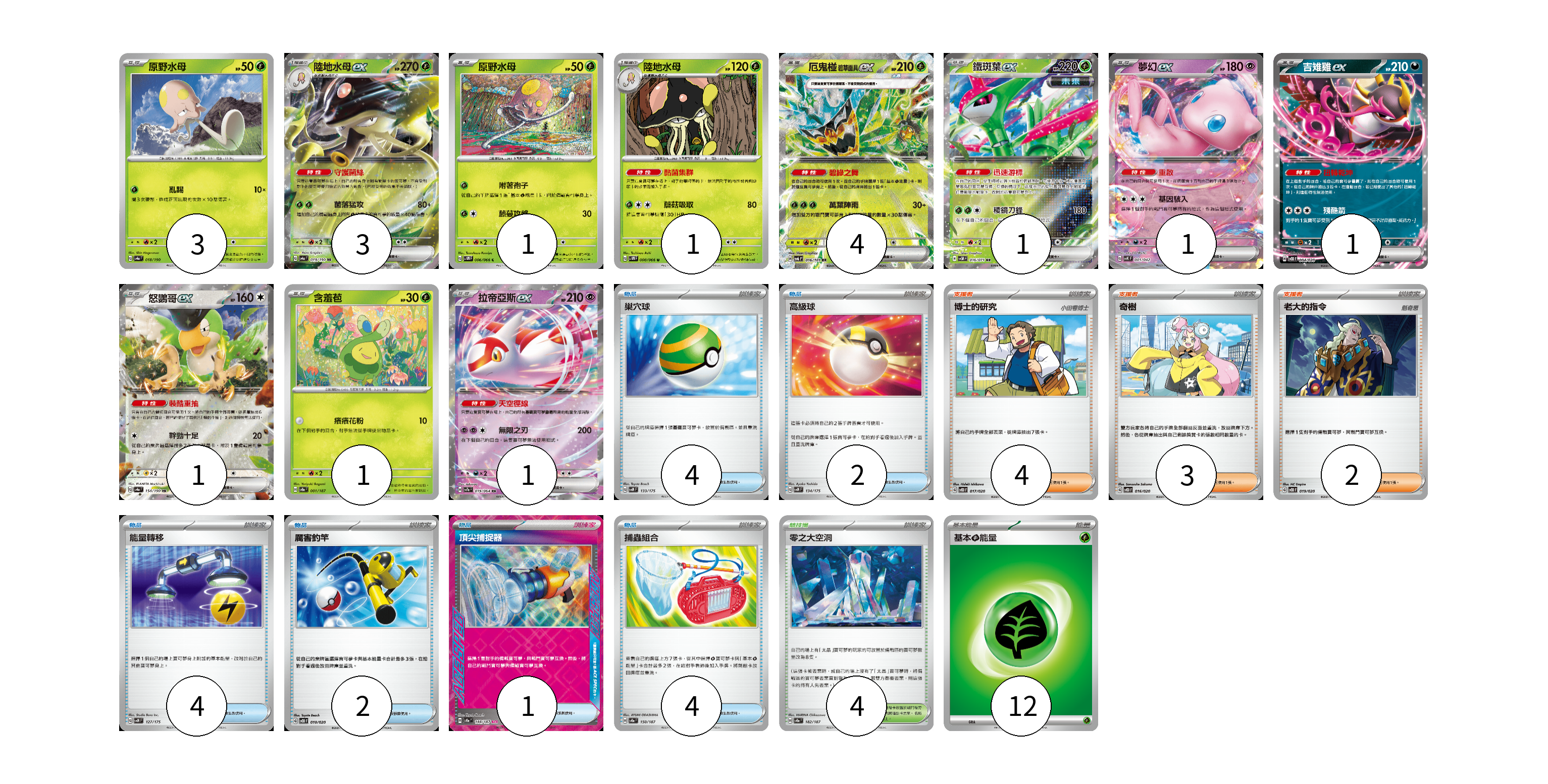 牌組構築方案 以此牌組為基礎新構築牌組 顯示卡面 顯示列表 寶可夢卡(18) 3 3 1 1 4 1 1 1 1 1 1 物品卡(17) 4 2 4 2 1 4 支援者卡(9) 4 3 2 競技場卡(4) 4 能量卡(12) 12 寶可夢卡(18) 卡牌名稱 張數 卡牌名稱 張數 原野水母 SV4a 018/190 03 陸地水母ex SV4a 019/190 03 原野水母 SV4M 006/066 01 陸地水母 SV4M 008/066 01 厄鬼椪 碧草面具ex SV6 016/101 04 鐵斑葉ex SV5M 016/071 01 夢幻ex SVK 001/042 01 吉雉雞ex SVOD 004/020 01 怒鸚哥ex SV4a 154/190 01 含羞苞 SV8a 001/187 01 拉帝亞斯ex SV7a 019/064 01 物品卡(17) 卡牌名稱 張數 卡牌名稱 張數 巢穴球 SVM 133/175 04 高級球 SVM 134/175 02 能量轉移 SVM 127/175 04 厲害釣竿 SVOD 010/020 02 頂尖捕捉器 SV8a 148/187 01 捕蟲組合 SV8a 150/187 04 支援者卡(9) 卡牌名稱 張數 卡牌名稱 張數 博士的研究 SVOD 017/020 04 奇樹 SVOD 016/020 03 老大的指令 SVOD 019/020 02 競技場卡(4) 卡牌名稱 張數 卡牌名稱 張數 零之大空洞 SV8a 182/187 04 能量卡(12) 卡牌名稱 張數 卡牌名稱 張數 基本【草】能量 SVTM GRA 12 以此牌組為基礎新構築牌組 牌組編碼 qzVOrd-HEDUQc-XbAxYL copy 列印牌組單 牌組編碼已複製 分享至SNS