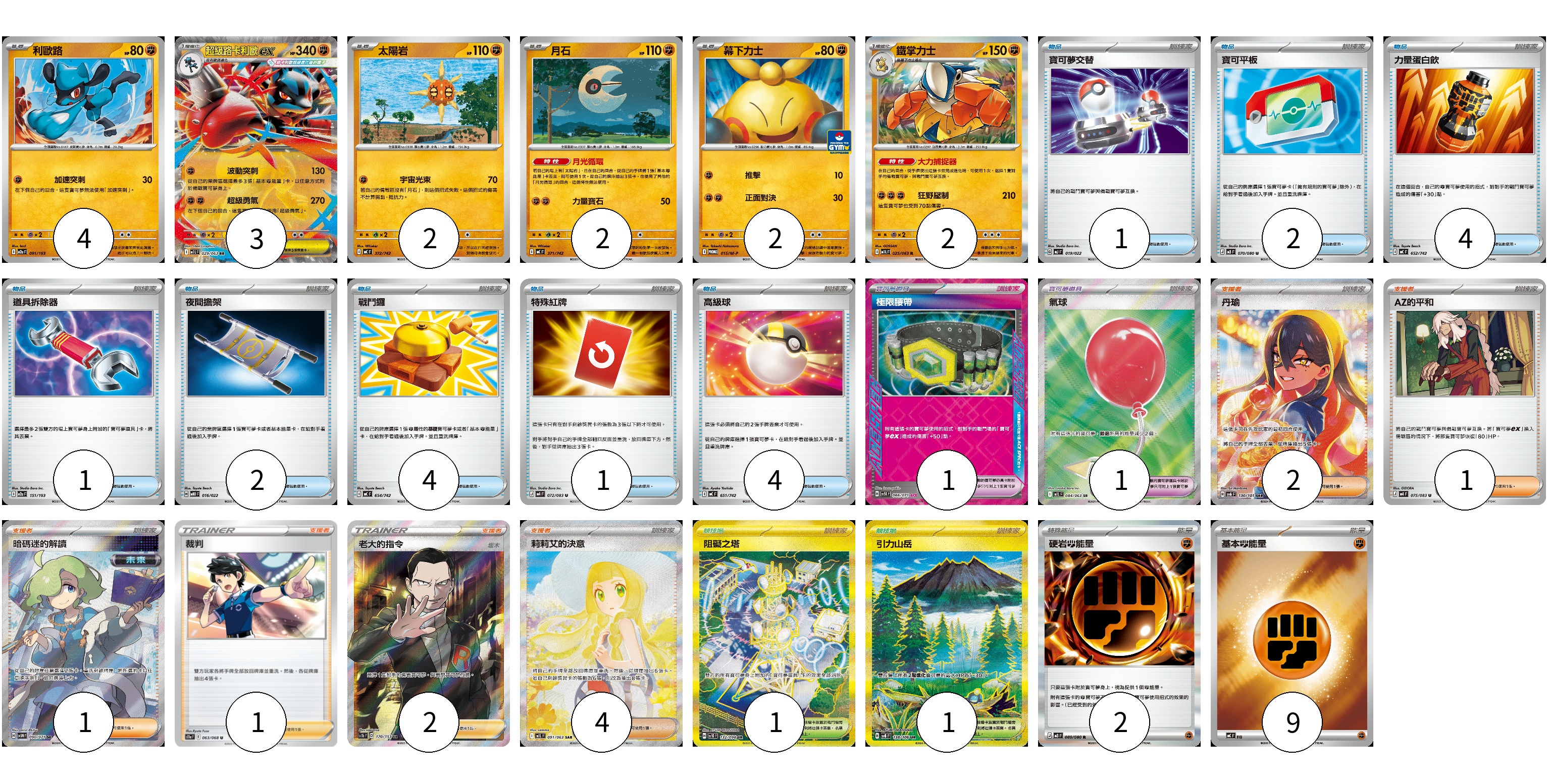 牌組構築方案 以此牌組為基礎新構築牌組 顯示卡面 顯示列表 寶可夢卡(15) 4 3 2 2 2 2 寶可夢道具(2) 1 1 物品卡(19) 1 2 4 1 2 4 1 4 支援者卡(11) 2 1 1 1 2 4 競技場卡(2) 1 1 能量卡(11) 2 9 寶可夢卡(15) 卡牌名稱 張數 卡牌名稱 張數 利歐路 M2a 091/193 04 超級路卡利歐ex M1L 029/063 03 太陽岩 MC 372/742 02 月石 MC 371/742 02 幕下力士 M-P 015/M-P 02 鐵掌力士 M1L 025/063 02 寶可夢道具(2) 卡牌名稱 張數 卡牌名稱 張數 極限腰帶 SV5K 066/071 01 氣球 M1L 084/063 01 物品卡(19) 卡牌名稱 張數 卡牌名稱 張數 寶可夢交替 MJ 019/022 01 寶可平板 M3 070/080 02 力量蛋白飲 MC 652/742 04 道具拆除器 M2a 151/193 01 夜間擔架 MBD 016/022 02 戰鬥鑼 MC 654/742 04 特殊紅牌 M4 072/083 01 高級球 MC 651/742 04 支援者卡(11) 卡牌名稱 張數 卡牌名稱 張數 丹瑜 SV6 130/101 02 AZ的平和 M4 075/083 01 暗碼迷的解讀 SV5M 090/071 01 裁判 S11a 063/068 01 老大的指令(坂木) SC1b 170/153 02 莉莉艾的決意 M1L 091/063 04 競技場卡(2) 卡牌名稱 張數 卡牌名稱 張數 阻礙之塔 SV10 132/098 01 引力山岳 SV8 138/106 01 能量卡(11) 卡牌名稱 張數 卡牌名稱 張數 硬岩【鬥】能量 M3 080/080 02 基本【鬥】能量 MC FIG 09 以此牌組為基礎新構築牌組 牌組編碼 qzoRxA-awDwMa-FBDiXa copy 列印牌組單 牌組編碼已複製 分享至SNS