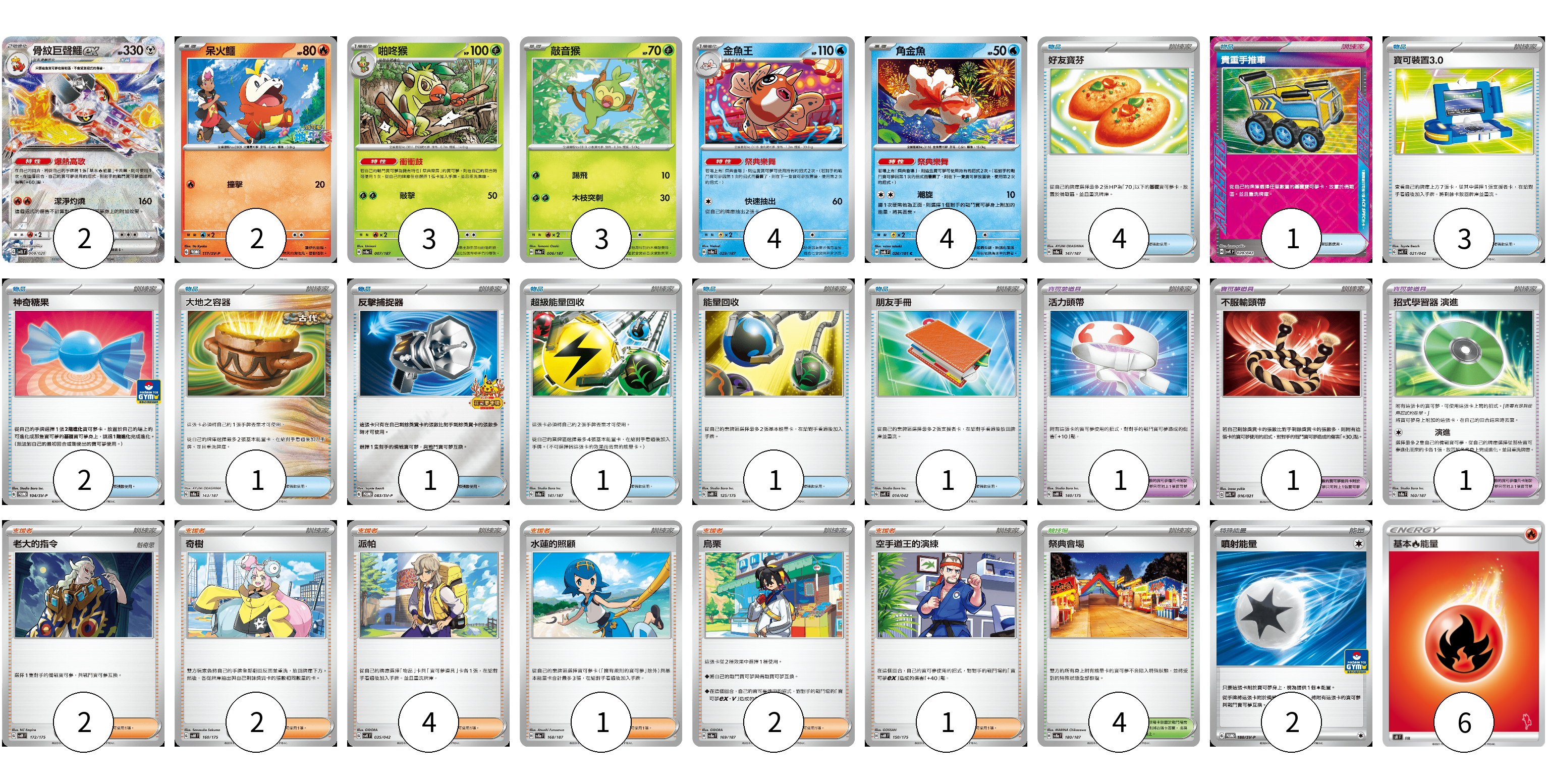 牌組構築方案 以此牌組為基礎新構築牌組 顯示卡面 顯示列表 寶可夢卡(18) 2 2 3 3 4 4 寶可夢道具(3) 1 1 1 物品卡(15) 4 1 3 2 1 1 1 1 1 支援者卡(12) 2 2 4 1 2 1 競技場卡(4) 4 能量卡(8) 2 6 寶可夢卡(18) 卡牌名稱 張數 卡牌名稱 張數 骨紋巨聲鱷ex SVEL 008/020 02 呆火鱷 SV-P 117/SV-P 02 啪咚猴 SV8a 007/187 03 敲音猴 SV8a 006/187 03 金魚王 SV8a 029/187 04 角金魚 SV6 026/101 04 寶可夢道具(3) 卡牌名稱 張數 卡牌名稱 張數 活力頭帶 SVM 140/175 01 不服輸頭帶 SVTL 016/021 01 招式學習器 演進 SV8a 160/187 01 物品卡(15) 卡牌名稱 張數 卡牌名稱 張數 好友寶芬 SV8a 147/187 04 貴重手推車 SVK 020/042 01 寶可裝置3.0 SVK 021/042 03 神奇糖果 SV-P 104/SV-P 02 大地之容器 SV8a 143/187 01 反擊捕捉器 SV-P 083/SV-P 01 超級能量回收 SV8a 141/187 01 能量回收 SVM 125/175 01 朋友手冊 SVK 014/042 01 支援者卡(12) 卡牌名稱 張數 卡牌名稱 張數 老大的指令 SVM 172/175 02 奇樹 SVM 160/175 02 派帕 SVK 035/042 04 水蓮的照顧 SV8a 168/187 01 烏栗 SV8a 169/187 02 空手道王的演練 SVM 150/175 01 競技場卡(4) 卡牌名稱 張數 卡牌名稱 張數 祭典會場 SV8a 180/187 04 能量卡(8) 卡牌名稱 張數 卡牌名稱 張數 噴射能量 SV-P 180/SV-P 02 基本火能量 SH FIR 06 以此牌組為基礎新構築牌組 牌組編碼 rCYntj-fcGKgJ-HNUWQA copy 列印牌組單 牌組編碼已複製 分享至SNS