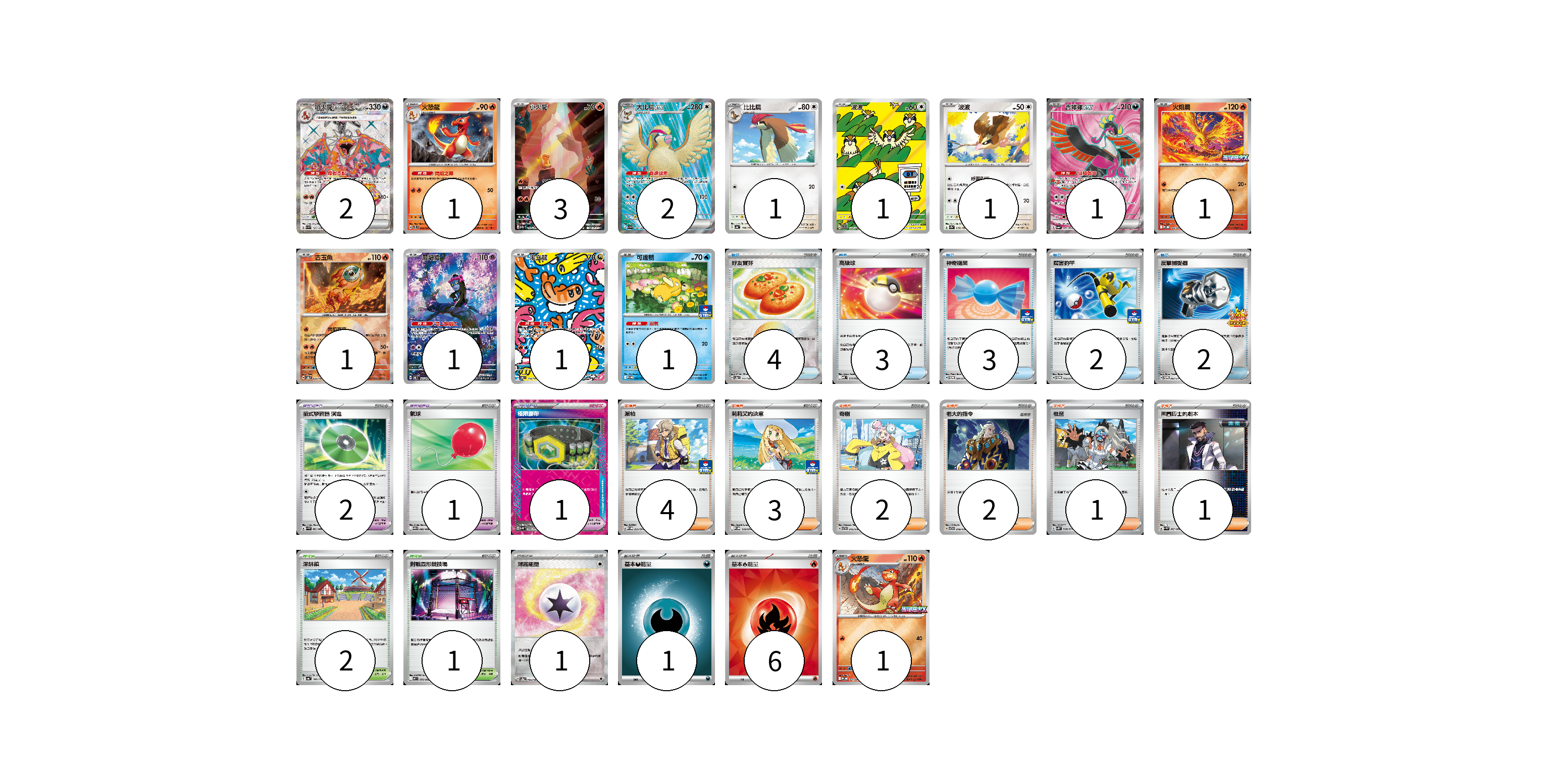 牌組構築方案 以此牌組為基礎新構築牌組 顯示卡面 顯示列表 寶可夢卡(18) 2 1 3 2 1 1 1 1 1 1 1 1 1 1 寶可夢道具(4) 2 1 1 物品卡(14) 4 3 3 2 2 支援者卡(13) 4 3 2 2 1 1 競技場卡(3) 2 1 能量卡(8) 1 1 6 寶可夢卡(18) 卡牌名稱 張數 卡牌名稱 張數 噴火龍ex SV3 125/108 02 火恐龍 SVTL 002/021 01 小火龍 SV2a 168/165 03 大比鳥ex SV3 128/108 02 比比鳥 SV4a 138/190 01 波波 SV3 118/108 01 波波 SV2a 016/165 01 吉雉雞ex SV6a 081/064 01 火焰鳥 M-P 022/M-P 01 古玉魚 SV8a 025/187 01 願增猿 SV6 107/101 01 米立龍 SV6 112/101 01 可達鴨 SV-P 220/SV-P 01 火恐龍 M-P 021/M-P 01 寶可夢道具(4) 卡牌名稱 張數 卡牌名稱 張數 招式學習器 演進 SV4M 063/066 02 氣球 SV11B 082/086 01 極限腰帶 SV5K 066/071 01 物品卡(14) 卡牌名稱 張數 卡牌名稱 張數 好友寶芬 SV8a 147/187 04 高級球 MBD 014/022 03 神奇糖果 SV-P 104/SV-P 03 厲害釣竿 SV-P 112/SV-P 02 反擊捕捉器 SV-P 083/SV-P 02 支援者卡(13) 卡牌名稱 張數 卡牌名稱 張數 派帕 SV-P 213/SV-P 04 莉莉艾的決意 M-P 018/M-P 03 奇樹 SVTH 015/018 02 老大的指令 SVTG 019/019 02 枇琶 SV5K 068/071 01 弗圖博士的劇本 SV4M 065/066 01 競技場卡(3) 卡牌名稱 張數 卡牌名稱 張數 深缽鎮 SV4a 185/190 02 對戰圓形競技場 M2 079/080 01 能量卡(8) 卡牌名稱 張數 卡牌名稱 張數 薄霧能量 SV8a 186/187 01 基本【惡】能量 MBG DAR 01 基本【火】能量 SVQL FIR 06 以此牌組為基礎新構築牌組 牌組編碼 rCYrQl-AxYZUB-obwIWu copy 列印牌組單 牌組編碼已複製 分享至SNS