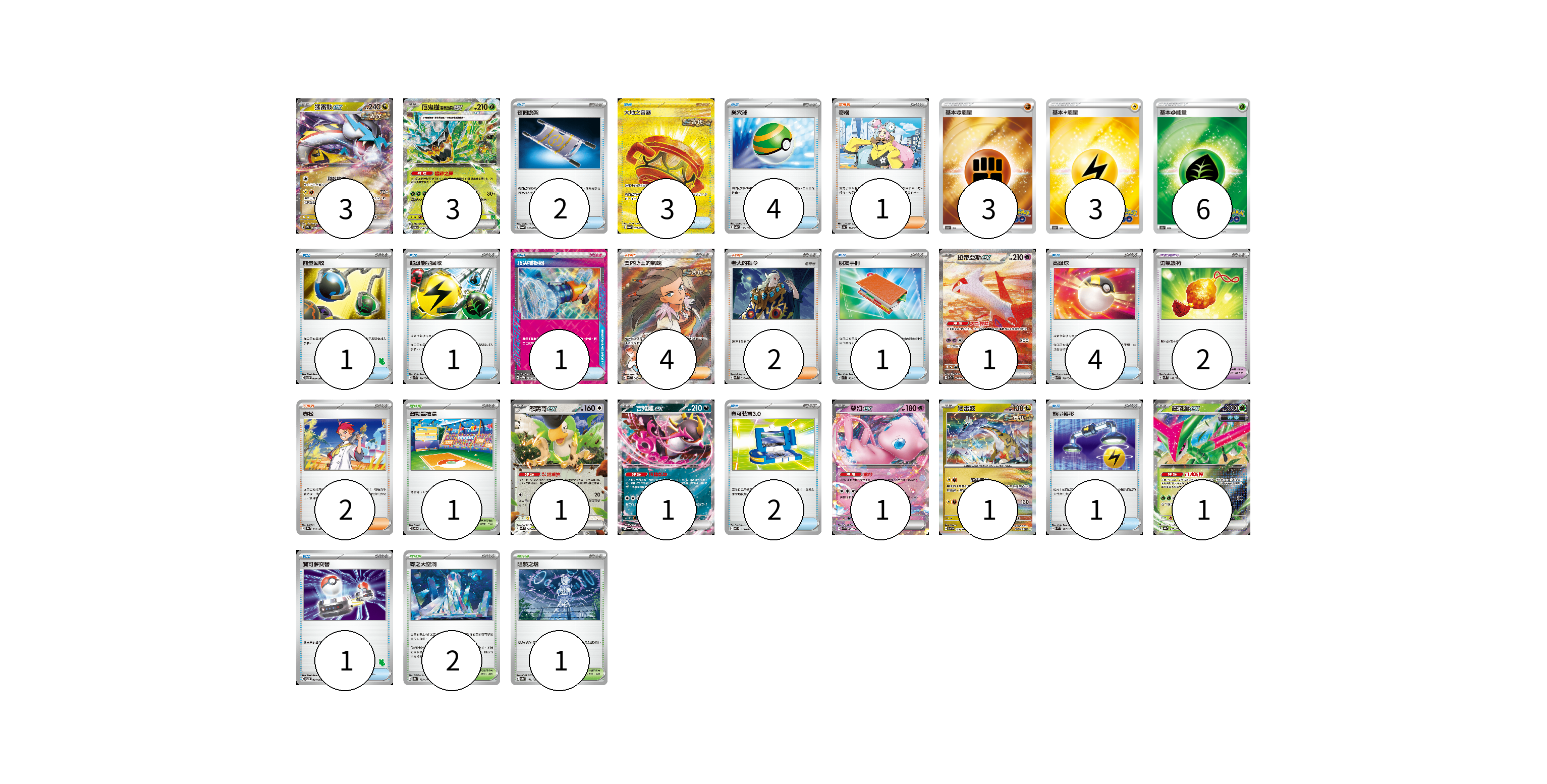 牌組構築方案 以此牌組為基礎新構築牌組 顯示卡面 顯示列表 寶可夢卡(12) 3 3 1 1 1 1 1 1 寶可夢道具(2) 2 物品卡(21) 2 3 4 1 1 1 1 4 2 1 1 支援者卡(9) 1 4 2 2 競技場卡(4) 1 2 1 能量卡(12) 3 3 6 寶可夢卡(12) 卡牌名稱 張數 卡牌名稱 張數 猛雷鼓ex SV5K 053/071 03 厄鬼椪 碧草面具ex SV6 016/101 03 拉帝亞斯ex SV7a 087/064 01 怒鸚哥ex SVK 006/042 01 吉雉雞ex SV6a 038/064 01 夢幻ex SVK 001/042 01 猛雷鼓 SV7 075/102 01 鐵斑葉ex SV8a 016/187 01 寶可夢道具(2) 卡牌名稱 張數 卡牌名稱 張數 勇氣護符 SVM 142/175 02 物品卡(21) 卡牌名稱 張數 卡牌名稱 張數 夜間擔架 SV6a 056/064 02 大地之容器 SV6a 093/064 03 巢穴球 SV4a 159/190 04 能量回收 SVI 049/066 01 超級能量回收 SVK 010/042 01 頂尖捕捉器 SV5M 062/071 01 朋友手冊 SV1S 069/078 01 高級球 SVK 018/042 04 寶可裝置3.0 SVEL 014/020 02 能量轉移 SVM 127/175 01 寶可夢交替 SVI 054/066 01 支援者卡(9) 卡牌名稱 張數 卡牌名稱 張數 奇樹 SV4a 174/190 01 奧琳博士的氣魄 SV4K 085/066 04 老大的指令 SVK 036/042 02 赤松 SV8a 163/187 02 競技場卡(4) 卡牌名稱 張數 卡牌名稱 張數 激動競技場 SV8 105/106 01 零之大空洞 SV8a 182/187 02 阻礙之塔 SV8a 181/187 01 能量卡(12) 卡牌名稱 張數 卡牌名稱 張數 基本鬥能量 S10b FIG 03 基本雷能量 S10b LIG 03 基本草能量 S10b GRA 06 以此牌組為基礎新構築牌組 牌組編碼 rFAQpj-yAhJeK-jDhFuv copy 列印牌組單 牌組編碼已複製 分享至SNS
