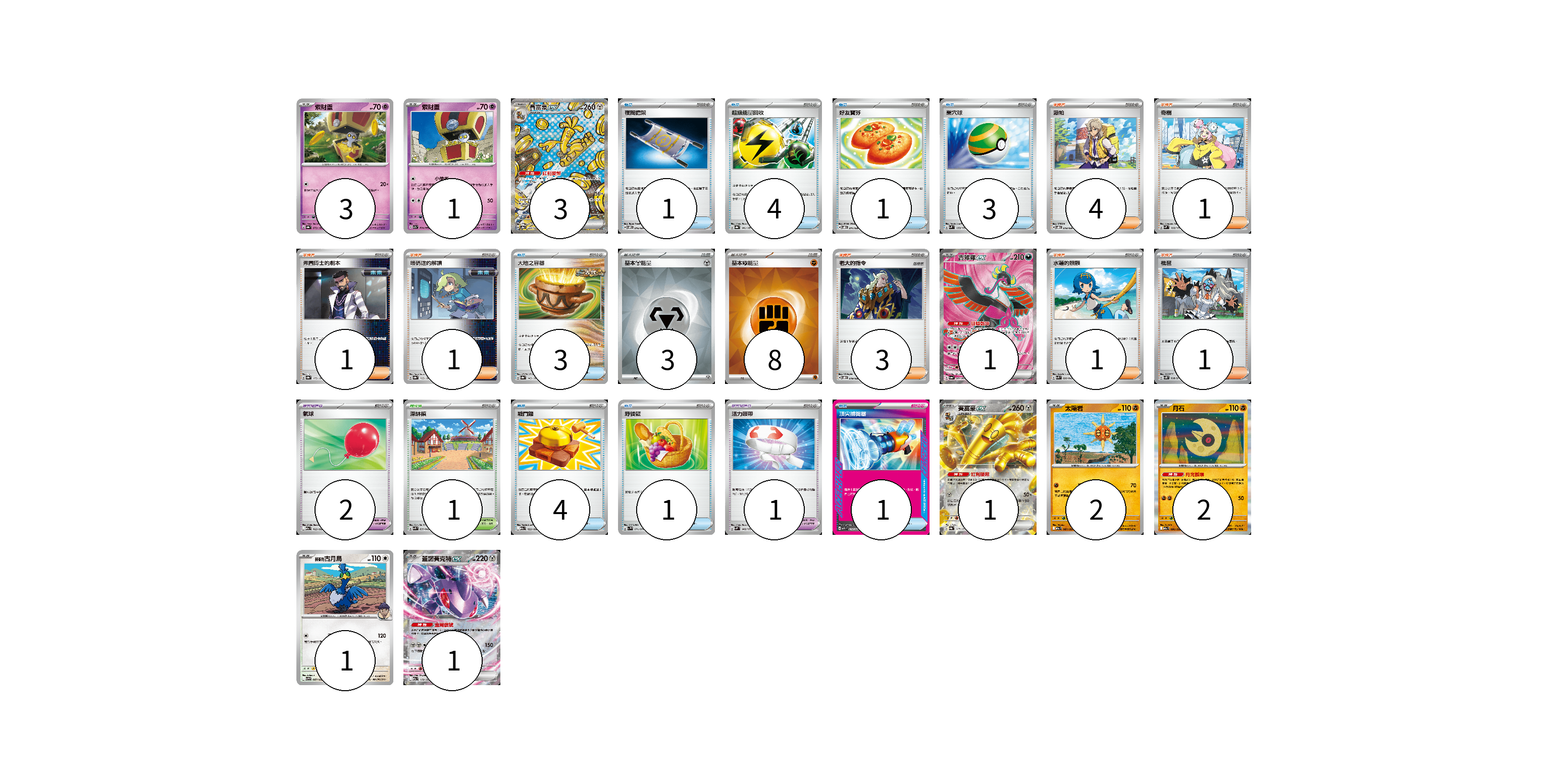 牌組構築方案 以此牌組為基礎新構築牌組 顯示卡面 顯示列表 寶可夢卡(15) 3 1 3 1 1 2 2 1 1 寶可夢道具(3) 2 1 物品卡(18) 1 4 1 3 3 4 1 1 支援者卡(12) 4 1 1 1 3 1 1 競技場卡(1) 1 能量卡(11) 3 8 寶可夢卡(15) 卡牌名稱 張數 卡牌名稱 張數 索財靈 SV8a 073/187 03 索財靈 SV7a 024/064 01 賽富豪ex SV8a 220/187 03 吉雉雞ex SV6a 081/064 01 賽富豪ex SV8a 117/187 01 太陽岩 M2a 087/193 02 月石 M2a 086/193 02 赫普的古月鳥 SV9 087/100 01 蓋諾賽克特ex M2a 119/193 01 寶可夢道具(3) 卡牌名稱 張數 卡牌名稱 張數 氣球 M2a 165/193 02 活力頭帶 SVM 140/175 01 物品卡(18) 卡牌名稱 張數 卡牌名稱 張數 夜間擔架 SVOM 016/021 01 超級能量回收 SV8a 141/187 04 好友寶芬 SVOD 011/020 01 巢穴球 SVM 133/175 03 大地之容器 SV8a 143/187 03 戰鬥鑼 M2a 155/193 04 野餐籃 SV1V 071/078 01 頂尖捕捉器 MBG 014/022 01 支援者卡(12) 卡牌名稱 張數 卡牌名稱 張數 派帕 SVOD 018/020 04 奇樹 SVM 160/175 01 弗圖博士的劇本 SV8a 175/187 01 暗碼迷的解讀 SV8a 165/187 01 老大的指令 SVOD 019/020 03 水蓮的照顧 SVK 028/042 01 枇琶 SV5K 068/071 01 競技場卡(1) 卡牌名稱 張數 卡牌名稱 張數 深缽鎮 SVK 039/042 01 能量卡(11) 卡牌名稱 張數 卡牌名稱 張數 基本【鋼】能量 SVOD MET 03 基本【鬥】能量 SVK FIG 08 以此牌組為基礎新構築牌組 牌組編碼 rFiXFY-ONplSA-YOLrRX copy 列印牌組單 牌組編碼已複製 分享至SNS