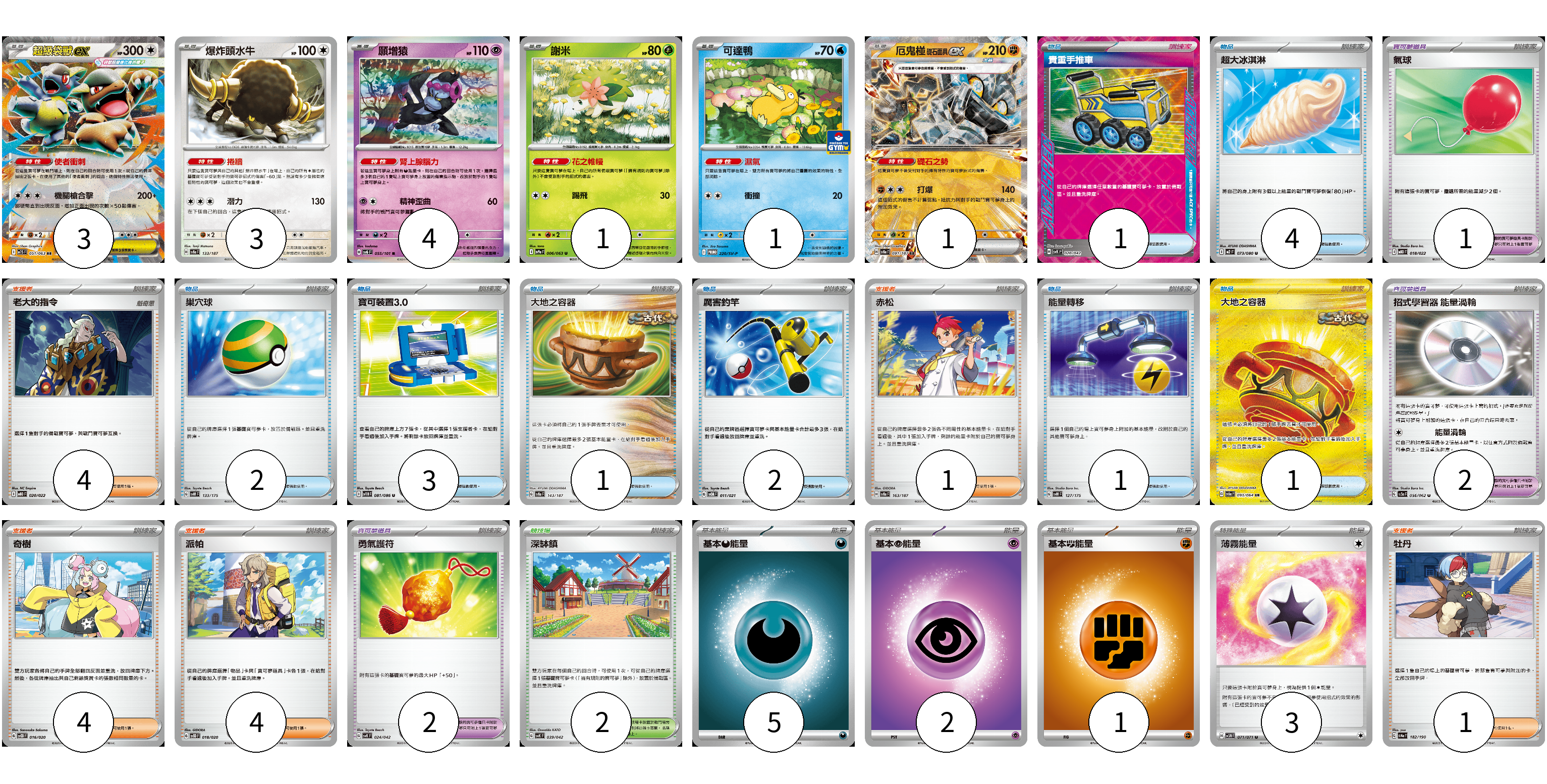 牌組構築方案 以此牌組為基礎新構築牌組 顯示卡面 顯示列表 寶可夢卡(13) 3 3 4 1 1 1 寶可夢道具(5) 1 2 2 物品卡(15) 1 4 2 3 1 2 1 1 支援者卡(14) 4 1 4 4 1 競技場卡(2) 2 能量卡(11) 5 2 1 3 寶可夢卡(13) 卡牌名稱 張數 卡牌名稱 張數 超級袋獸ex M1S 051/063 03 爆炸頭水牛 SV8a 133/187 03 願增猿 SV6 055/101 04 謝米 SV9a 006/063 01 可達鴨 SV-P 220/SV-P 01 厄鬼椪 礎石面具ex SV8a 091/187 01 寶可夢道具(5) 卡牌名稱 張數 卡牌名稱 張數 氣球 MBD 018/022 01 招式學習器 能量渦輪 SV3a 056/062 02 勇氣護符 SVK 024/042 02 物品卡(15) 卡牌名稱 張數 卡牌名稱 張數 貴重手推車 SVK 020/042 01 超大冰淇淋 M2 073/080 04 巢穴球 SVM 133/175 02 寶可裝置3.0 SV11B 081/086 03 大地之容器 SV8a 143/187 01 厲害釣竿 SVOM 011/021 02 能量轉移 SVM 127/175 01 大地之容器 SV6a 093/064 01 支援者卡(14) 卡牌名稱 張數 卡牌名稱 張數 老大的指令 MBD 020/022 04 赤松 SV8a 163/187 01 奇樹 SVOD 016/020 04 派帕 SVOD 018/020 04 牡丹 SV4a 182/190 01 競技場卡(2) 卡牌名稱 張數 卡牌名稱 張數 深缽鎮 SVK 039/042 02 能量卡(11) 卡牌名稱 張數 卡牌名稱 張數 基本【惡】能量 M-P DAR 05 基本【超】能量 M-P PSY 02 基本【鬥】能量 M-P FIG 01 薄霧能量 SV5M 071/071 03 以此牌組為基礎新構築牌組 牌組編碼 rGaBXU-ulHeGX-ssYOKc copy 列印牌組單 牌組編碼已複製 分享至SNS
