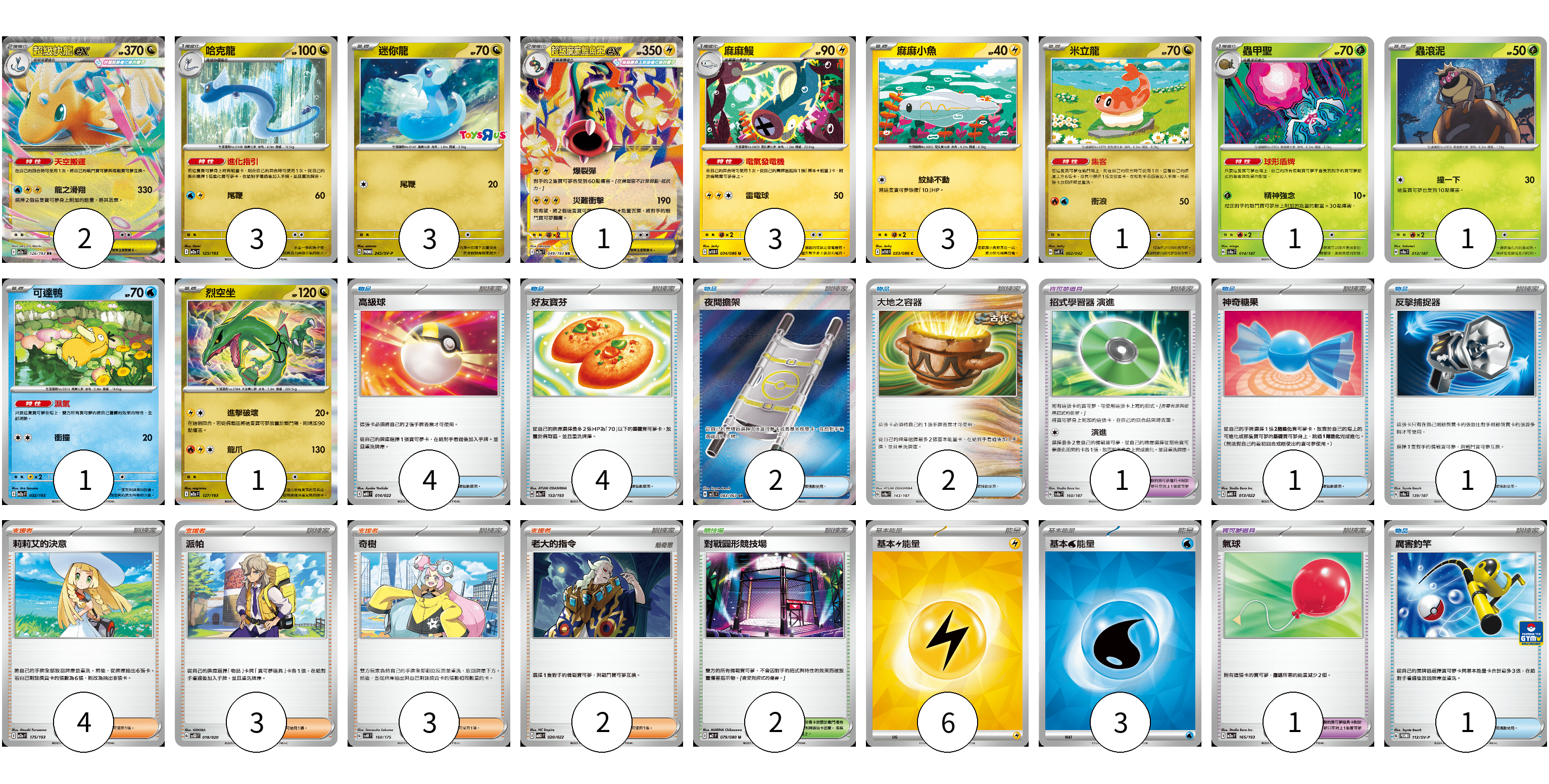 牌組構築方案 以此牌組為基礎新構築牌組 顯示卡面 顯示列表 寶可夢卡(20) 2 3 3 1 3 3 1 1 1 1 1 寶可夢道具(2) 1 1 物品卡(15) 4 4 2 2 1 1 1 支援者卡(12) 4 3 3 2 競技場卡(2) 2 能量卡(9) 6 3 寶可夢卡(20) 卡牌名稱 張數 卡牌名稱 張數 超級快龍ex M2a 126/193 02 哈克龍 M2a 125/193 03 迷你龍 SV-P 245/SV-P 03 超級麻麻鰻魚王ex M2a 049/193 01 麻麻鰻 SV11B 034/086 03 麻麻小魚 SV11B 033/086 03 米立龍 SVK 002/042 01 蟲甲聖 SV8a 014/187 01 蟲滾泥 SV8a 013/187 01 可達鴨 M2a 032/193 01 烈空坐 M2a 127/193 01 寶可夢道具(2) 卡牌名稱 張數 卡牌名稱 張數 招式學習器 演進 SV8a 160/187 01 氣球 M2a 165/193 01 物品卡(15) 卡牌名稱 張數 卡牌名稱 張數 高級球 MBD 014/022 04 好友寶芬 M2a 153/193 04 夜間擔架 M1L 083/063 02 大地之容器 SV8a 143/187 02 神奇糖果 MBG 013/022 01 反擊捕捉器 SV8a 139/187 01 厲害釣竿 SV-P 112/SV-P 01 支援者卡(12) 卡牌名稱 張數 卡牌名稱 張數 莉莉艾的決意 M2a 175/193 04 派帕 SVOD 018/020 03 奇樹 SVM 160/175 03 老大的指令 MBD 020/022 02 競技場卡(2) 卡牌名稱 張數 卡牌名稱 張數 對戰圓形競技場 M2 079/080 02 能量卡(9) 卡牌名稱 張數 卡牌名稱 張數 基本【雷】能量 SVQP LIG 06 基本【水】能量 SVK WAT 03 以此牌組為基礎新構築牌組 牌組編碼 rHdZpH-pucKYB-zEQiXn copy 列印牌組單 牌組編碼已複製 分享至SNS