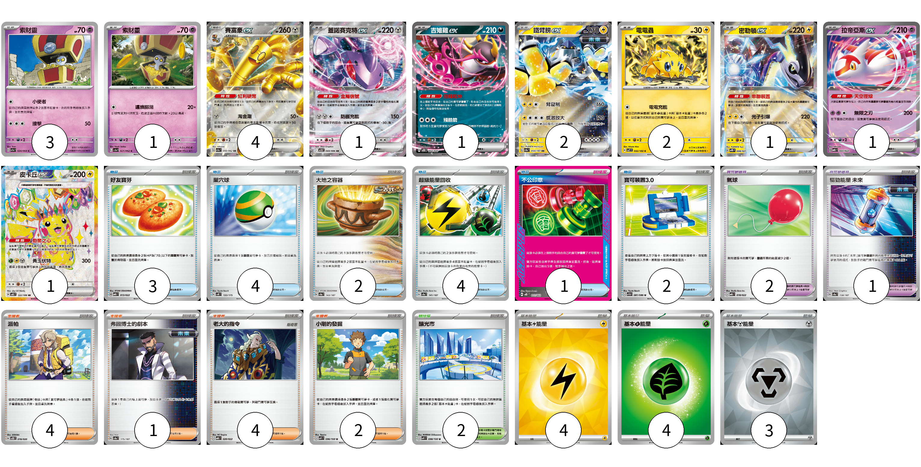 牌組構築方案 以此牌組為基礎新構築牌組 顯示卡面 顯示列表 寶可夢卡(17) 3 1 4 1 1 2 2 1 1 1 寶可夢道具(3) 2 1 物品卡(16) 3 4 2 4 1 2 支援者卡(11) 4 1 4 2 競技場卡(2) 2 能量卡(11) 4 4 3 寶可夢卡(17) 卡牌名稱 張數 卡牌名稱 張數 索財靈 SV7a 024/064 03 索財靈 SV3a 021/062 01 賽富豪ex SV3a 050/062 04 蓋諾賽克特ex SV11B 069/086 01 吉雉雞ex SVOD 004/020 01 鐵臂膀ex SV8a 054/187 02 電電蟲 SV7 032/102 02 密勒頓ex SVTR 008/021 01 拉帝亞斯ex MBD 003/022 01 皮卡丘ex SV8 122/106 01 寶可夢道具(3) 卡牌名稱 張數 卡牌名稱 張數 氣球 MBD 018/022 02 驅勁能量 未來 SV8a 158/187 01 物品卡(16) 卡牌名稱 張數 卡牌名稱 張數 好友寶芬 MBD 013/022 03 巢穴球 SVM 133/175 04 大地之容器 SV8a 143/187 02 超級能量回收 SV8a 141/187 04 不公印章 MBD 011/022 01 寶可裝置3.0 SV11B 081/086 02 支援者卡(11) 卡牌名稱 張數 卡牌名稱 張數 派帕 SVOD 018/020 04 弗圖博士的劇本 SV8a 175/187 01 老大的指令 MBD 020/022 04 小剛的發掘 SV9 096/100 02 競技場卡(2) 卡牌名稱 張數 卡牌名稱 張數 釀光市 SV9 098/100 02 能量卡(11) 卡牌名稱 張數 卡牌名稱 張數 基本【雷】能量 SVQP LIG 04 基本【草】能量 M-P GRA 04 基本【鋼】能量 SVOD MET 03 以此牌組為基礎新構築牌組 牌組編碼 rIbPEk-LZDoEm-hWBxWR copy 列印牌組單 牌組編碼已複製 分享至SNS