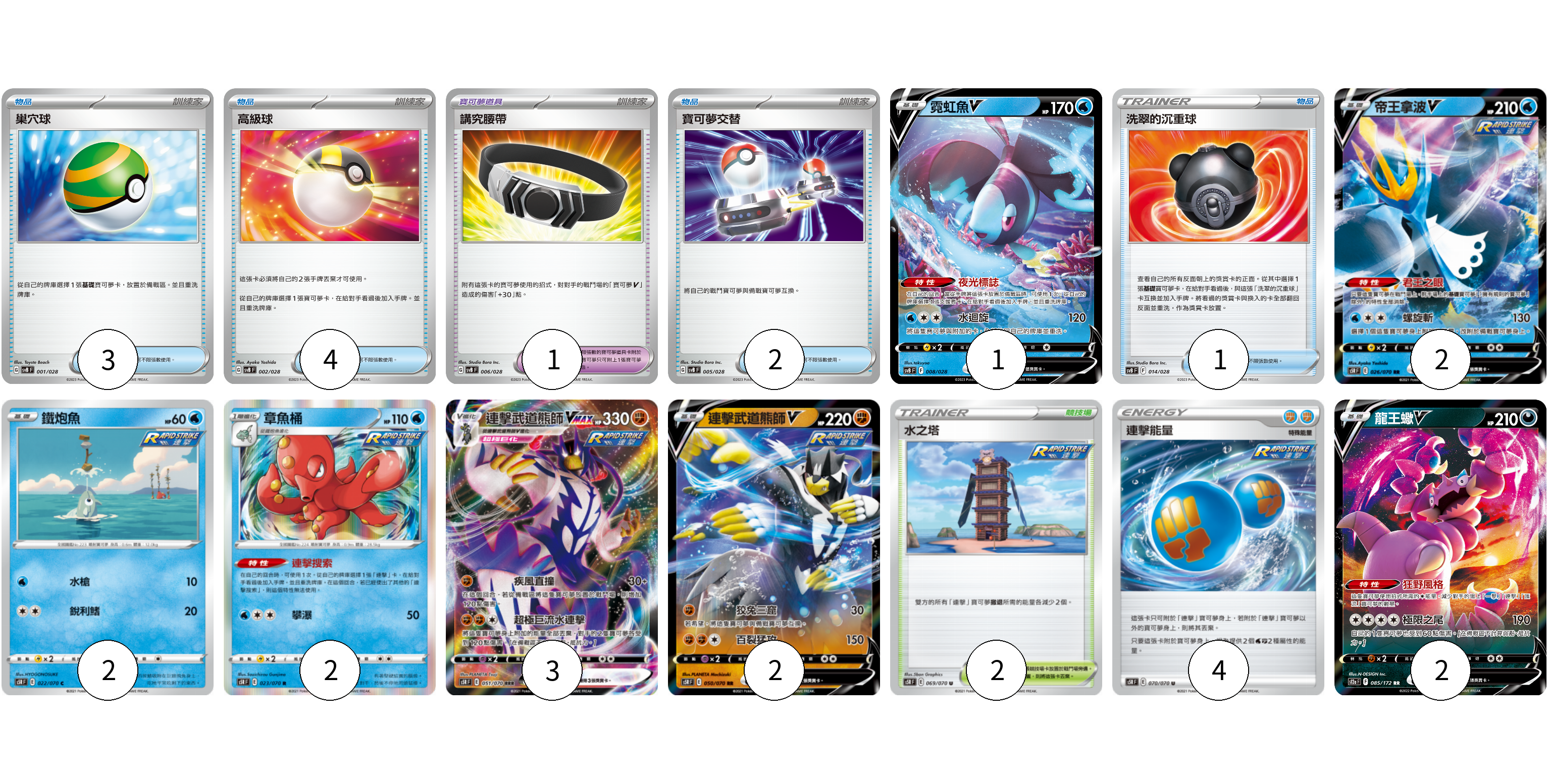 牌組構築方案 以此牌組為基礎新構築牌組 顯示卡面 顯示列表 寶可夢卡(14) 1 2 2 2 3 2 2 寶可夢道具(1) 1 物品卡(10) 3 4 2 1 競技場卡(2) 2 能量卡(4) 4 寶可夢卡(14) 卡牌名稱 張數 卡牌名稱 張數 霓虹魚V SVB 008/028 01 帝王拿波V S5R 026/070 02 鐵炮魚 S5R 022/070 02 章魚桶 S5R 023/070 02 連擊武道熊師VMAX S5R 051/070 03 連擊武道熊師V S5R 050/070 02 龍王蠍V S12a 085/172 02 寶可夢道具(1) 卡牌名稱 張數 卡牌名稱 張數 講究腰帶 SVB 006/028 01 物品卡(10) 卡牌名稱 張數 卡牌名稱 張數 巢穴球 SVB 001/028 03 高級球 SVB 002/028 04 寶可夢交替 SVB 005/028 02 洗翠的沉重球 SVB 014/028 01 競技場卡(2) 卡牌名稱 張數 卡牌名稱 張數 水之塔 S5R 069/070 02 能量卡(4) 卡牌名稱 張數 卡牌名稱 張數 連擊能量 S5R 070/070 04 以此牌組為基礎新構築牌組 牌組編碼 rIghGC-TCSDaJ-ScWfLV copy 列印牌組單 牌組編碼已複製 分享至SNS