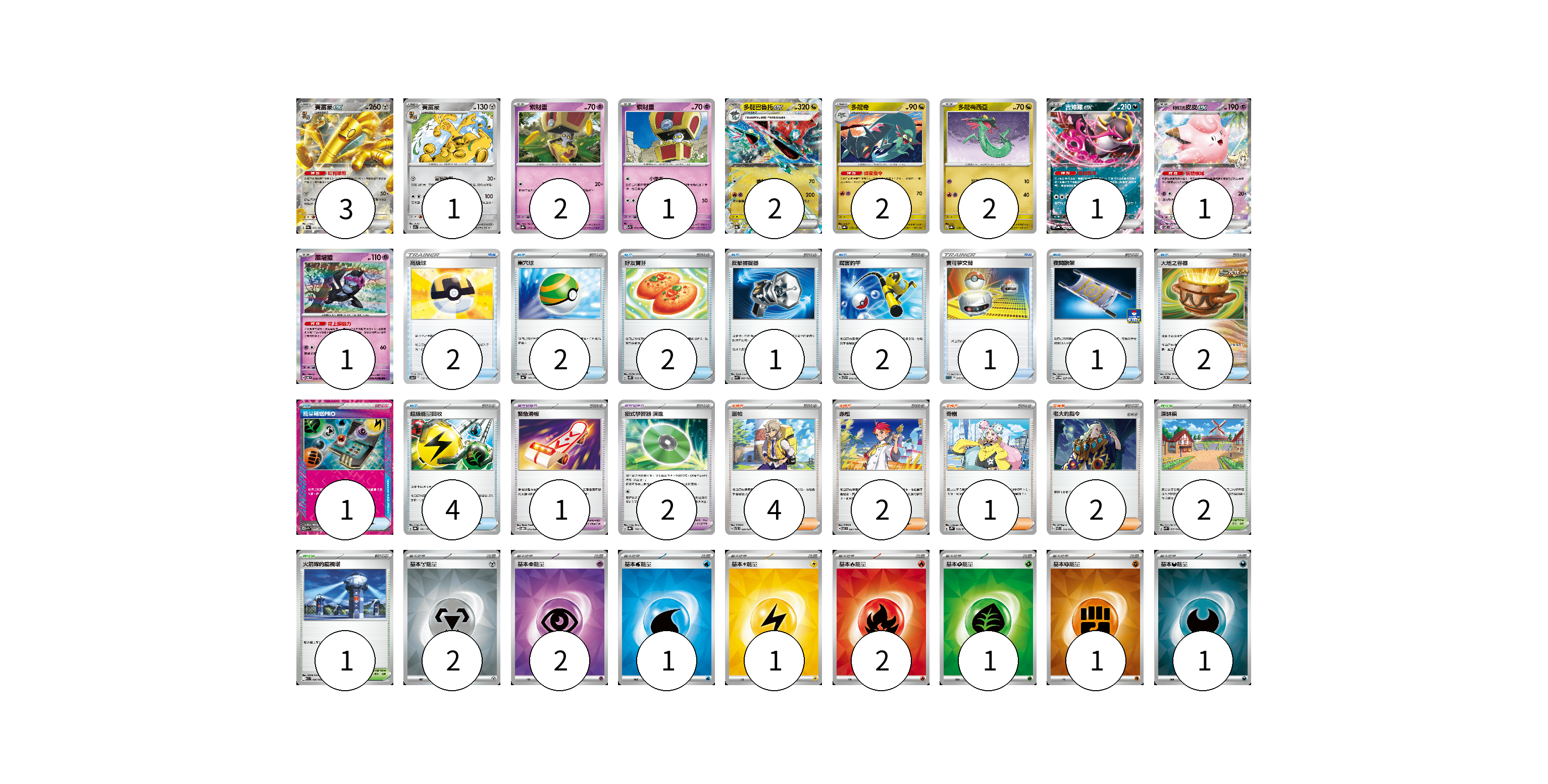 牌組構築方案 以此牌組為基礎新構築牌組 顯示卡面 顯示列表 寶可夢卡(16) 3 1 2 1 2 2 2 1 1 1 寶可夢道具(3) 1 2 物品卡(18) 2 2 2 1 2 1 1 2 1 4 支援者卡(9) 4 2 1 2 競技場卡(3) 2 1 能量卡(11) 2 2 1 1 2 1 1 1 寶可夢卡(16) 卡牌名稱 張數 卡牌名稱 張數 賽富豪ex SV3a 050/062 03 賽富豪 SV7a 038/064 01 索財靈 SV8a 073/187 02 索財靈 SV7a 024/064 01 多龍巴魯托ex SV8a 120/187 02 多龍奇 SV8a 119/187 02 多龍梅西亞 SV8a 118/187 02 吉雉雞ex SV8a 104/187 01 莉莉艾的皮皮ex SV9 033/100 01 願增猿 SV6 055/101 01 寶可夢道具(3) 卡牌名稱 張數 卡牌名稱 張數 緊急滑板 SVOD 015/020 01 招式學習器 演進 SV8a 160/187 02 物品卡(18) 卡牌名稱 張數 卡牌名稱 張數 高級球 S12a 138/172 02 巢穴球 SV4a 159/190 02 好友寶芬 SV5K 063/071 02 反擊捕捉器 SVK 009/042 01 厲害釣竿 SVTR 012/021 02 寶可夢交替 SLD 015/020 01 夜間擔架 SV-P 227/SV-P 01 大地之容器 SVTS 011/022 02 能量輸送PRO SV7a 052/064 01 超級能量回收 SV8a 141/187 04 支援者卡(9) 卡牌名稱 張數 卡牌名稱 張數 派帕 SVTL 020/021 04 赤松 SV7 097/102 02 奇樹 SV2D 069/071 01 老大的指令 SVEL 019/020 02 競技場卡(3) 卡牌名稱 張數 卡牌名稱 張數 深缽鎮 SVK 039/042 02 火箭隊的監視塔 SV10 096/098 01 能量卡(11) 卡牌名稱 張數 卡牌名稱 張數 基本【鋼】能量 SVOD MET 02 基本【超】能量 SVOD PSY 02 基本【水】能量 SVM WAT 01 基本【雷】能量 SVM LIG 01 基本【火】能量 SVM FIR 02 基本【草】能量 SVM GRA 01 基本【鬥】能量 SVM FIG 01 基本【惡】能量 SVM DAR 01 以此牌組為基礎新構築牌組 牌組編碼 rJkXpE-TxxGCY-RPDarl copy 列印牌組單 牌組編碼已複製 分享至SNS