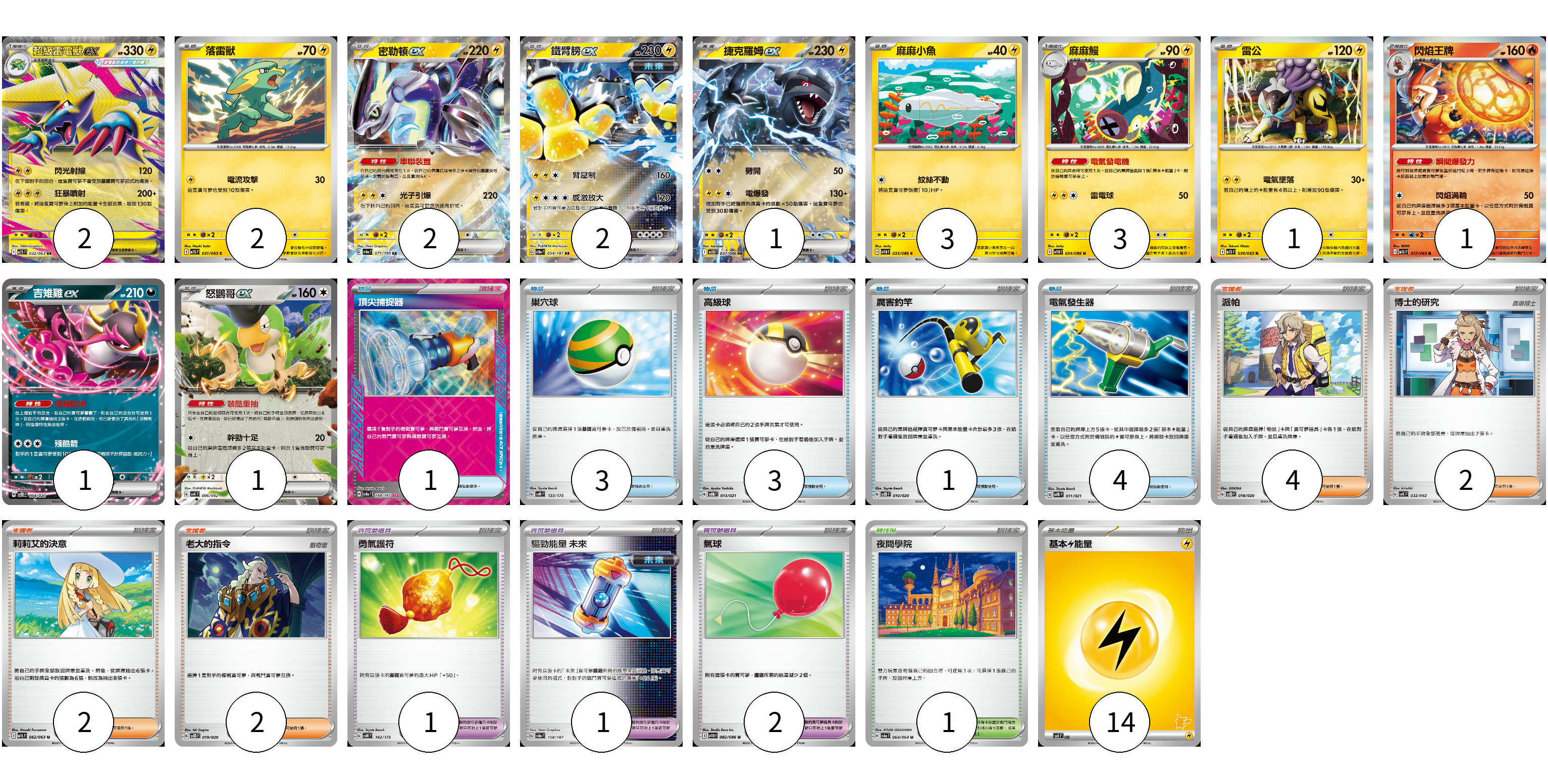 牌組構築方案 以此牌組為基礎新構築牌組 顯示卡面 顯示列表 寶可夢卡(19) 2 2 2 2 1 3 3 1 1 1 1 寶可夢道具(4) 1 1 2 物品卡(12) 1 3 3 1 4 支援者卡(10) 4 2 2 2 競技場卡(1) 1 能量卡(14) 14 寶可夢卡(19) 卡牌名稱 張數 卡牌名稱 張數 超級雷電獸ex M1S 032/063 02 落雷獸 M1S 031/063 02 密勒頓ex SV4a 071/190 02 鐵臂膀ex SV8a 054/187 02 捷克羅姆ex SV11B 037/086 01 麻麻小魚 SV11B 033/086 03 麻麻鰻 SV11B 034/086 03 雷公 M1S 030/063 01 閃焰王牌 M1L 017/063 01 吉雉雞ex SVOD 004/020 01 怒鸚哥ex SVK 006/042 01 寶可夢道具(4) 卡牌名稱 張數 卡牌名稱 張數 勇氣護符 SVM 142/175 01 驅勁能量 未來 SV8a 158/187 01 氣球 SV11B 082/086 02 物品卡(12) 卡牌名稱 張數 卡牌名稱 張數 頂尖捕捉器 SV8a 148/187 01 巢穴球 SVM 133/175 03 高級球 SVOM 013/021 03 厲害釣竿 SVOD 010/020 01 電氣發生器 SVTR 011/021 04 支援者卡(10) 卡牌名稱 張數 卡牌名稱 張數 派帕 SVOD 018/020 04 博士的研究 SVK 032/042 02 莉莉艾的決意 M1L 062/063 02 老大的指令 SVOD 019/020 02 競技場卡(1) 卡牌名稱 張數 卡牌名稱 張數 夜間學院 SV6a 064/064 01 能量卡(14) 卡牌名稱 張數 卡牌名稱 張數 基本【雷】能量 SVI LIG 14 以此牌組為基礎新構築牌組 牌組編碼 rLvTIO-fNrqSM-fWGJRf copy 列印牌組單 牌組編碼已複製 分享至SNS