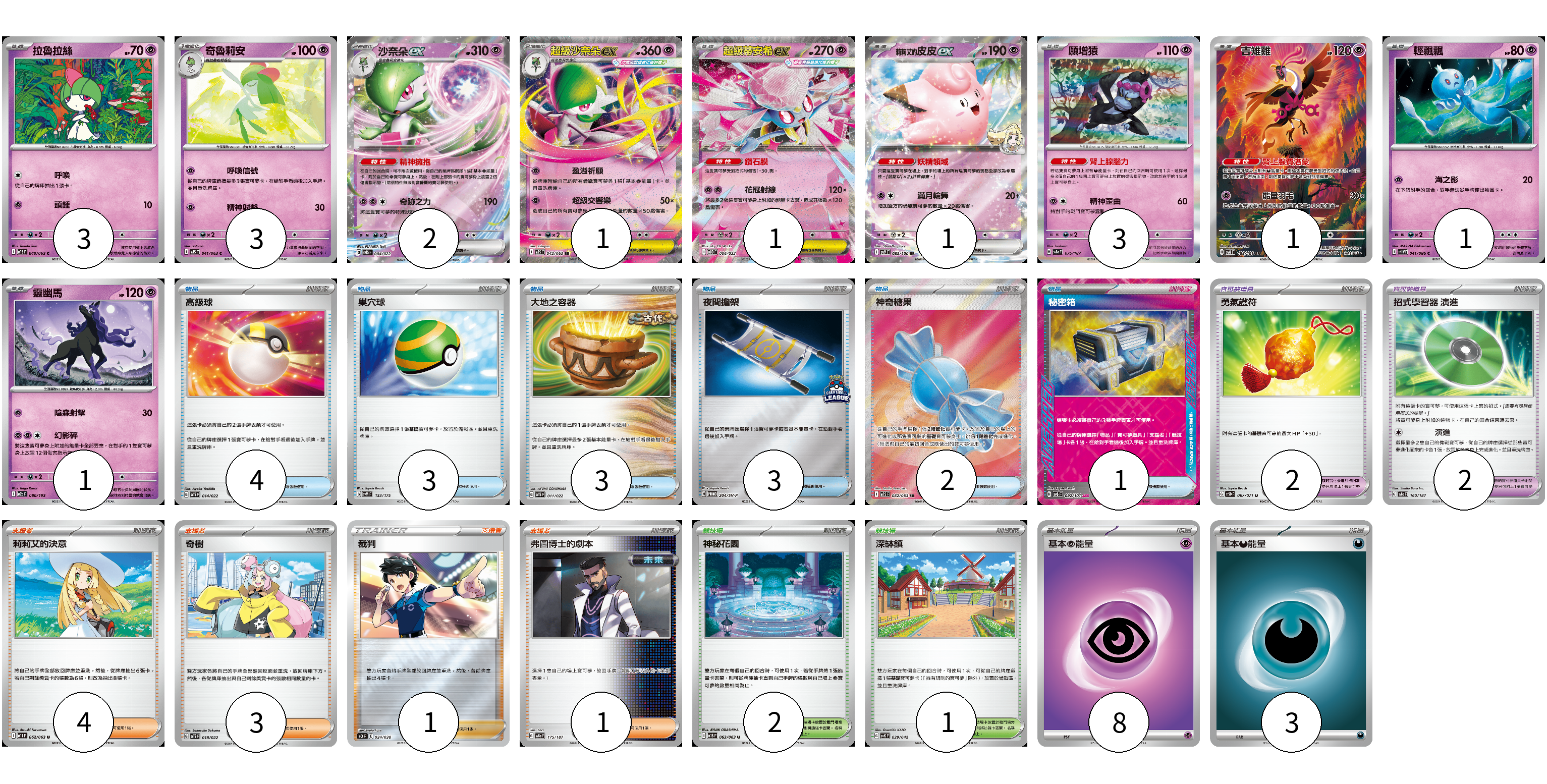 牌組構築方案 以此牌組為基礎新構築牌組 顯示卡面 顯示列表 寶可夢卡(17) 3 3 2 1 1 1 3 1 1 1 寶可夢道具(4) 2 2 物品卡(16) 4 3 3 3 2 1 支援者卡(9) 4 3 1 1 競技場卡(3) 2 1 能量卡(11) 8 3 寶可夢卡(17) 卡牌名稱 張數 卡牌名稱 張數 拉魯拉絲 M1S 040/063 03 奇魯莉安 M1S 041/063 03 沙奈朵ex SVTS 004/022 02 超級沙奈朵ex M1S 042/063 01 超級蒂安希ex MBD 006/022 01 莉莉艾的皮皮ex SV9 033/100 01 願增猿 SV8a 075/187 03 吉雉雞 SV6 108/101 01 輕飄飄 SV11W 041/086 01 靈幽馬 M2a 080/193 01 寶可夢道具(4) 卡牌名稱 張數 卡牌名稱 張數 勇氣護符 SV2D 067/071 02 招式學習器 演進 SV8a 160/187 02 物品卡(16) 卡牌名稱 張數 卡牌名稱 張數 高級球 SVTS 014/022 04 巢穴球 SVM 133/175 03 大地之容器 SVTS 011/022 03 夜間擔架 SV-P 204/SV-P 03 神奇糖果 M1S 082/063 02 秘密箱 SV6 092/101 01 支援者卡(9) 卡牌名稱 張數 卡牌名稱 張數 莉莉艾的決意 M1L 062/063 04 奇樹 SVTS 018/022 03 裁判 SO 024/030 01 弗圖博士的劇本 SV8a 175/187 01 競技場卡(3) 卡牌名稱 張數 卡牌名稱 張數 神秘花園 M1S 063/063 02 深缽鎮 SVK 039/042 01 能量卡(11) 卡牌名稱 張數 卡牌名稱 張數 基本【超】能量 SVTS PSY 08 基本惡能量 sv-p DAR 03 以此牌組為基礎新構築牌組 牌組編碼 rNNShi-nCCYTJ-IlyVUq copy 列印牌組單 牌組編碼已複製 分享至SNS