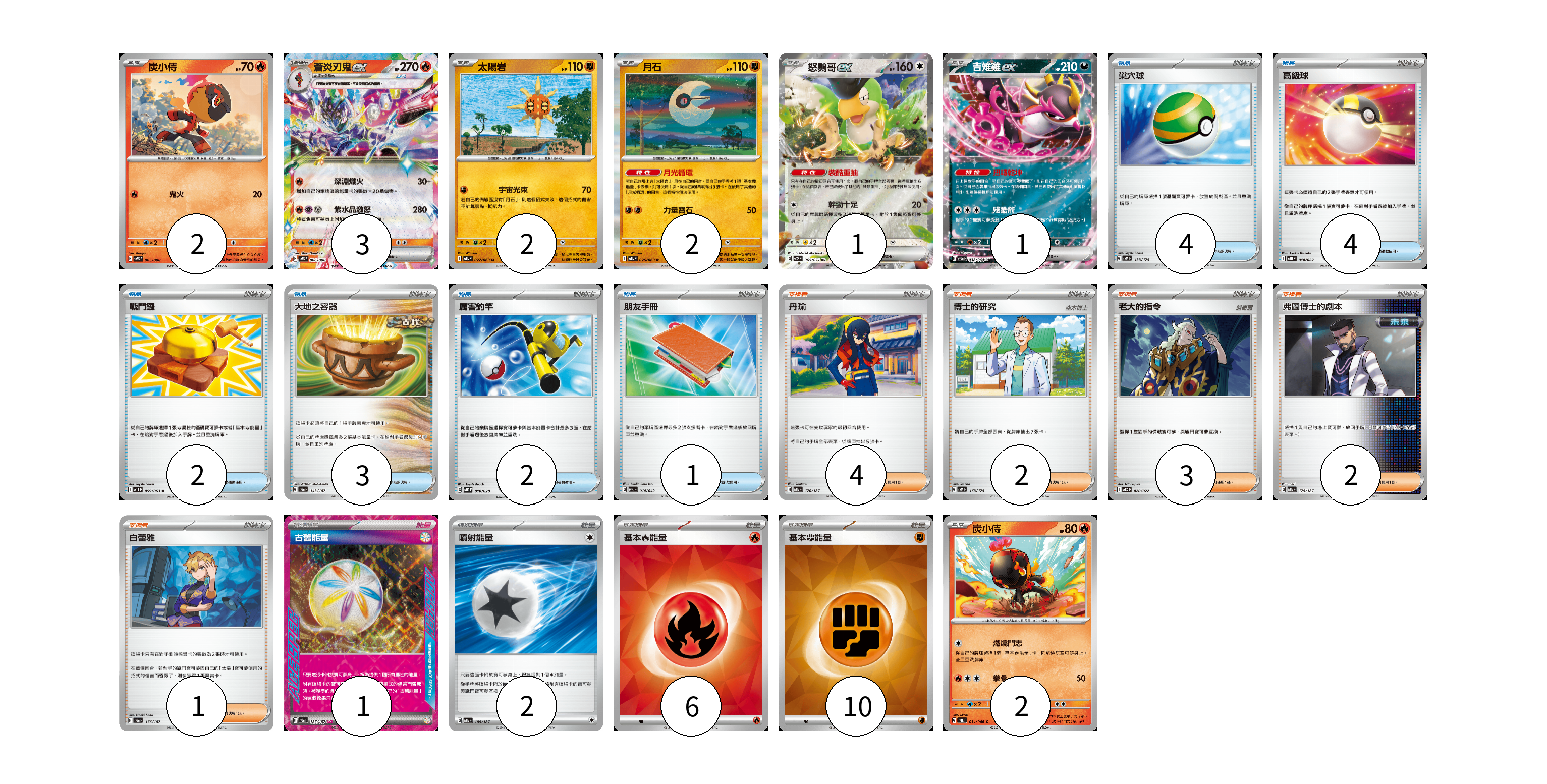 牌組構築方案 以此牌組為基礎新構築牌組 顯示卡面 顯示列表 寶可夢卡(13) 2 3 2 2 1 1 2 物品卡(16) 4 4 2 3 2 1 支援者卡(12) 4 2 3 2 1 能量卡(19) 1 2 6 10 寶可夢卡(13) 卡牌名稱 張數 卡牌名稱 張數 炭小侍 SVPS 005/008 02 蒼炎刃鬼ex SVPS 006/008 03 太陽岩 M1L 027/063 02 月石 M1L 026/063 02 怒鸚哥ex SV2P 065/071 01 吉雉雞ex SV6a 038/064 01 炭小侍 SV4K 014/066 02 物品卡(16) 卡牌名稱 張數 卡牌名稱 張數 巢穴球 SVM 133/175 04 高級球 MBD 014/022 04 戰鬥鑼 M1L 059/063 02 大地之容器 SV8a 143/187 03 厲害釣竿 SVOD 010/020 02 朋友手冊 SVK 014/042 01 支援者卡(12) 卡牌名稱 張數 卡牌名稱 張數 丹瑜 SV8a 170/187 04 博士的研究 SVM 163/175 02 老大的指令 MBD 020/022 03 弗圖博士的劇本 SV8a 175/187 02 白蕾雅 SV8a 176/187 01 能量卡(19) 卡牌名稱 張數 卡牌名稱 張數 古舊能量 SV8a 187/187 01 噴射能量 SV8a 185/187 02 基本【火】能量 SVQL FIR 06 基本【鬥】能量 SVM FIG 10 以此牌組為基礎新構築牌組 牌組編碼 rPCwFR-bmKwdc-wWMfCU copy 列印牌組單 牌組編碼已複製 分享至SNS
