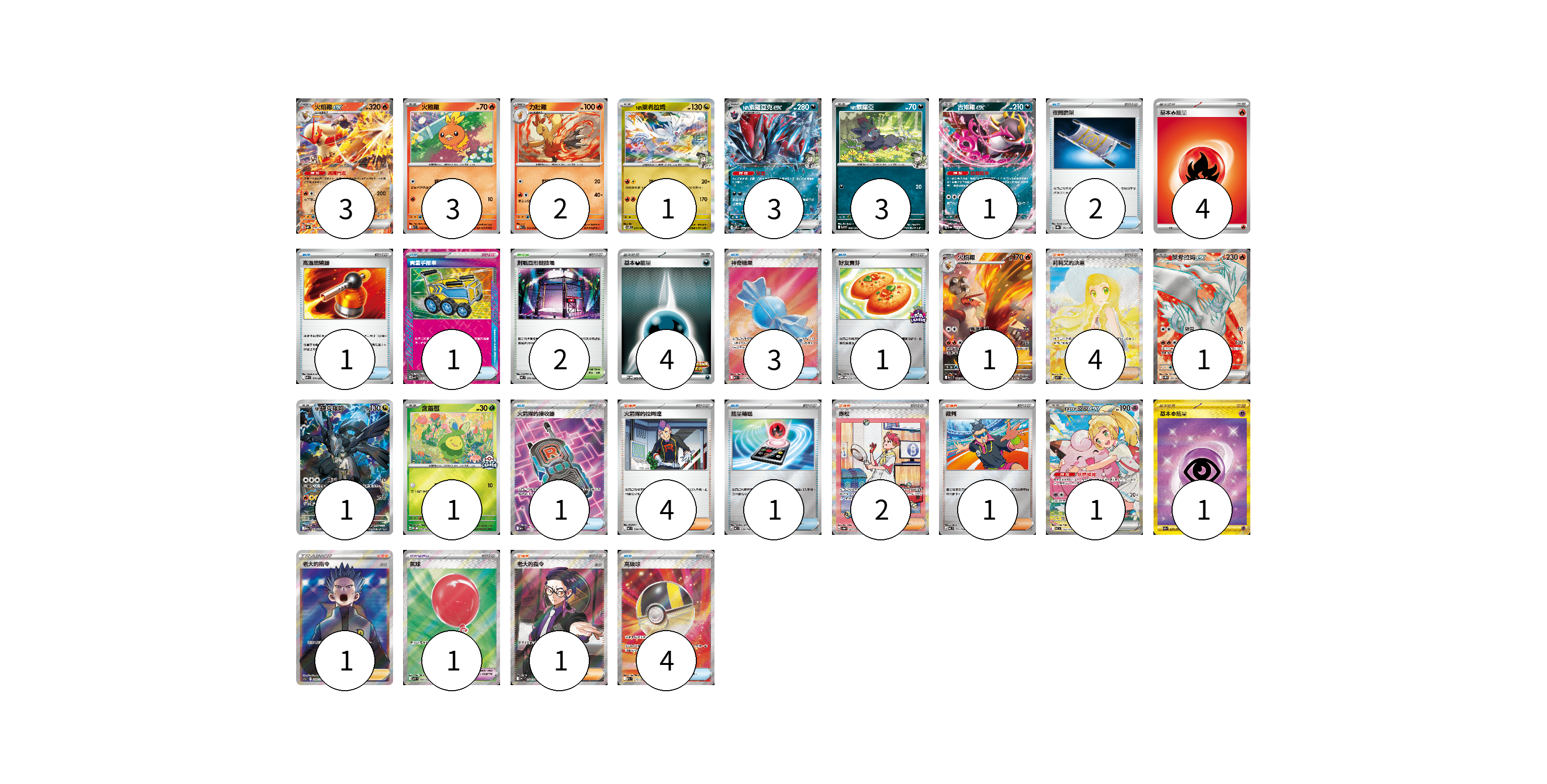 牌組構築方案 以此牌組為基礎新構築牌組 顯示卡面 顯示列表 寶可夢卡(21) 3 3 2 1 3 3 1 1 1 1 1 1 寶可夢道具(1) 1 物品卡(14) 2 1 1 3 1 1 1 4 支援者卡(13) 4 4 2 1 1 1 競技場卡(2) 2 能量卡(9) 4 4 1 寶可夢卡(21) 卡牌名稱 張數 卡牌名稱 張數 火焰雞ex SVM 016/175 03 火稚雞 SV10 018/098 03 力壯雞 SV10 019/098 02 N的萊希拉姆 SV9 074/100 01 N的索羅亞克ex SV9 061/100 03 N的索羅亞 SV9 060/100 03 吉雉雞ex SV6a 038/064 01 火焰雞 SV10 101/098 01 萊希拉姆ex SV11W 160/086 01 N的捷克羅姆 M2a 210/193 01 含羞苞 M-P 037/M-P 01 莉莉艾的皮皮ex MC 765/742 01 寶可夢道具(1) 卡牌名稱 張數 卡牌名稱 張數 氣球 M1L 084/063 01 物品卡(14) 卡牌名稱 張數 卡牌名稱 張數 夜間擔架 SV8a 151/187 02 高溫燃燒器 M2 074/080 01 貴重手推車 SVK 020/042 01 神奇糖果 M1S 082/063 03 好友寶芬 SV-P 230/SV-P 01 火箭隊的接收器 M2a 217/193 01 能量輸送 MC 639/742 01 高級球 M2a 216/193 04 支援者卡(13) 卡牌名稱 張數 卡牌名稱 張數 莉莉艾的決意 M1L 091/063 04 火箭隊的拉姆達 MC 734/742 04 赤松 SV8a 227/187 02 裁判 MC 711/742 01 老大的指令(赤日) S12a 250/172 01 老大的指令(烏羽) MC 760/742 01 競技場卡(2) 卡牌名稱 張數 卡牌名稱 張數 對戰圓形競技場 M2 079/080 02 能量卡(9) 卡牌名稱 張數 卡牌名稱 張數 基本【火】能量 SVTL FIR 04 基本【惡】能量 SV-P 263/SV-P 04 基本【超】能量 SV2a 210/165 01 以此牌組為基礎新構築牌組 牌組編碼 rPJCfb-MXBIPw-WHXNlf copy 列印牌組單 牌組編碼已複製 分享至SNS