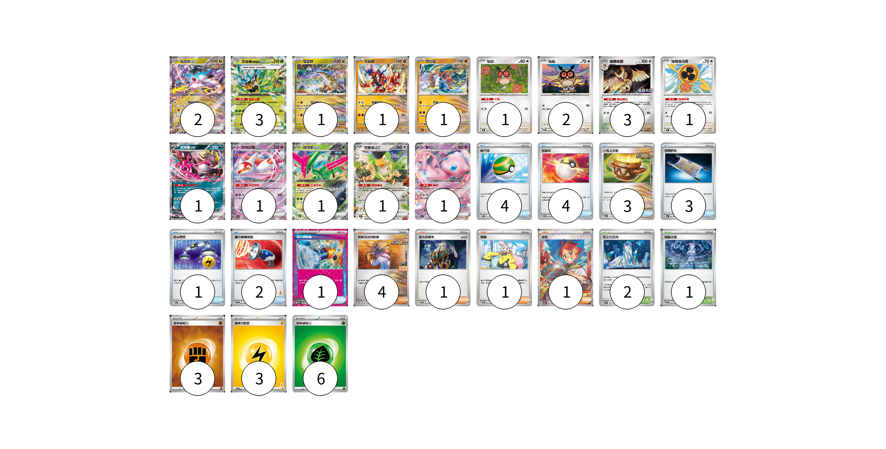 牌組構築方案 以此牌組為基礎新構築牌組 顯示卡面 顯示列表 寶可夢卡(20) 2 3 1 1 1 1 2 3 1 1 1 1 1 1 寶可夢道具(1) 1 物品卡(18) 4 4 3 3 1 2 1 支援者卡(6) 4 1 1 競技場卡(3) 2 1 能量卡(12) 3 3 6 寶可夢卡(20) 卡牌名稱 張數 卡牌名稱 張數 猛雷鼓ex SV8a 124/187 02 厄鬼椪 碧草面具ex SV6 016/101 03 猛雷鼓 SV7 075/102 01 故勒頓 SV8 069/106 01 爬地翅 SV4K 041/066 01 咕咕 SV8a 127/187 01 咕咕 SV7 076/102 02 貓頭夜鷹 SV-P 145/SV-P 03 旋轉洛托姆 SV8a 131/187 01 吉雉雞ex SV6a 038/064 01 拉帝亞斯ex SV7a 019/064 01 鐵斑葉ex SV8a 016/187 01 怒鸚哥ex SV2P 065/071 01 夢幻ex SV2a 151/165 01 寶可夢道具(1) 卡牌名稱 張數 卡牌名稱 張數 奇樹 SVTL 018/021 01 物品卡(18) 卡牌名稱 張數 卡牌名稱 張數 巢穴球 SVEL 011/020 04 高級球 SVTR 014/021 04 大地之容器 SVHK 011/022 03 夜間擔架 SV6a 056/064 03 能量轉移 SVC 011/021 01 寶可夢捕捉器 SVI 055/066 02 頂尖捕捉器 SV8a 148/187 01 支援者卡(6) 卡牌名稱 張數 卡牌名稱 張數 奧琳博士的氣魄 SV-P 184/SV-P 04 老大的指令 SVTL 021/021 01 赤松 SV7 123/102 01 競技場卡(3) 卡牌名稱 張數 卡牌名稱 張數 零之大空洞 SV8a 182/187 02 阻礙之塔 SV6 100/101 01 能量卡(12) 卡牌名稱 張數 卡牌名稱 張數 基本【鬥】能量 SVK FIG 03 基本【雷】能量 SVI LIG 03 基本【草】能量 SVTM GRA 06 以此牌組為基礎新構築牌組 牌組編碼 rQLDLx-YggBHa-gIDBzh copy 列印牌組單 牌組編碼已複製 分享至SNS
