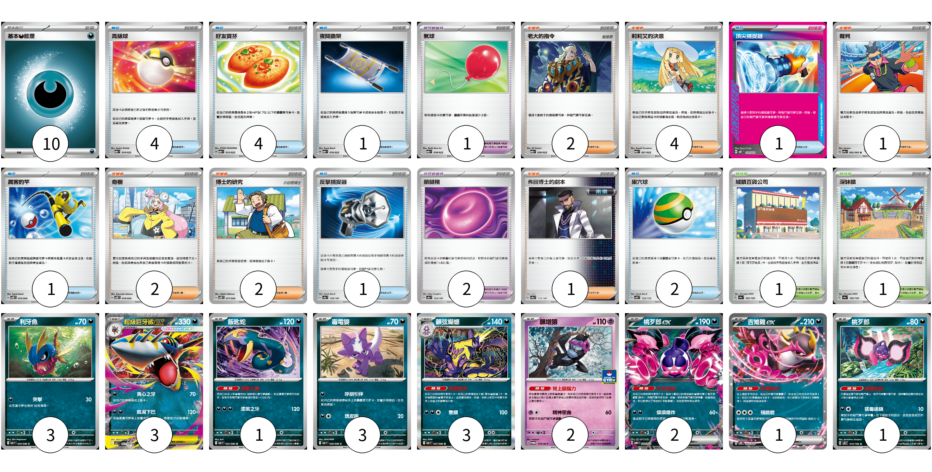 牌組構築方案 以此牌組為基礎新構築牌組 顯示卡面 顯示列表 寶可夢卡(19) 3 3 1 3 3 2 2 1 1 寶可夢道具(3) 1 2 物品卡(14) 4 4 1 1 1 1 2 支援者卡(12) 2 4 1 2 2 1 競技場卡(2) 1 1 能量卡(10) 10 寶可夢卡(19) 卡牌名稱 張數 卡牌名稱 張數 利牙魚 M2 050/080 03 超級巨牙鯊ex M2 051/080 03 飯匙蛇 M2 052/080 01 毒電嬰 M2 056/080 03 顫弦蠑螈 M2 057/080 03 願增猿 M-P 014/M-P 02 桃歹郎ex MBG 009/022 02 吉雉雞ex SVOD 004/020 01 桃歹郎 SV8 075/106 01 寶可夢道具(3) 卡牌名稱 張數 卡牌名稱 張數 氣球 MBD 018/022 01 鎖鏈糬 SV8a 154/187 02 物品卡(14) 卡牌名稱 張數 卡牌名稱 張數 高級球 MBD 014/022 04 好友寶芬 MBD 013/022 04 夜間擔架 MBD 016/022 01 頂尖捕捉器 MBG 014/022 01 厲害釣竿 SVOD 010/020 01 反擊捕捉器 SV8a 139/187 01 巢穴球 SVM 133/175 02 支援者卡(12) 卡牌名稱 張數 卡牌名稱 張數 老大的指令 MBD 020/022 02 莉莉艾的決意 MBD 021/022 04 裁判 SV9a 062/063 01 奇樹 SVOD 016/020 02 博士的研究 SVOD 017/020 02 弗圖博士的劇本 SV8a 175/187 01 競技場卡(2) 卡牌名稱 張數 卡牌名稱 張數 城鎮百貨公司 SV4a 183/190 01 深缽鎮 SV4a 185/190 01 能量卡(10) 卡牌名稱 張數 卡牌名稱 張數 基本【惡】能量 MBG DAR 10 以此牌組為基礎新構築牌組 牌組編碼 rRZaDI-wOADLP-WKwUPE copy 列印牌組單 牌組編碼已複製 分享至SNS