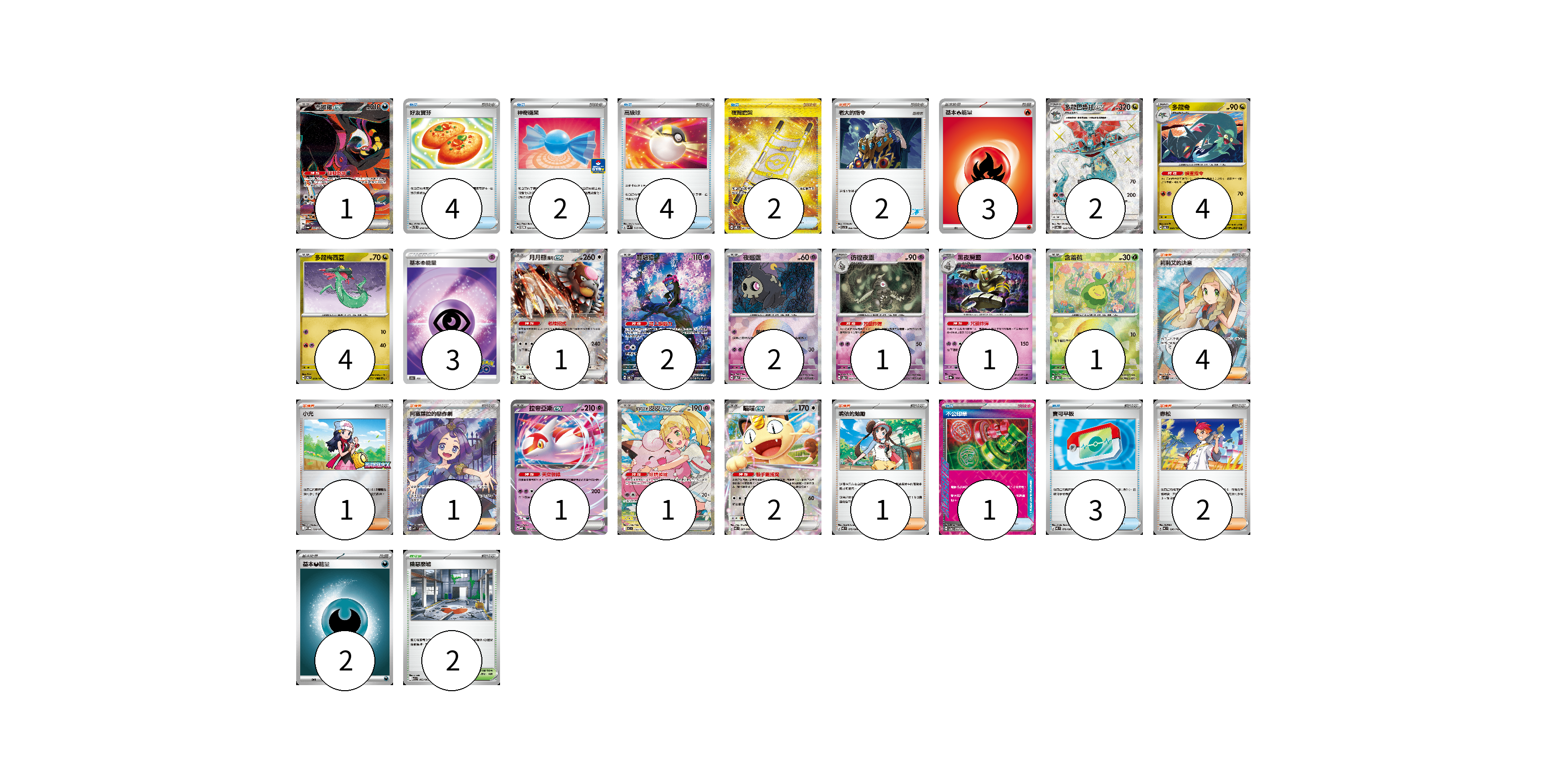 牌組構築方案 以此牌組為基礎新構築牌組 顯示卡面 顯示列表 寶可夢卡(23) 1 2 4 4 1 2 2 1 1 1 1 1 2 物品卡(16) 4 2 4 2 1 3 支援者卡(11) 2 4 1 1 1 2 競技場卡(2) 2 能量卡(8) 3 3 2 寶可夢卡(23) 卡牌名稱 張數 卡牌名稱 張數 吉雉雞ex SV6a 089/064 01 多龍巴魯托ex SV6 120/101 02 多龍奇 SV6 080/101 04 多龍梅西亞 SV6 079/101 04 月月熊 赫月ex SV8a 134/187 01 願增猿 SV6 107/101 02 夜巡靈 SV8a 064/187 02 彷徨夜靈 SV8a 065/187 01 黑夜魔靈 SV8a 066/187 01 含羞苞 SV8a 001/187 01 拉帝亞斯ex MBD 003/022 01 莉莉艾的皮皮ex MC 765/742 01 喵喵ex M3 061/080 02 物品卡(16) 卡牌名稱 張數 卡牌名稱 張數 好友寶芬 SVTL 010/021 04 神奇糖果 SV-P 104/SV-P 02 高級球 SVK 018/042 04 夜間擔架 SV8 137/106 02 不公印章 SV5a 053/066 01 寶可平板 M3 070/080 03 支援者卡(11) 卡牌名稱 張數 卡牌名稱 張數 老大的指令 SVI 066/066 02 莉莉艾的決意 M1L 086/063 04 小光 M-P 028/M-P 01 阿塞蘿拉的惡作劇 M1S 084/063 01 鳴依的勉勵 M3 075/080 01 赤松 MC 696/742 02 競技場卡(2) 卡牌名稱 張數 卡牌名稱 張數 險惡廢墟 M1L 063/063 02 能量卡(8) 卡牌名稱 張數 卡牌名稱 張數 基本【火】能量 SVF FIR 03 基本超能量 S10b PSY 03 基本【惡】能量 MC DAR 02 以此牌組為基礎新構築牌組 牌組編碼 rTlPEC-kxowwg-AJmzKv copy 列印牌組單 牌組編碼已複製 分享至SNS