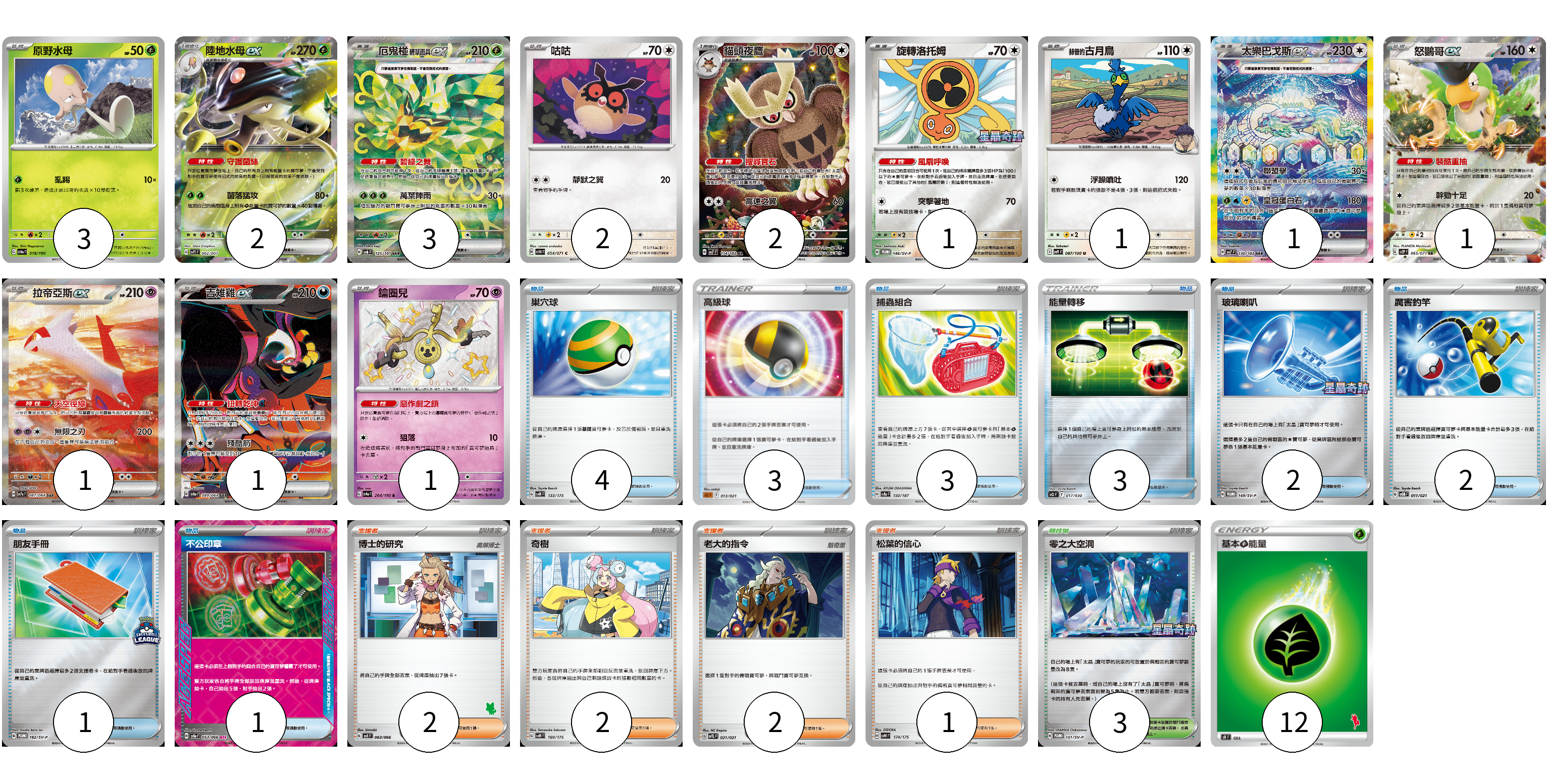 牌組構築方案 以此牌組為基礎新構築牌組 顯示卡面 顯示列表 寶可夢卡(19) 3 2 3 2 2 1 1 1 1 1 1 1 物品卡(19) 4 3 3 3 2 2 1 1 支援者卡(7) 2 2 2 1 競技場卡(3) 3 能量卡(12) 12 寶可夢卡(19) 卡牌名稱 張數 卡牌名稱 張數 原野水母 SV4a 018/190 03 陸地水母ex SVP1 002/007 02 厄鬼椪 碧草面具ex SV6 125/101 03 咕咕 SV5K 054/071 02 貓頭夜鷹 SV7 114/102 02 旋轉洛托姆 SV-P 146/SV-P 01 赫普的古月鳥 SV9 087/100 01 太樂巴戈斯ex SV7 130/102 01 怒鸚哥ex SV2P 065/071 01 拉帝亞斯ex SV7a 087/064 01 吉雉雞ex SV6a 089/064 01 鑰圈兒 SV4a 264/190 01 物品卡(19) 卡牌名稱 張數 卡牌名稱 張數 巢穴球 SVM 133/175 04 高級球 SLL 013/021 03 捕蟲組合 SV8a 150/187 03 能量轉移 SO 017/030 03 玻璃喇叭 SV-P 149/SV-P 02 厲害釣竿 SVOM 011/021 02 朋友手冊 SV-P 182/SV-P 01 不公印章 SV5a 053/066 01 支援者卡(7) 卡牌名稱 張數 卡牌名稱 張數 博士的研究 SVI 063/066 02 奇樹 SVM 160/175 02 老大的指令 SVTL 021/021 02 松葉的信心 SVM 174/175 01 競技場卡(3) 卡牌名稱 張數 卡牌名稱 張數 零之大空洞 SV-P 151/SV-P 03 能量卡(12) 卡牌名稱 張數 卡牌名稱 張數 基本草能量 SH GRA 12 以此牌組為基礎新構築牌組 牌組編碼 rVhpFv-Nzohzx-bzOqkh copy 列印牌組單 牌組編碼已複製 分享至SNS