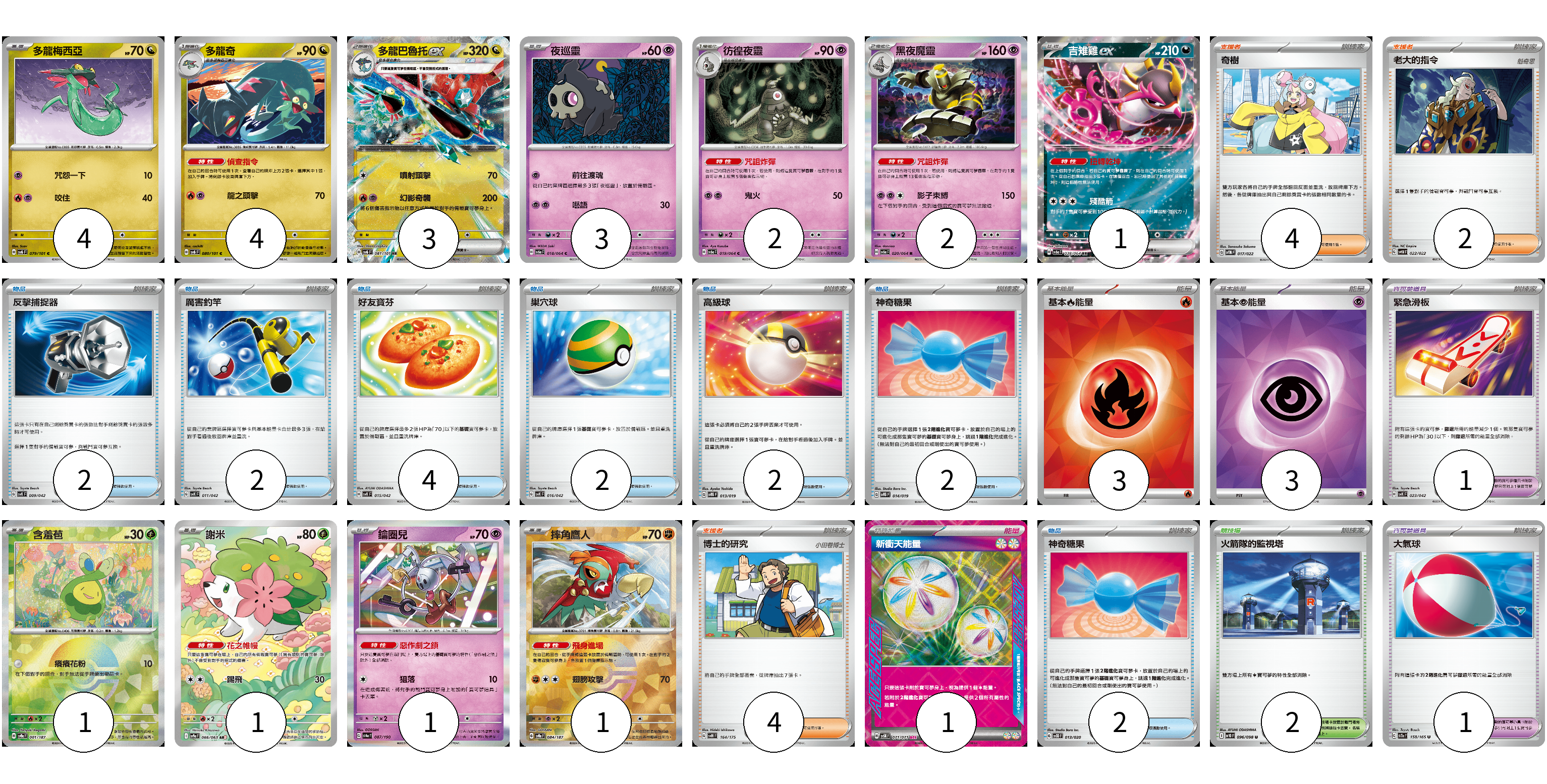 牌組構築方案 以此牌組為基礎新構築牌組 顯示卡面 顯示列表 寶可夢卡(23) 4 4 3 3 2 2 1 1 1 1 1 寶可夢道具(2) 1 1 物品卡(16) 2 2 4 2 2 2 2 支援者卡(10) 4 2 4 競技場卡(2) 2 能量卡(7) 3 3 1 寶可夢卡(23) 卡牌名稱 張數 卡牌名稱 張數 多龍梅西亞 SV6 079/101 04 多龍奇 SV6 080/101 04 多龍巴魯托ex SV6 081/101 03 夜巡靈 SV6a 018/064 03 彷徨夜靈 SV6a 019/064 02 黑夜魔靈 SV6a 020/064 02 吉雉雞ex SV6a 038/064 01 含羞苞 SV8a 001/187 01 謝米 SV9a 066/063 01 鑰圈兒 SV4a 087/190 01 摔角鷹人 SV8a 084/187 01 寶可夢道具(2) 卡牌名稱 張數 卡牌名稱 張數 緊急滑板 SVK 023/042 01 大氣球 SV2a 158/165 01 物品卡(16) 卡牌名稱 張數 卡牌名稱 張數 反擊捕捉器 SVK 009/042 02 厲害釣竿 SVK 011/042 02 好友寶芬 SVK 015/042 04 巢穴球 SVK 016/042 02 高級球 SVTG 013/019 02 神奇糖果 SVTG 014/019 02 神奇糖果 SVOD 013/020 02 支援者卡(10) 卡牌名稱 張數 卡牌名稱 張數 奇樹 SVTM 017/022 04 老大的指令 SVHM 022/022 02 博士的研究 SVM 164/175 04 競技場卡(2) 卡牌名稱 張數 卡牌名稱 張數 火箭隊的監視塔 SV10 096/098 02 能量卡(7) 卡牌名稱 張數 卡牌名稱 張數 基本【火】能量 SVK FIR 03 基本【超】能量 SVK PSY 03 新衝天能量 SV5K 071/071 01 以此牌組為基礎新構築牌組 牌組編碼 rVvwKf-IbUIrI-JyBOfY copy 列印牌組單 牌組編碼已複製 分享至SNS