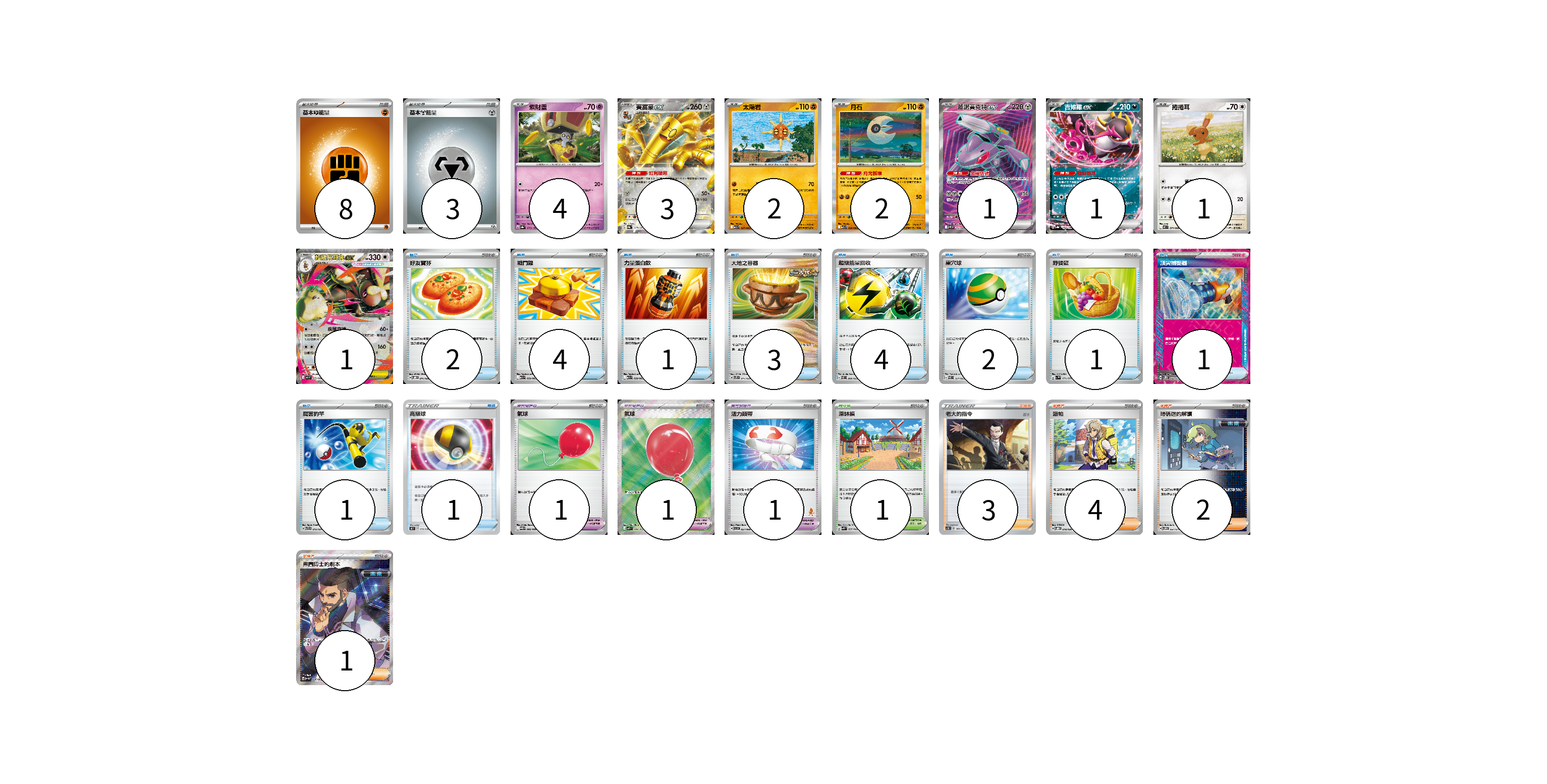 牌組構築方案 以此牌組為基礎新構築牌組 顯示卡面 顯示列表 寶可夢卡(15) 4 3 2 2 1 1 1 1 寶可夢道具(3) 1 1 1 物品卡(20) 2 4 1 3 4 2 1 1 1 1 支援者卡(10) 3 4 2 1 競技場卡(1) 1 能量卡(11) 8 3 寶可夢卡(15) 卡牌名稱 張數 卡牌名稱 張數 索財靈 SV8a 073/187 04 賽富豪ex SV8a 117/187 03 太陽岩 M1L 027/063 02 月石 M1L 026/063 02 蓋諾賽克特ex SV11B 164/086 01 吉雉雞ex SV8a 104/187 01 捲捲耳 M2 071/080 01 超級長耳兔ex M2 072/080 01 寶可夢道具(3) 卡牌名稱 張數 卡牌名稱 張數 氣球 SV11B 082/086 01 氣球 M1L 084/063 01 活力頭帶 SVI 057/066 01 物品卡(20) 卡牌名稱 張數 卡牌名稱 張數 好友寶芬 SVOD 011/020 02 戰鬥鑼 M1L 059/063 04 力量蛋白飲 M1L 058/063 01 大地之容器 SVTS 011/022 03 超級能量回收 SVEL 009/020 04 巢穴球 SVEL 011/020 02 野餐籃 SV1V 071/078 01 頂尖捕捉器 SV5M 062/071 01 厲害釣竿 SVTR 012/021 01 高級球 SK 015/030 01 支援者卡(10) 卡牌名稱 張數 卡牌名稱 張數 老大的指令(坂木) SC1D 161/164 03 派帕 SVOD 018/020 04 暗碼迷的解讀 SV5M 067/071 02 弗圖博士的劇本 SV4M 086/066 01 競技場卡(1) 卡牌名稱 張數 卡牌名稱 張數 深缽鎮 SVK 039/042 01 能量卡(11) 卡牌名稱 張數 卡牌名稱 張數 基本【鬥】能量 M-P FIG 08 基本【鋼】能量 M-P MET 03 以此牌組為基礎新構築牌組 牌組編碼 rXxKGv-gGyntn-QjTWBJ copy 列印牌組單 牌組編碼已複製 分享至SNS
