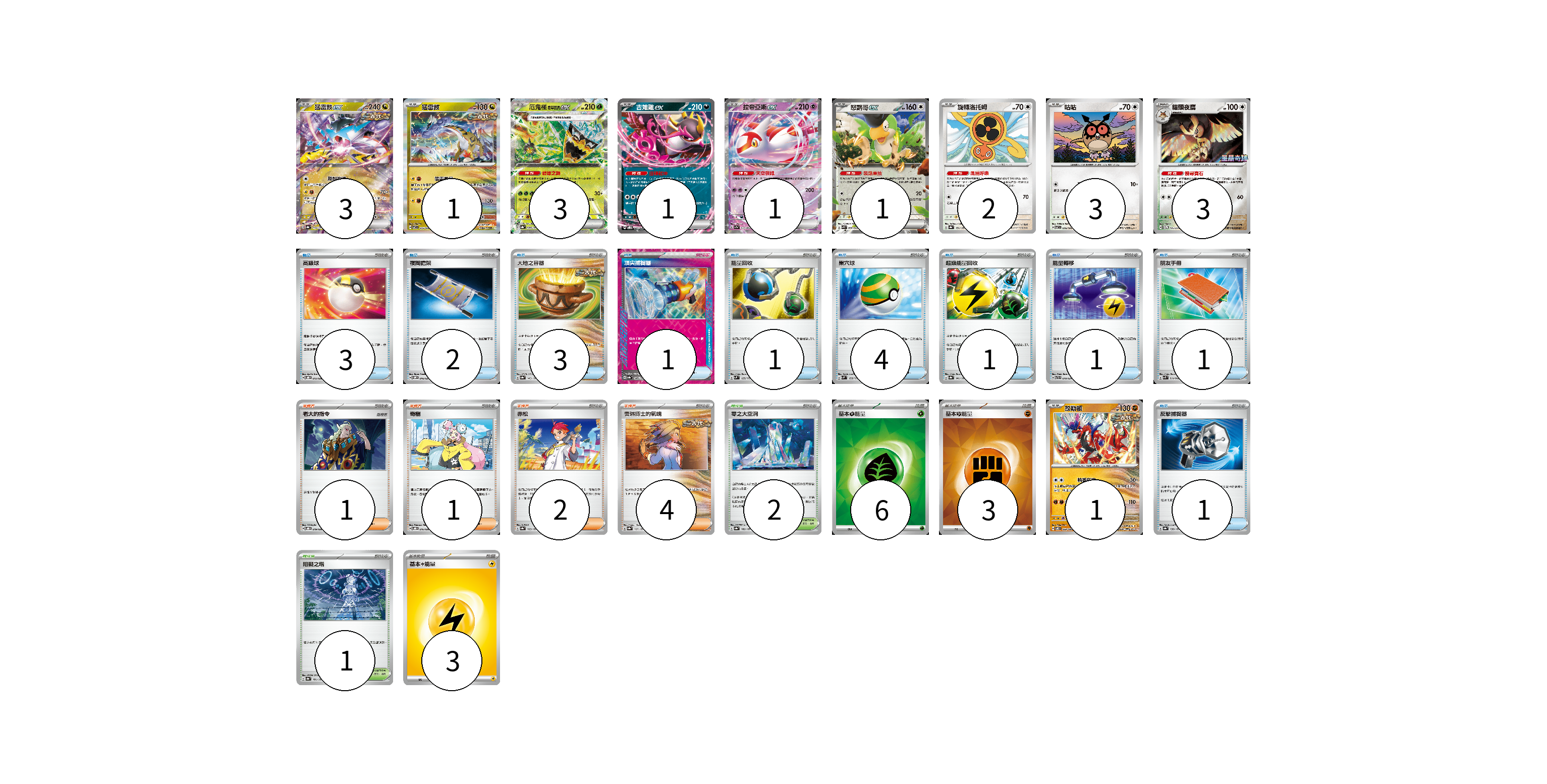 牌組構築方案 以此牌組為基礎新構築牌組 顯示卡面 顯示列表 寶可夢卡(19) 3 1 3 1 1 1 2 3 3 1 物品卡(18) 3 2 3 1 1 4 1 1 1 1 支援者卡(8) 1 1 2 4 競技場卡(3) 2 1 能量卡(12) 6 3 3 寶可夢卡(19) 卡牌名稱 張數 卡牌名稱 張數 猛雷鼓ex SV8a 124/187 03 猛雷鼓 SV7 075/102 01 厄鬼椪 碧草面具ex SV8a 020/187 03 吉雉雞ex SVOD 004/020 01 拉帝亞斯ex SV7a 019/064 01 怒鸚哥ex SVK 006/042 01 旋轉洛托姆 SV8a 131/187 02 咕咕 SV7 076/102 03 貓頭夜鷹 SV-P 145/SV-P 03 故勒頓 SV8 069/106 01 物品卡(18) 卡牌名稱 張數 卡牌名稱 張數 高級球 SVOD 012/020 03 夜間擔架 SVOM 016/021 02 大地之容器 SV8a 143/187 03 頂尖捕捉器 SV8a 148/187 01 能量回收 SVM 125/175 01 巢穴球 SVM 133/175 04 超級能量回收 SV8a 141/187 01 能量轉移 SVTR 010/021 01 朋友手冊 SVK 014/042 01 反擊捕捉器 SV8a 139/187 01 支援者卡(8) 卡牌名稱 張數 卡牌名稱 張數 老大的指令 SVOD 019/020 01 奇樹 SVOD 016/020 01 赤松 SV8a 163/187 02 奧琳博士的氣魄 SV8a 167/187 04 競技場卡(3) 卡牌名稱 張數 卡牌名稱 張數 零之大空洞 SV8a 182/187 02 阻礙之塔 SV8a 181/187 01 能量卡(12) 卡牌名稱 張數 卡牌名稱 張數 基本【草】能量 SVK GRA 06 基本【鬥】能量 SVK FIG 03 基本【雷】能量 SVF LIG 03 以此牌組為基礎新構築牌組 牌組編碼 rZKabp-GLBBCK-XfsRBT copy 列印牌組單 牌組編碼已複製 分享至SNS