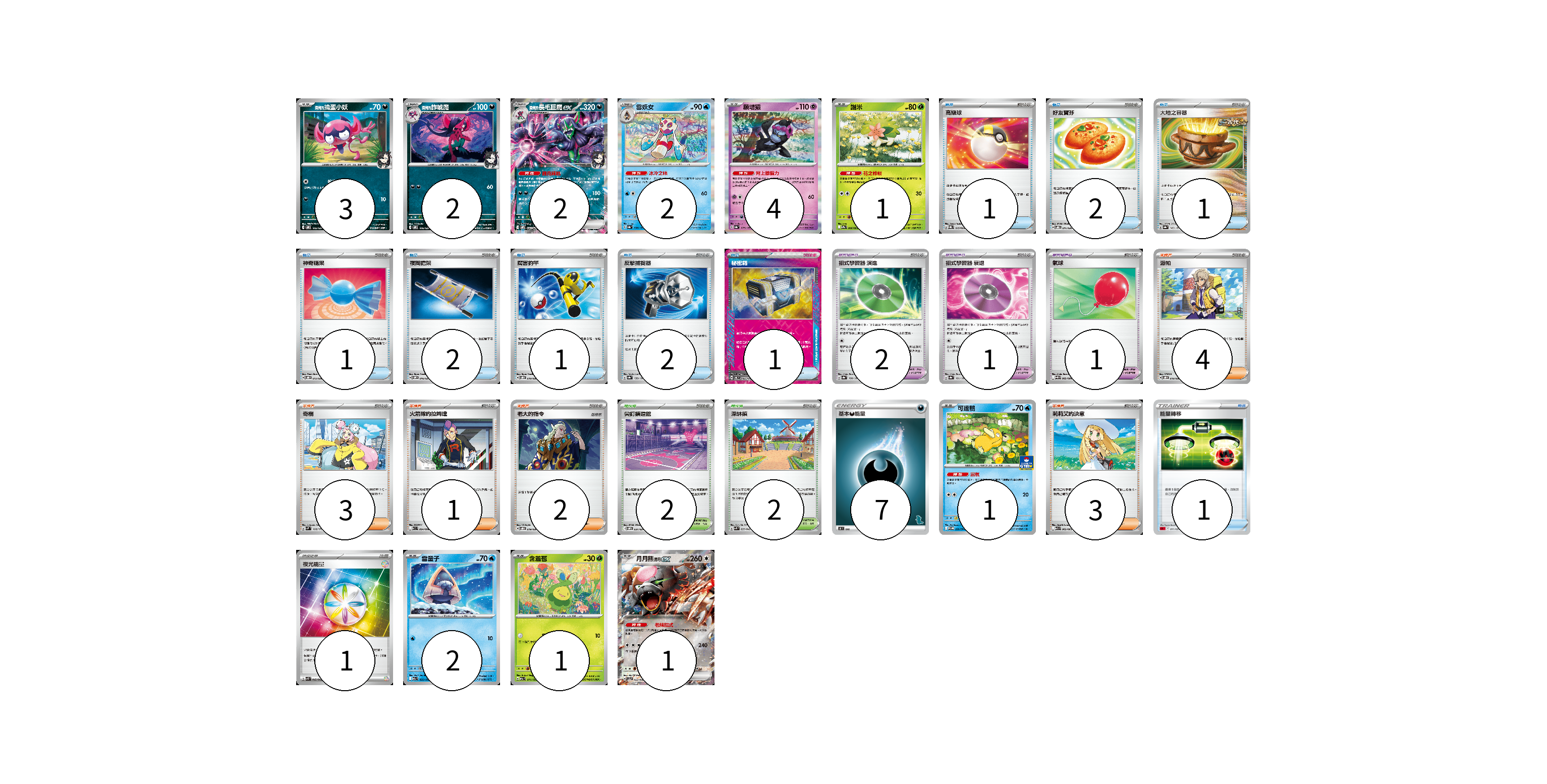 牌組構築方案 以此牌組為基礎新構築牌組 顯示卡面 顯示列表 寶可夢卡(19) 3 2 2 2 4 1 1 2 1 1 寶可夢道具(4) 2 1 1 物品卡(12) 1 2 1 1 2 1 2 1 1 支援者卡(13) 4 3 1 2 3 競技場卡(4) 2 2 能量卡(8) 7 1 寶可夢卡(19) 卡牌名稱 張數 卡牌名稱 張數 <瑪俐的>搗蛋小妖 SVOM 005/021 03 <瑪俐的>詐唬魔 SVOM 006/021 02 <瑪俐的>長毛巨魔ex SVOM 007/021 02 雪妖女 SV8a 038/187 02 願增猿 SV8a 075/187 04 謝米 SV9a 006/063 01 可達鴨 SV-P 220/SV-P 01 雪童子 M2a 035/193 02 含羞苞 M2a 011/193 01 月月熊 赫月 ex SV5a 052/066 01 寶可夢道具(4) 卡牌名稱 張數 卡牌名稱 張數 招式學習器 演進 SV8a 160/187 02 招式學習器 衰退 SV8a 161/187 01 氣球 SV11B 082/086 01 物品卡(12) 卡牌名稱 張數 卡牌名稱 張數 高級球 SVQL 015/022 01 好友寶芬 SVOD 011/020 02 大地之容器 SV8a 143/187 01 神奇糖果 SVOD 013/020 01 夜間擔架 SVOM 016/021 02 厲害釣竿 SVOD 010/020 01 反擊捕捉器 SV8a 139/187 02 秘密箱 SV6 092/101 01 能量轉移 SDL 011/021 01 支援者卡(13) 卡牌名稱 張數 卡牌名稱 張數 派帕 SVOD 018/020 04 奇樹 SVM 160/175 03 火箭隊的拉姆達 SV10 094/098 01 老大的指令 SVOD 019/020 02 莉莉艾的決意 M1L 062/063 03 競技場卡(4) 卡牌名稱 張數 卡牌名稱 張數 尖釘鎮道館 SVOM 021/021 02 深缽鎮 SVK 039/042 02 能量卡(8) 卡牌名稱 張數 卡牌名稱 張數 基本惡能量 SH DAR 07 夜光能量 SVK 042/042 01 以此牌組為基礎新構築牌組 牌組編碼 rcCBAN-EzWtfL-GoFqdF copy 列印牌組單 牌組編碼已複製 分享至SNS