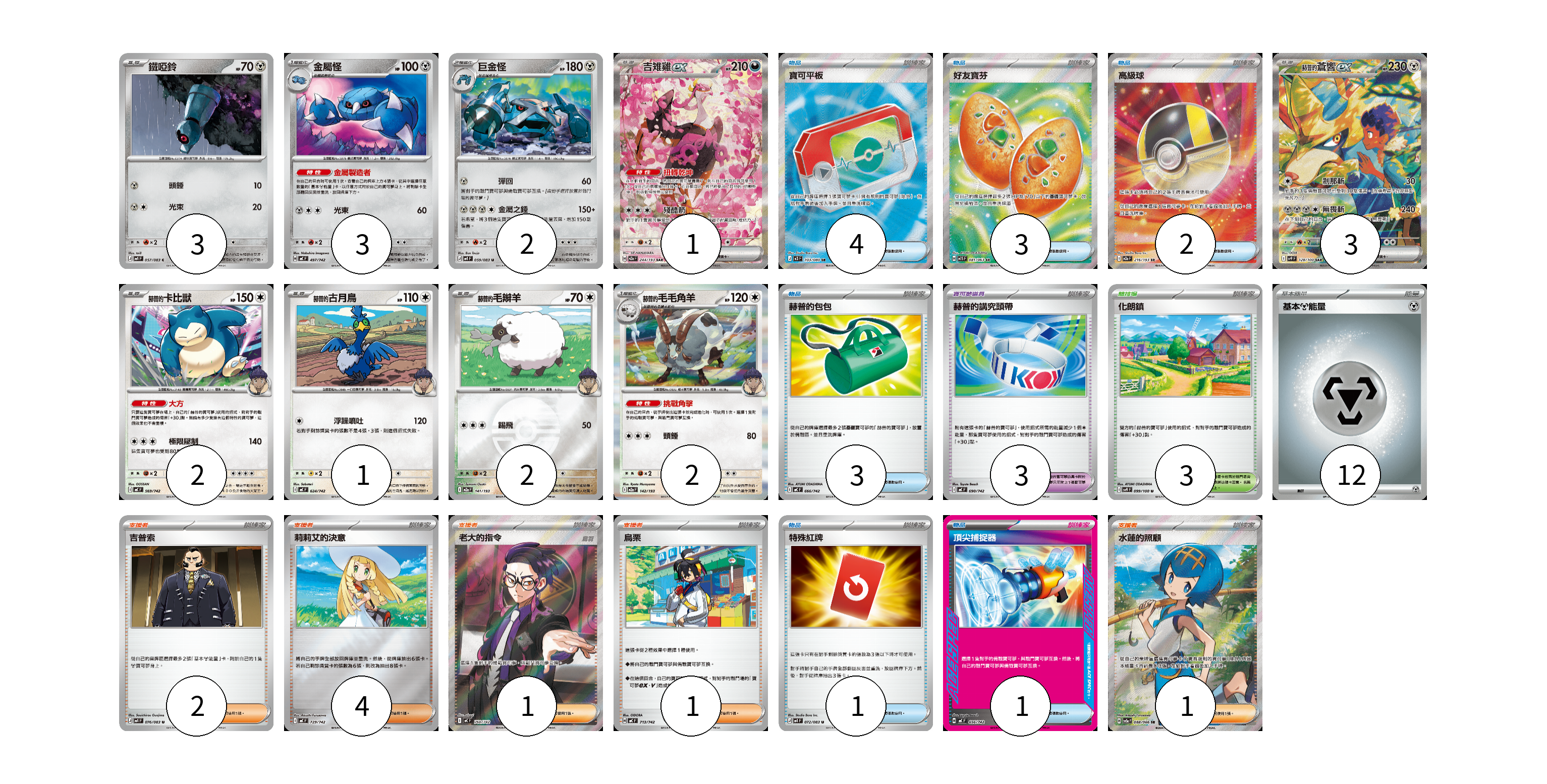 牌組構築方案 以此牌組為基礎新構築牌組 顯示卡面 顯示列表 寶可夢卡(19) 3 3 2 1 3 2 1 2 2 寶可夢道具(3) 3 物品卡(14) 4 3 2 3 1 1 支援者卡(9) 2 4 1 1 1 競技場卡(3) 3 能量卡(12) 12 寶可夢卡(19) 卡牌名稱 張數 卡牌名稱 張數 鐵啞鈴 M4 057/083 03 金屬怪 MC 497/742 03 巨金怪 M4 059/083 02 吉雉雞ex M2a 244/193 01 赫普的蒼響ex SV9 128/100 03 赫普的卡比獸 MC 569/742 02 <赫普的>古月鳥 MC 624/742 01 赫普的毛辮羊 M2a 141/193 02 赫普的毛毛角羊 M2a 142/193 02 寶可夢道具(3) 卡牌名稱 張數 卡牌名稱 張數 赫普的講究頭帶 MC 690/742 03 物品卡(14) 卡牌名稱 張數 卡牌名稱 張數 寶可平板 M3 103/080 04 好友寶芬 M1S 081/063 03 高級球 M2a 216/193 02 赫普的包包 MC 666/742 03 特殊紅牌 M4 072/083 01 頂尖捕捉器 MC 656/742 01 支援者卡(9) 卡牌名稱 張數 卡牌名稱 張數 吉普索 M4 076/083 02 莉莉艾的決意 MC 729/742 04 老大的指令(烏羽) MC 760/742 01 烏栗 MC 713/742 01 水蓮的照顧 SV5a 088/066 01 競技場卡(3) 卡牌名稱 張數 卡牌名稱 張數 化朗鎮 SV9 099/100 03 能量卡(12) 卡牌名稱 張數 卡牌名稱 張數 基本【鋼】能量 M-P MET 12 以此牌組為基礎新構築牌組 牌組編碼 rcDRlw-ztLoGL-WdtanC copy 列印牌組單 牌組編碼已複製 分享至SNS