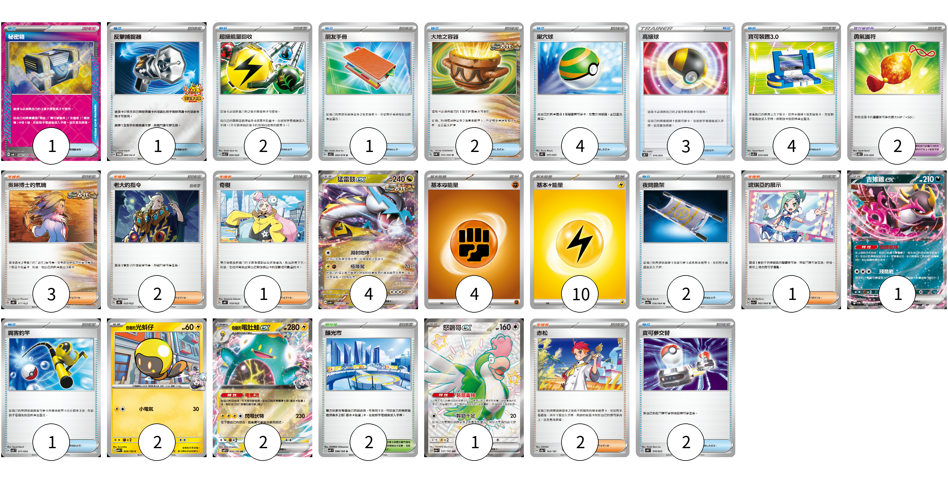 牌組構築方案 以此牌組為基礎新構築牌組 顯示卡面 顯示列表 寶可夢卡(10) 4 1 2 2 1 寶可夢道具(2) 2 物品卡(23) 1 1 2 1 2 4 3 4 2 1 2 支援者卡(9) 3 2 1 1 2 競技場卡(2) 2 能量卡(14) 4 10 寶可夢卡(10) 卡牌名稱 張數 卡牌名稱 張數 猛雷鼓ex SV5K 053/071 04 吉雉雞ex SV6a 038/064 01 奇樹的光蚪仔 SV9 029/100 02 奇樹的電肚蛙ex SV9 030/100 02 怒鸚哥ex SV4a 337/190 01 寶可夢道具(2) 卡牌名稱 張數 卡牌名稱 張數 勇氣護符 SVEM 016/020 02 物品卡(23) 卡牌名稱 張數 卡牌名稱 張數 秘密箱 SV6 092/101 01 反擊捕捉器 SV-P 083/SV-P 01 超級能量回收 SVEL 009/020 02 朋友手冊 SV1S 069/078 01 大地之容器 SV4K 060/066 02 巢穴球 SVHK 012/022 04 高級球 SN 016/024 03 寶可裝置3.0 SVEL 014/020 04 夜間擔架 SV6a 056/064 02 厲害釣竿 SVK 011/042 01 寶可夢交替 SVHK 014/022 02 支援者卡(9) 卡牌名稱 張數 卡牌名稱 張數 奧琳博士的氣魄 SVHK 017/022 03 老大的指令 SVHK 022/022 02 奇樹 SVHK 019/022 01 琉琪亞的展示 SV7a 063/064 01 赤松 SV8a 163/187 02 競技場卡(2) 卡牌名稱 張數 卡牌名稱 張數 釀光市 SV9 098/100 02 能量卡(14) 卡牌名稱 張數 卡牌名稱 張數 基本【鬥】能量 SVHK FIG 04 基本【雷】能量 SVHM LIG 10 以此牌組為基礎新構築牌組 牌組編碼 rcqXzO-gIPSDu-mhLxuq copy 列印牌組單 牌組編碼已複製 分享至SNS