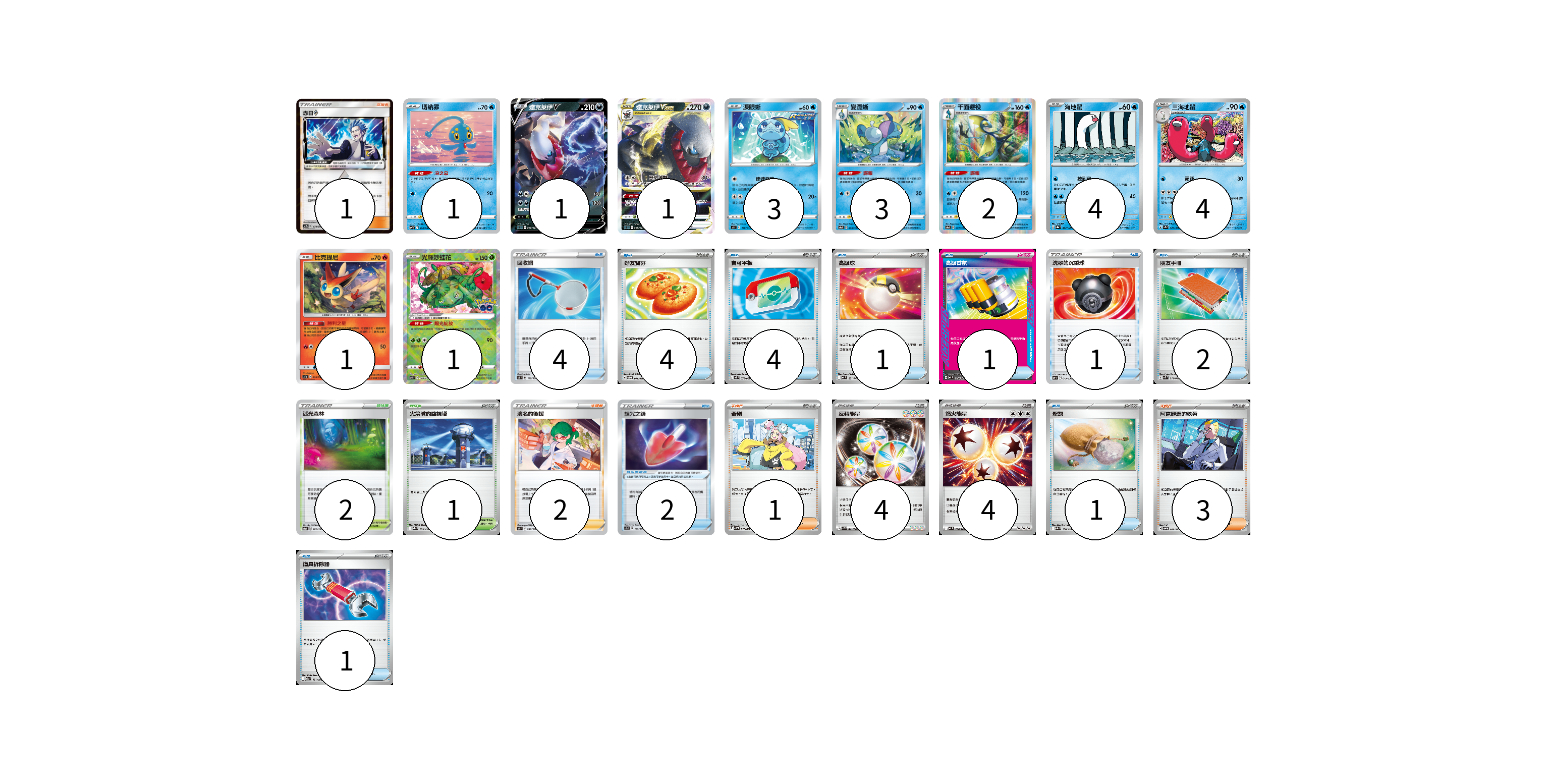 牌組構築方案 以此牌組為基礎新構築牌組 顯示卡面 顯示列表 寶可夢卡(21) 1 1 1 3 3 2 4 4 1 1 寶可夢道具(2) 2 物品卡(19) 4 4 4 1 1 1 2 1 1 支援者卡(7) 1 2 1 3 競技場卡(3) 2 1 能量卡(8) 4 4 寶可夢卡(21) 卡牌名稱 張數 卡牌名稱 張數 瑪納霏 SVF 003/038 01 達克萊伊V SLD 007/020 01 達克萊伊VSTAR SLD 008/020 01 淚眼蜥 SI 116/414 03 變澀蜥 S4a 040/190 03 千面避役 S4a 041/190 02 海地鼠 SV8a 042/187 04 三海地鼠 SV1S 020/078 04 比克提尼 AC1a 036/158 01 光輝妙蛙花 S10b 004/071 01 寶可夢道具(2) 卡牌名稱 張數 卡牌名稱 張數 詛咒之鏟 SC1a 145/154 02 物品卡(19) 卡牌名稱 張數 卡牌名稱 張數 回收網 SCB 119/156 04 好友寶芬 SVOD 011/020 04 寶可平板 M3 070/080 04 高級球 MC 651/742 01 高級香氛 MC 650/742 01 洗翠的沉重球 SVF 019/038 01 朋友手冊 SVK 014/042 02 聖灰 M2a 150/193 01 道具拆除器 M2a 151/193 01 支援者卡(7) 卡牌名稱 張數 卡牌名稱 張數 赤日◇ AC2b 173/200 01 濱名的後援 S9 096/100 02 奇樹 SVHM 018/022 01 阿克羅瑪的執著 SVOM 017/021 03 競技場卡(3) 卡牌名稱 張數 卡牌名稱 張數 迷光森林 S4a 181/190 02 火箭隊的監視塔 M2a 189/193 01 能量卡(8) 卡牌名稱 張數 卡牌名稱 張數 反轉能量 SVK 041/042 04 燃火能量 MC 736/742 04 以此牌組為基礎新構築牌組 牌組編碼 rdbbaE-MFwomK-PrMLvK copy 列印牌組單 牌組編碼已複製 分享至SNS