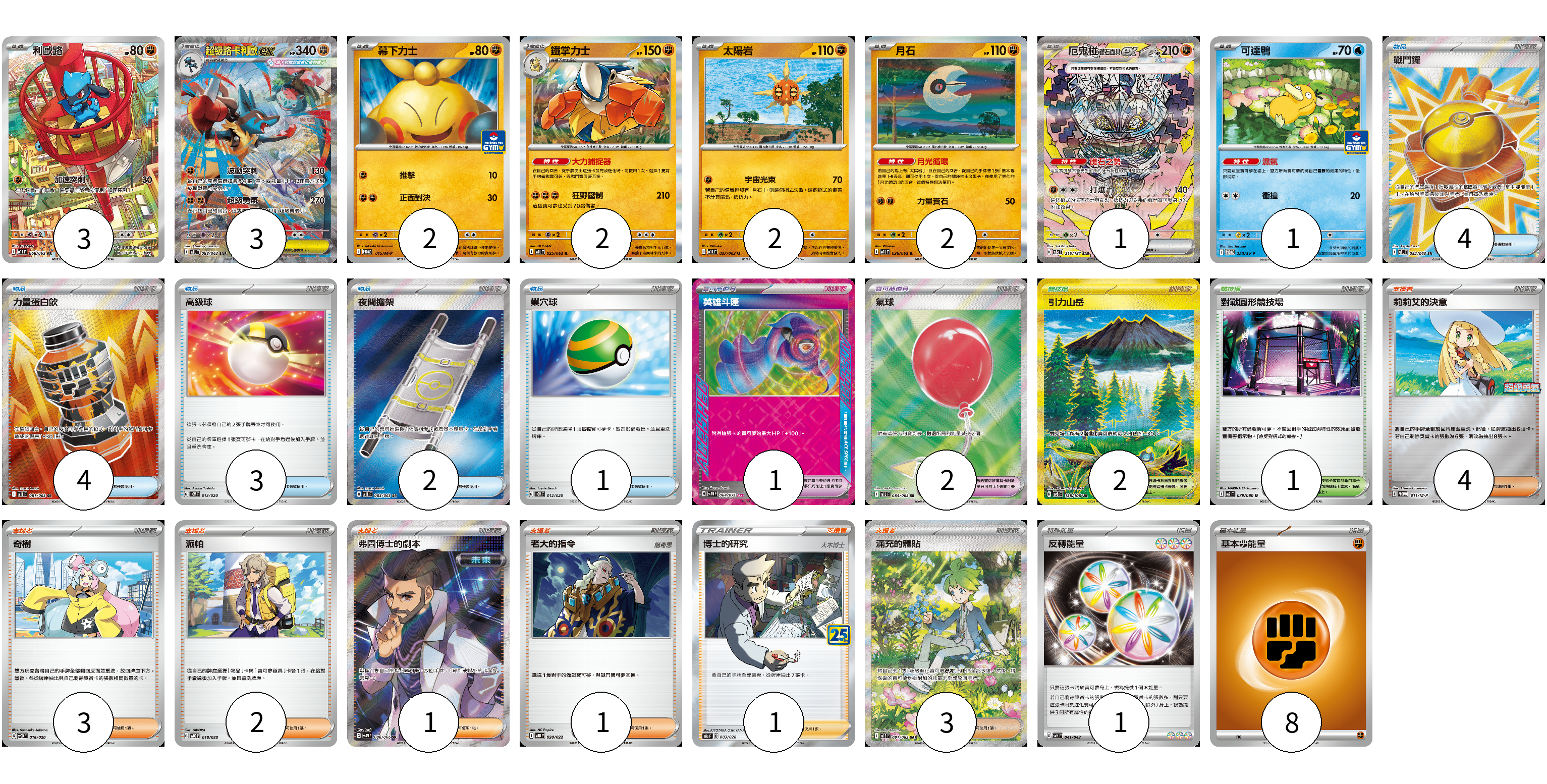 牌組構築方案 以此牌組為基礎新構築牌組 顯示卡面 顯示列表 寶可夢卡(16) 3 3 2 2 2 2 1 1 寶可夢道具(3) 1 2 物品卡(14) 4 4 3 2 1 支援者卡(15) 4 3 2 1 1 1 3 競技場卡(3) 2 1 能量卡(9) 1 8 寶可夢卡(16) 卡牌名稱 張數 卡牌名稱 張數 利歐路 M1L 068/063 03 超級路卡利歐ex M1L 088/063 03 幕下力士 M-P 015/M-P 02 鐵掌力士 M1L 025/063 02 太陽岩 M1L 027/063 02 月石 M1L 026/063 02 厄鬼椪 礎石面具ex SV8a 216/187 01 可達鴨 SV-P 220/SV-P 01 寶可夢道具(3) 卡牌名稱 張數 卡牌名稱 張數 英雄斗篷 SV5M 064/071 01 氣球 M1L 084/063 02 物品卡(14) 卡牌名稱 張數 卡牌名稱 張數 戰鬥鑼 M1L 082/063 04 力量蛋白飲 M1L 081/063 04 高級球 SVEM 013/020 03 夜間擔架 M1L 083/063 02 巢穴球 SVEM 012/020 01 支援者卡(15) 卡牌名稱 張數 卡牌名稱 張數 莉莉艾的決意 M-P 011/M-P 04 奇樹 SVOD 016/020 03 派帕 SVOD 018/020 02 弗圖博士的劇本 SV4M 086/066 01 老大的指令 MBD 020/022 01 博士的研究(大木博士) S8a 003/028 01 滿充的體貼 M1S 091/063 03 競技場卡(3) 卡牌名稱 張數 卡牌名稱 張數 引力山岳 SV8 138/106 02 對戰圓形競技場 M2 079/080 01 能量卡(9) 卡牌名稱 張數 卡牌名稱 張數 反轉能量 SVK 041/042 01 基本鬥能量 sv-p FIG 08 以此牌組為基礎新構築牌組 牌組編碼 rdrWtu-LatTFF-AgjNXr copy 列印牌組單 牌組編碼已複製 分享至SNS