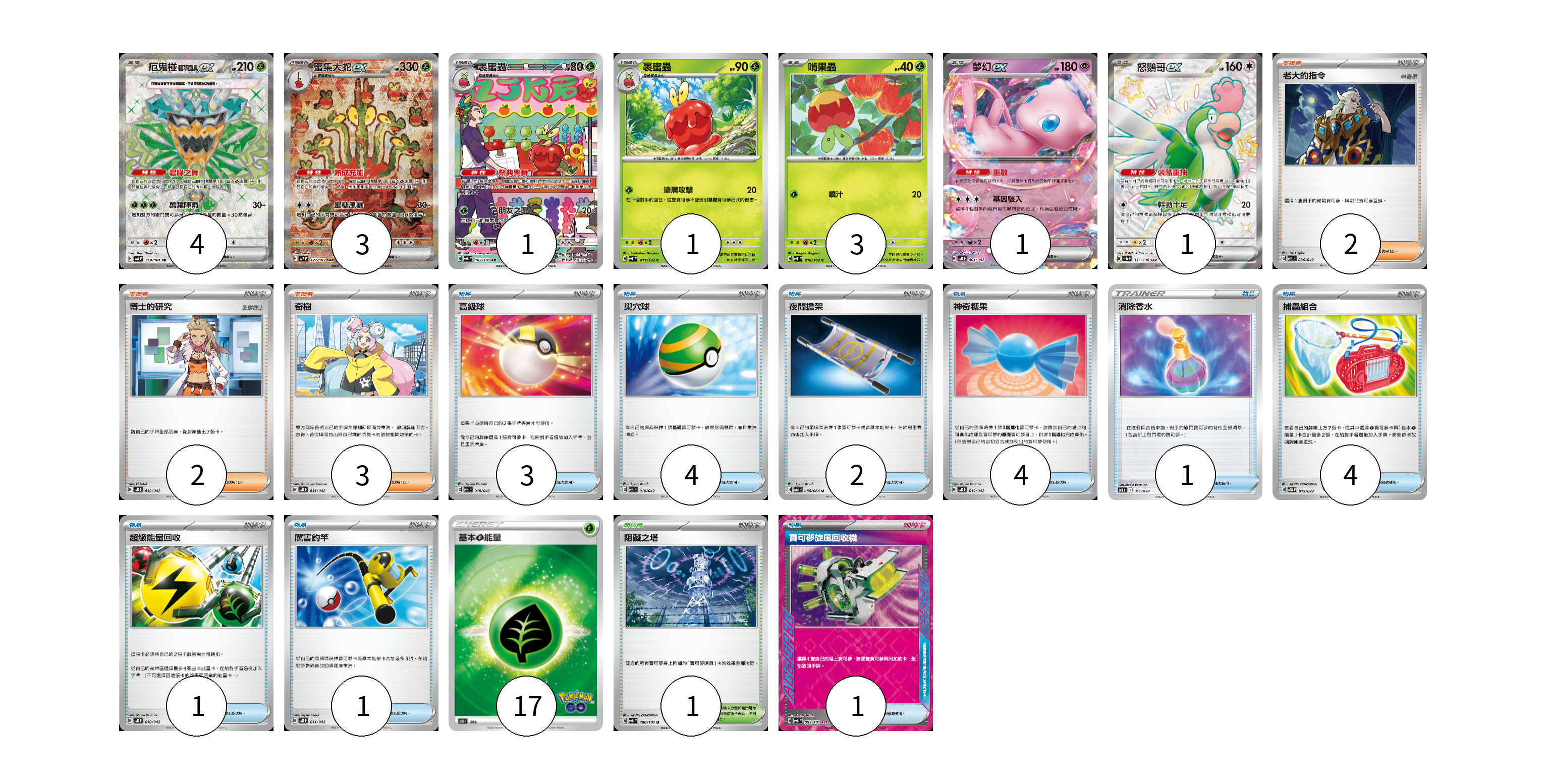 牌組構築方案 以此牌組為基礎新構築牌組 顯示卡面 顯示列表 寶可夢卡(14) 4 3 1 1 3 1 1 物品卡(21) 3 4 2 4 1 4 1 1 1 支援者卡(7) 2 2 3 競技場卡(1) 1 能量卡(17) 17 寶可夢卡(14) 卡牌名稱 張數 卡牌名稱 張數 厄鬼椪 碧草面具ex SV6 114/101 04 蜜集大蛇ex SV7 127/102 03 裹蜜蟲 SV6 103/101 01 裹蜜蟲 SV7 011/102 01 啃果蟲 SV7 010/102 03 夢幻ex SVK 001/042 01 怒鸚哥ex SV4a 337/190 01 物品卡(21) 卡牌名稱 張數 卡牌名稱 張數 高級球 SVK 018/042 03 巢穴球 SVK 016/042 04 夜間擔架 SV6a 056/064 02 神奇糖果 SVK 019/042 04 消除香水 SVF 011/038 01 捕蟲組合 SVTM 015/022 04 超級能量回收 SVK 010/042 01 厲害釣竿 SVK 011/042 01 寶可夢旋風回收機 SV6 093/101 01 支援者卡(7) 卡牌名稱 張數 卡牌名稱 張數 老大的指令 SVK 036/042 02 博士的研究 SVK 032/042 02 奇樹 SVK 031/042 03 競技場卡(1) 卡牌名稱 張數 卡牌名稱 張數 阻礙之塔 SV6 100/101 01 能量卡(17) 卡牌名稱 張數 卡牌名稱 張數 基本草能量 S10b GRA 17 以此牌組為基礎新構築牌組 牌組編碼 relgtK-alDYDR-DjsvHr copy 列印牌組單 牌組編碼已複製 分享至SNS
