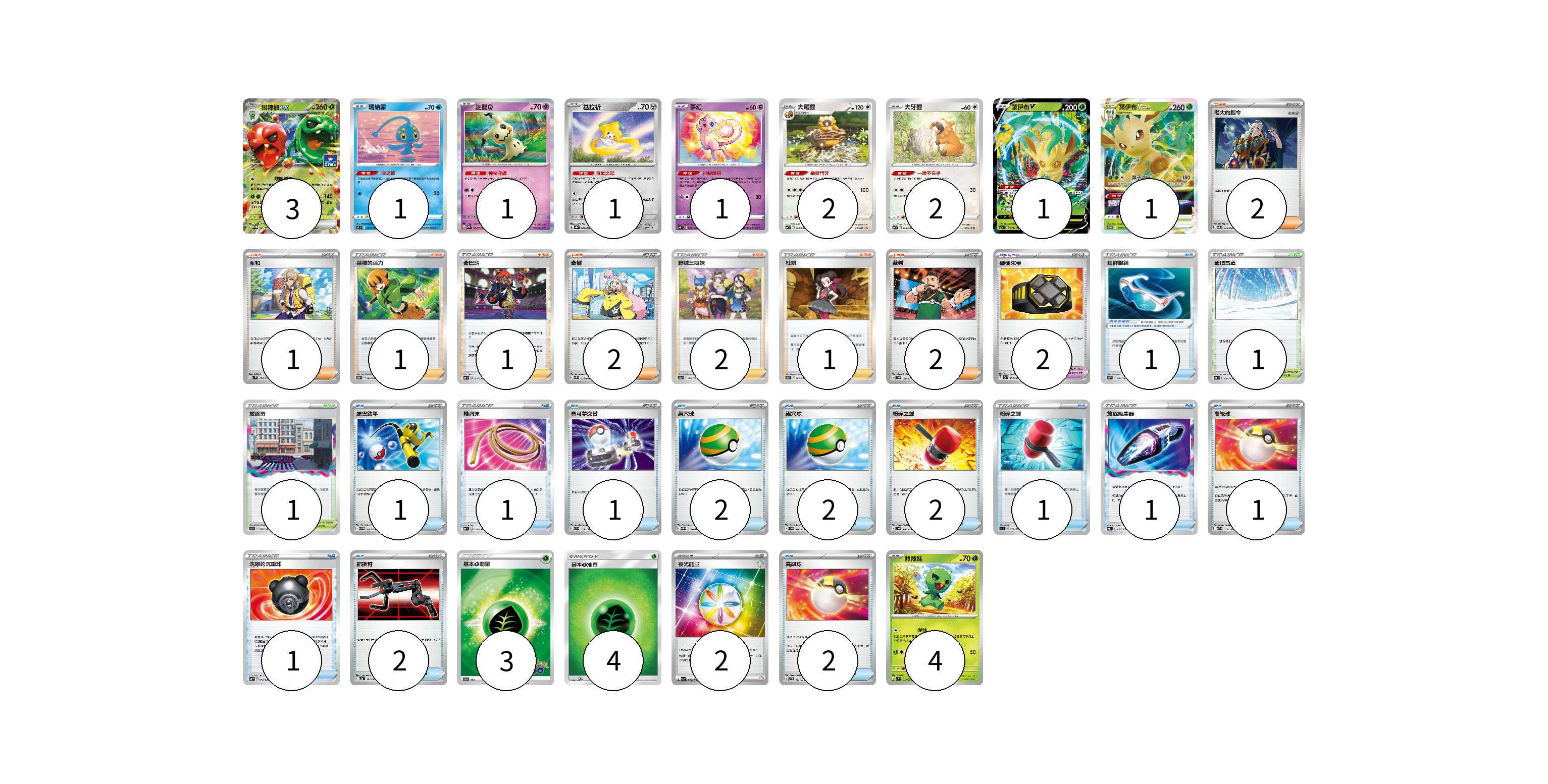 牌組構築方案 以此牌組為基礎新構築牌組 顯示卡面 顯示列表 寶可夢卡(17) 3 1 1 1 1 2 2 1 1 4 寶可夢道具(3) 2 1 物品卡(17) 1 1 1 2 2 2 1 1 1 1 2 2 支援者卡(12) 2 1 1 1 2 2 1 2 競技場卡(2) 1 1 能量卡(9) 3 4 2 寶可夢卡(17) 卡牌名稱 張數 卡牌名稱 張數 狠辣椒ex SV-P 043/SV-P 03 瑪納霏 S9 031/100 01 謎擬Q SV2P 034/071 01 基拉祈 SV3a 042/062 01 夢幻 SVF 005/038 01 大尾狸 SVF 009/038 02 大牙狸 SVF 008/038 02 葉伊布V S12a 011/172 01 葉伊布VSTAR S-P 159/S-P 01 熱辣娃 SV1V 013/078 04 寶可夢道具(3) 卡牌名稱 張數 卡牌名稱 張數 硬硬束帶 SV2a 159/165 02 超群眼鏡 S10P 063/067 01 物品卡(17) 卡牌名稱 張數 卡牌名稱 張數 厲害釣竿 SVF 013/038 01 離洞繩 SVF 010/038 01 寶可夢交替 SVD 122/139 01 巢穴球 SVF 016/038 02 巢穴球 SVD 118/139 02 粉碎之錘 SVD 116/139 02 粉碎之錘 SI 372/414 01 放逐吸塵器 SVF 023/038 01 高級球 SVD 119/139 01 洗翠的沉重球 SVF 019/038 01 抓換臂 SV2a 153/165 02 高級球 SVF 017/038 02 支援者卡(12) 卡牌名稱 張數 卡牌名稱 張數 老大的指令 SVF 032/038 02 派帕 SV1V 076/078 01 菜種的活力 S10D 065/067 01 奇巴納 SVF 026/038 01 奇樹 SVF 029/038 02 野賊三姐妹 S10a 070/071 02 杜娟 S9a 065/067 01 裁判 SVD 130/139 02 競技場卡(2) 卡牌名稱 張數 卡牌名稱 張數 通頂雪道 SVF 034/038 01 放逐市 S11 099/100 01 能量卡(9) 卡牌名稱 張數 卡牌名稱 張數 基本草能量 S10b GRA 03 基本草能量 AS6D GRA 04 夜光能量 SV1a 073/073 02 以此牌組為基礎新構築牌組 牌組編碼 rfRkKs-RPlYVX-UpvplI copy 列印牌組單 牌組編碼已複製 分享至SNS