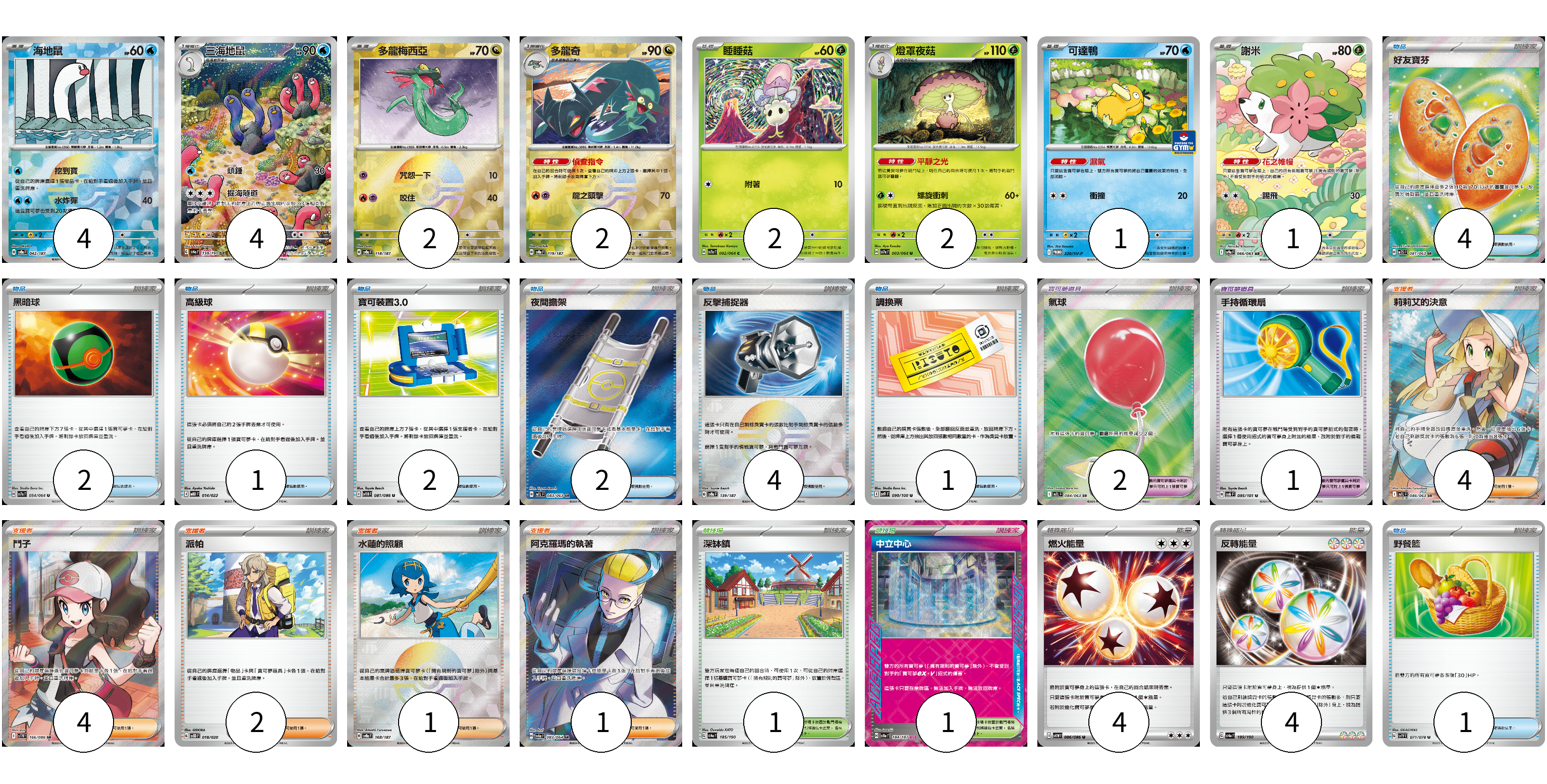 牌組構築方案 以此牌組為基礎新構築牌組 顯示卡面 顯示列表 寶可夢卡(18) 4 4 2 2 2 2 1 1 寶可夢道具(3) 2 1 物品卡(17) 4 2 1 2 2 4 1 1 支援者卡(12) 4 4 2 1 1 競技場卡(2) 1 1 能量卡(8) 4 4 寶可夢卡(18) 卡牌名稱 張數 卡牌名稱 張數 海地鼠 SV8a 042/187 04 三海地鼠 SV4a 338/190 04 多龍梅西亞 SV8a 118/187 02 多龍奇 SV8a 119/187 02 睡睡菇 SV7a 002/064 02 燈罩夜菇 SV7a 003/064 02 可達鴨 SV-P 220/SV-P 01 謝米 SV9a 066/063 01 寶可夢道具(3) 卡牌名稱 張數 卡牌名稱 張數 氣球 M1L 084/063 02 手持循環扇 SV6 095/101 01 物品卡(17) 卡牌名稱 張數 卡牌名稱 張數 好友寶芬 M1S 081/063 04 黑暗球 SV7a 054/064 02 高級球 MBD 014/022 01 寶可裝置3.0 SV11B 081/086 02 夜間擔架 M1L 083/063 02 反擊捕捉器 SV8a 139/187 04 調換票 SV9 090/100 01 野餐籃 SV1V 071/078 01 支援者卡(12) 卡牌名稱 張數 卡牌名稱 張數 莉莉艾的決意 M1L 086/063 04 鬥子 SV11W 166/086 04 派帕 SVOD 018/020 02 水蓮的照顧 SV8a 168/187 01 阿克羅瑪的執著 SV6a 083/064 01 競技場卡(2) 卡牌名稱 張數 卡牌名稱 張數 深缽鎮 SV4a 185/190 01 中立中心 SV8a 184/187 01 能量卡(8) 卡牌名稱 張數 卡牌名稱 張數 燃火能量 SV11W 086/086 04 反轉能量 SV4a 189/190 04 以此牌組為基礎新構築牌組 牌組編碼 rffOND-ssKAEr-OCUyfL copy 列印牌組單 牌組編碼已複製 分享至SNS