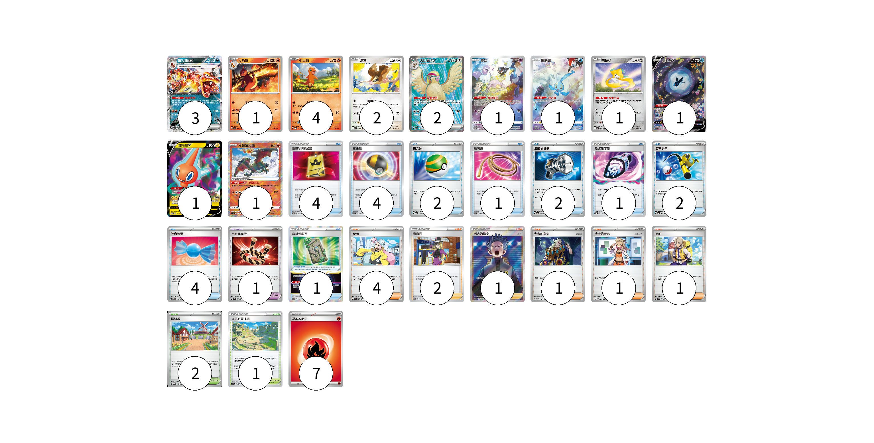 牌組構築方案 以此牌組為基礎新構築牌組 顯示卡面 顯示列表 寶可夢卡(18) 3 1 4 2 2 1 1 1 1 1 1 寶可夢道具(2) 1 1 物品卡(20) 4 4 2 1 2 1 2 4 支援者卡(10) 4 2 1 1 1 1 競技場卡(3) 2 1 能量卡(7) 7 寶可夢卡(18) 卡牌名稱 張數 卡牌名稱 張數 噴火龍ex SV3 066/108 03 火恐龍 SV2a 005/165 01 小火龍 SV2a 004/165 04 波波 SV2a 016/165 02 大比鳥ex SV3 128/108 02 夢幻 S12a 183/172 01 瑪納霏 S12a 178/172 01 基拉祈 SV3a 042/062 01 霓虹魚V S12a 216/172 01 洛托姆V S11 037/100 01 光輝噴火龍 S12a 015/172 01 寶可夢道具(2) 卡牌名稱 張數 卡牌名稱 張數 不服輸頭帶 SV1S 073/078 01 森林封印石 S12 092/098 01 物品卡(20) 卡牌名稱 張數 卡牌名稱 張數 對戰VIP參加證 S8 091/100 04 高級球 SI 375/414 04 巢穴球 SV1S 070/078 02 離洞繩 S7D 056/067 01 反擊捕捉器 SV4M 059/066 02 放逐吸塵器 S12a 144/172 01 厲害釣竿 SV2P 066/071 02 神奇糖果 SVAL 014/021 04 支援者卡(10) 卡牌名稱 張數 卡牌名稱 張數 奇樹 SV2D 069/071 04 賽寶利 S5a 068/070 02 老大的指令(赤日) S12a 250/172 01 老大的指令 SVEL 019/020 01 博士的研究 SVEL 018/020 01 派帕 SV1V 076/078 01 競技場卡(3) 卡牌名稱 張數 卡牌名稱 張數 深缽鎮 SV1a 070/073 02 崩塌的競技場 S12a 167/172 01 能量卡(7) 卡牌名稱 張數 卡牌名稱 張數 基本火能量 sv-p FIR 07 以此牌組為基礎新構築牌組 牌組編碼 rgupho-PiwyDm-BMwGZY copy 列印牌組單 牌組編碼已複製 分享至SNS
